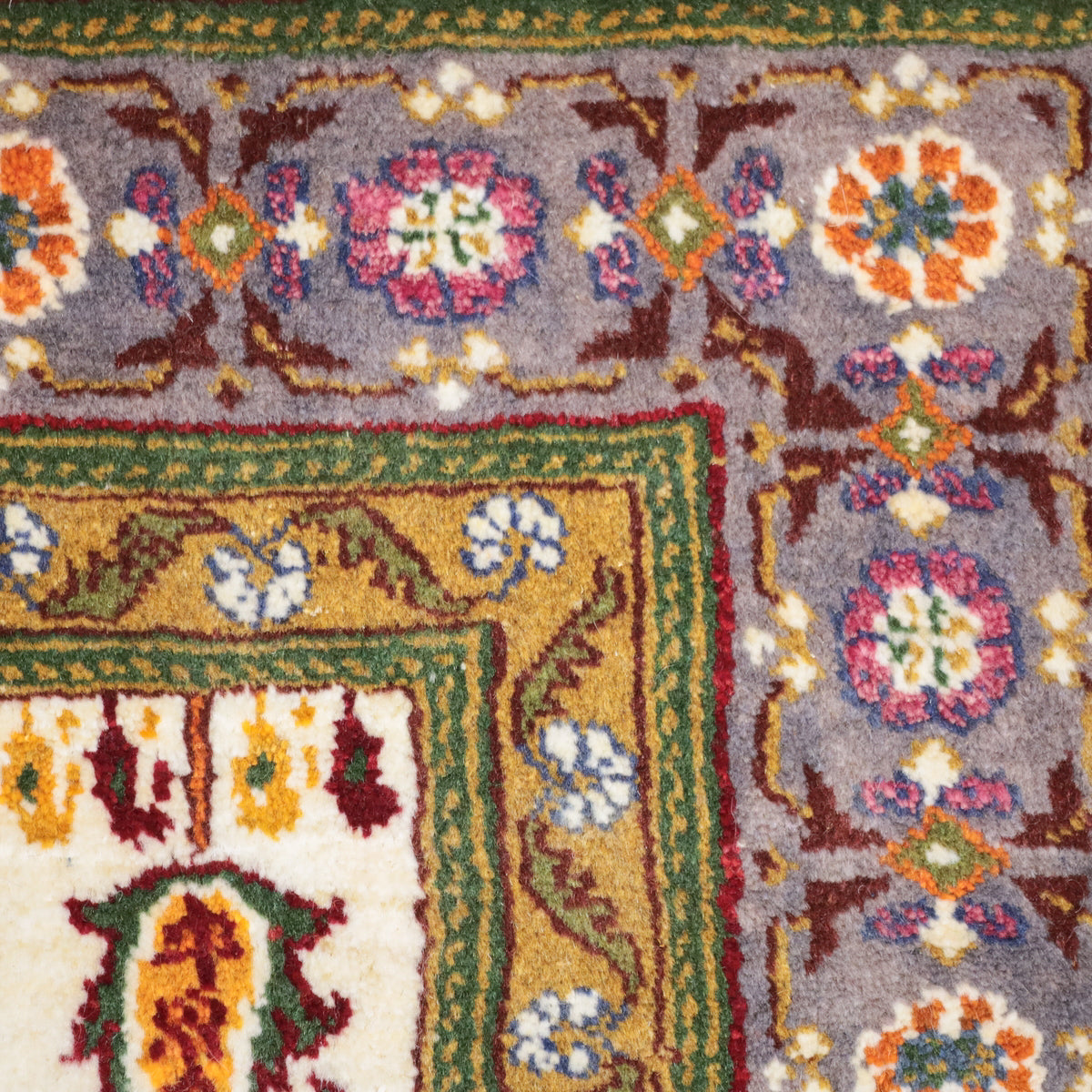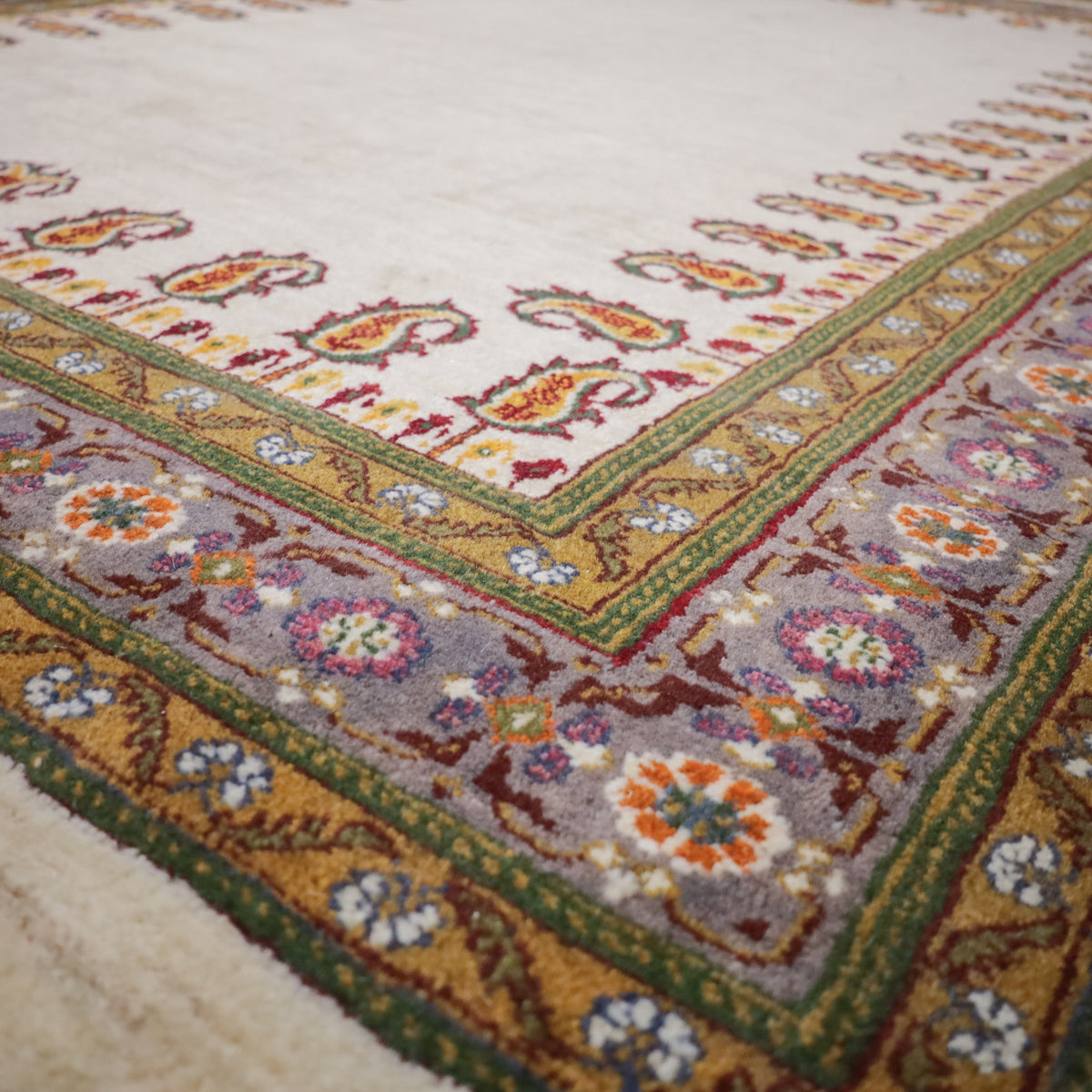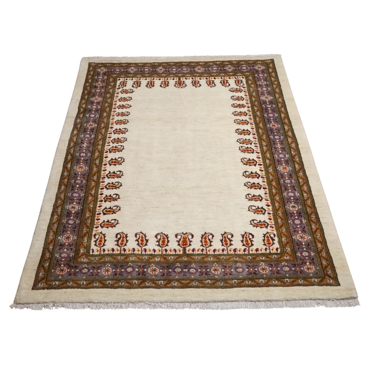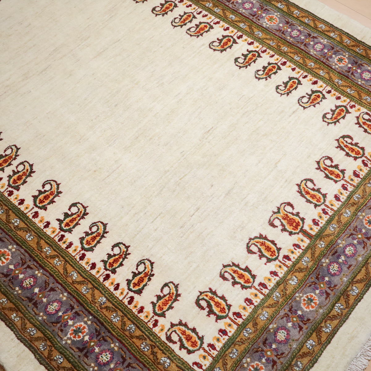 羊の毛色を生かした生成の背景に、繊細に描かれたボテ(ペイズリー)モチーフが印象的なギャッベです。外側のフレームには、紫がかったグレーの背景に魔除けのオオカミの足跡が描かれ、全体に伝統的モチーフの持つ上品さと落ち着きを感じさせます。お部屋に優雅な彩りをもたらす一枚です。