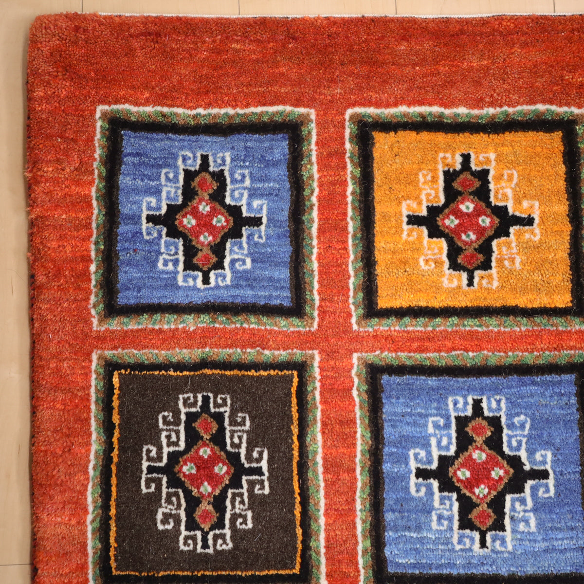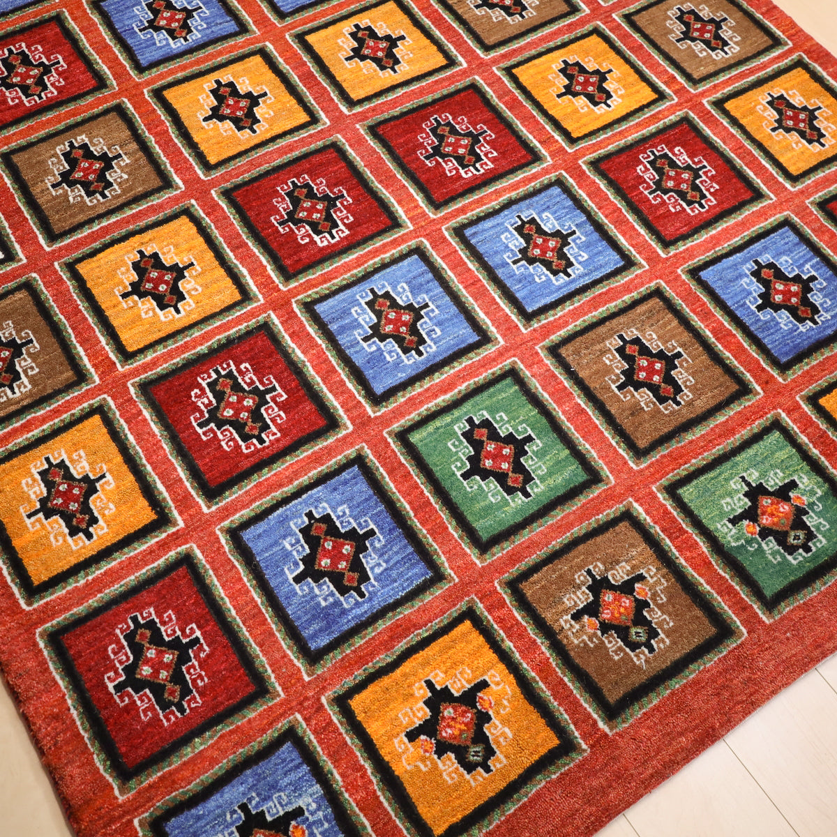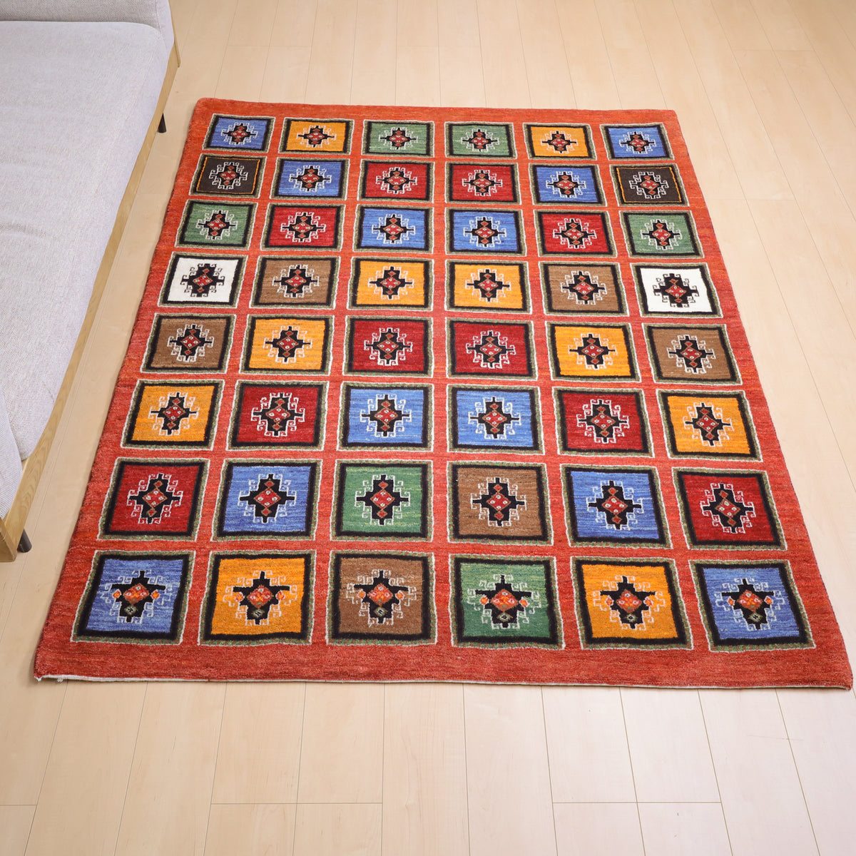 シックなレンガ色をベースに魔よけのカギ足デザインを入れた四角が丁寧に並んだ多色使い。歪みの少ない直線のラインや、四角の縁が二色で囲んで濃い色で引き締めるなど細部まで作り込まれた織子さんの腕の良さが際立つお品。どの色も自然を感じさせるような落ち着きのある色なので、お部屋のポイントとなるようなモダンなラグとしてお使いいただけます。