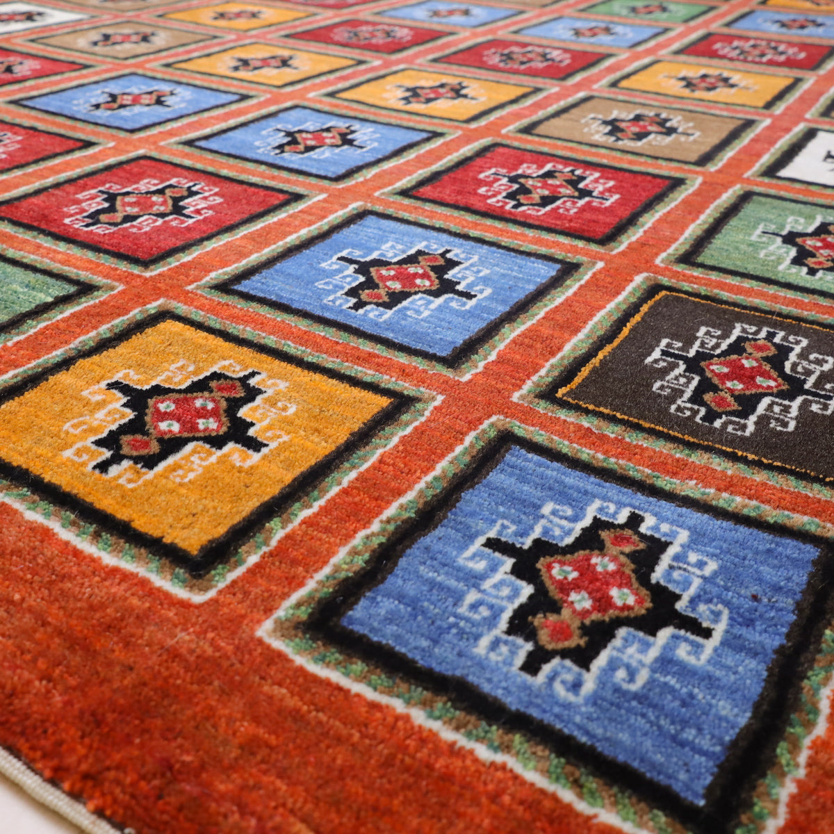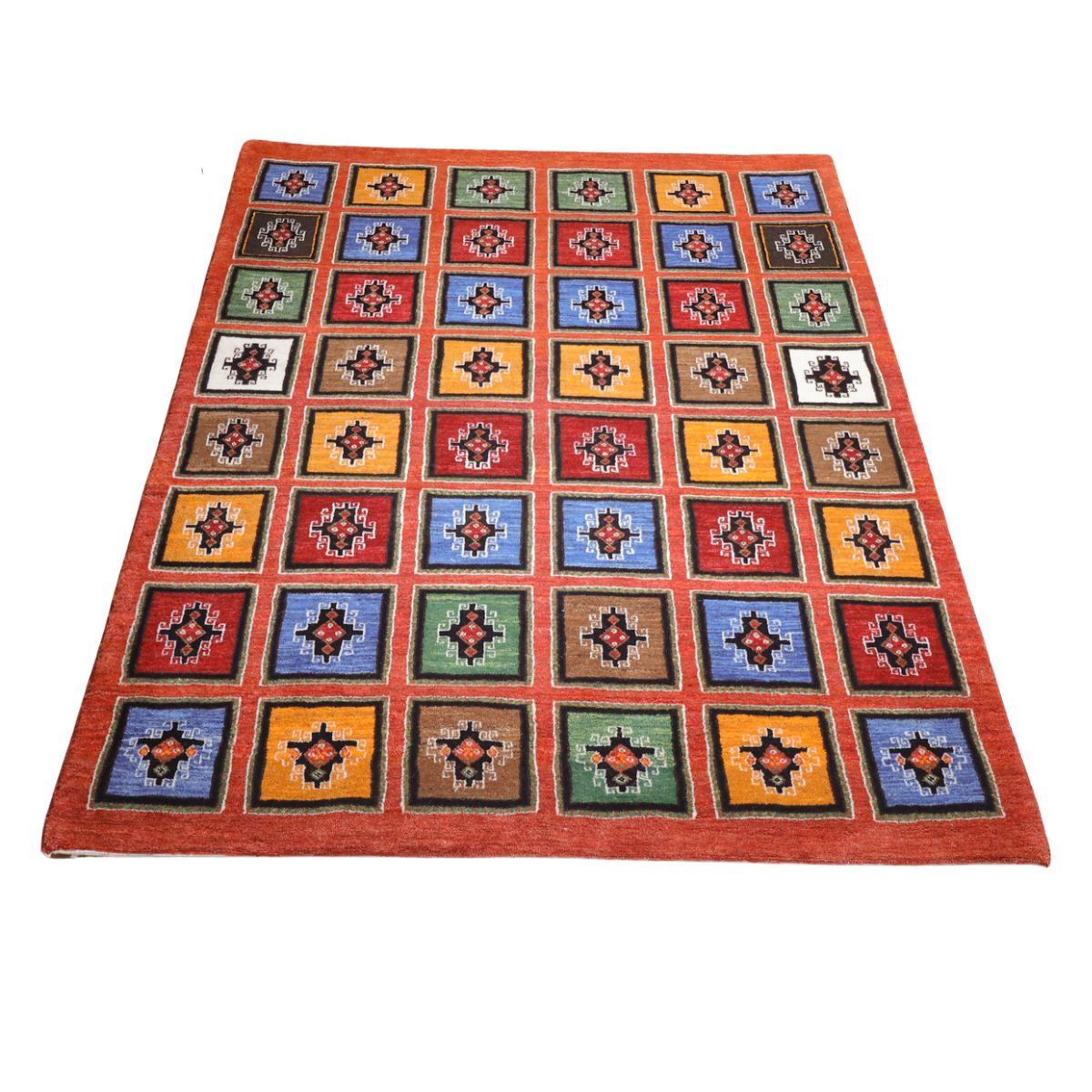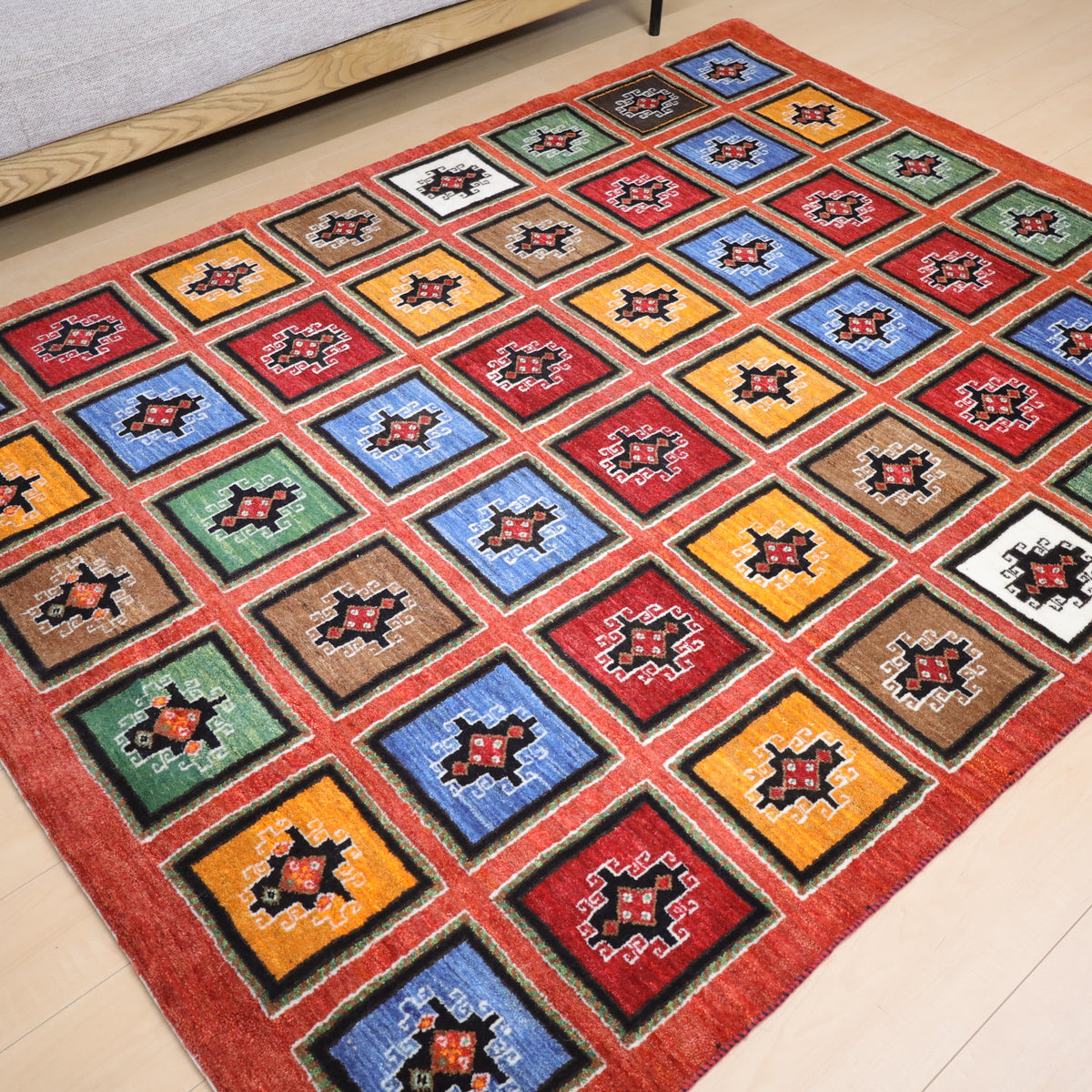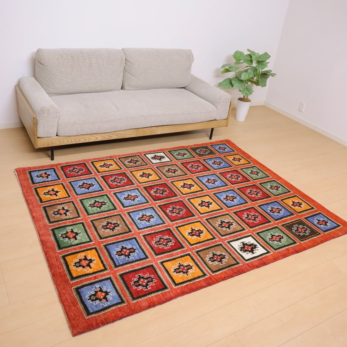 シックなレンガ色をベースに魔よけのカギ足デザインを入れた四角が丁寧に並んだ多色使い。歪みの少ない直線のラインや、四角の縁が二色で囲んで濃い色で引き締めるなど細部まで作り込まれた織子さんの腕の良さが際立つお品。どの色も自然を感じさせるような落ち着きのある色なので、お部屋のポイントとなるようなモダンなラグとしてお使いいただけます。