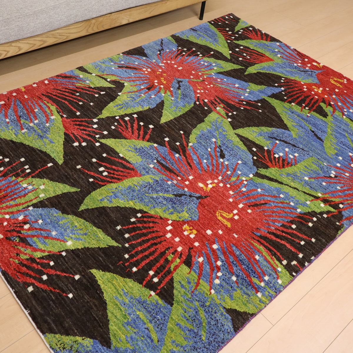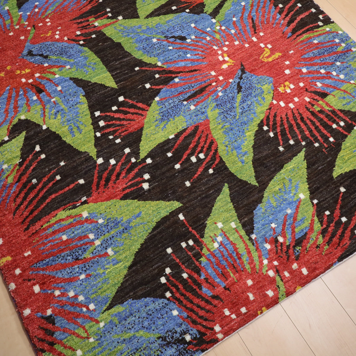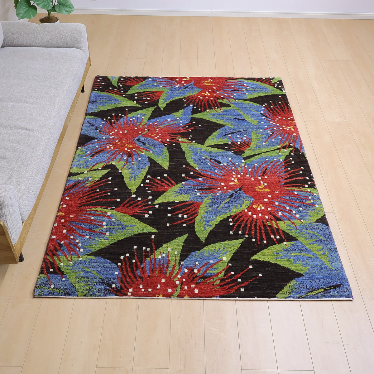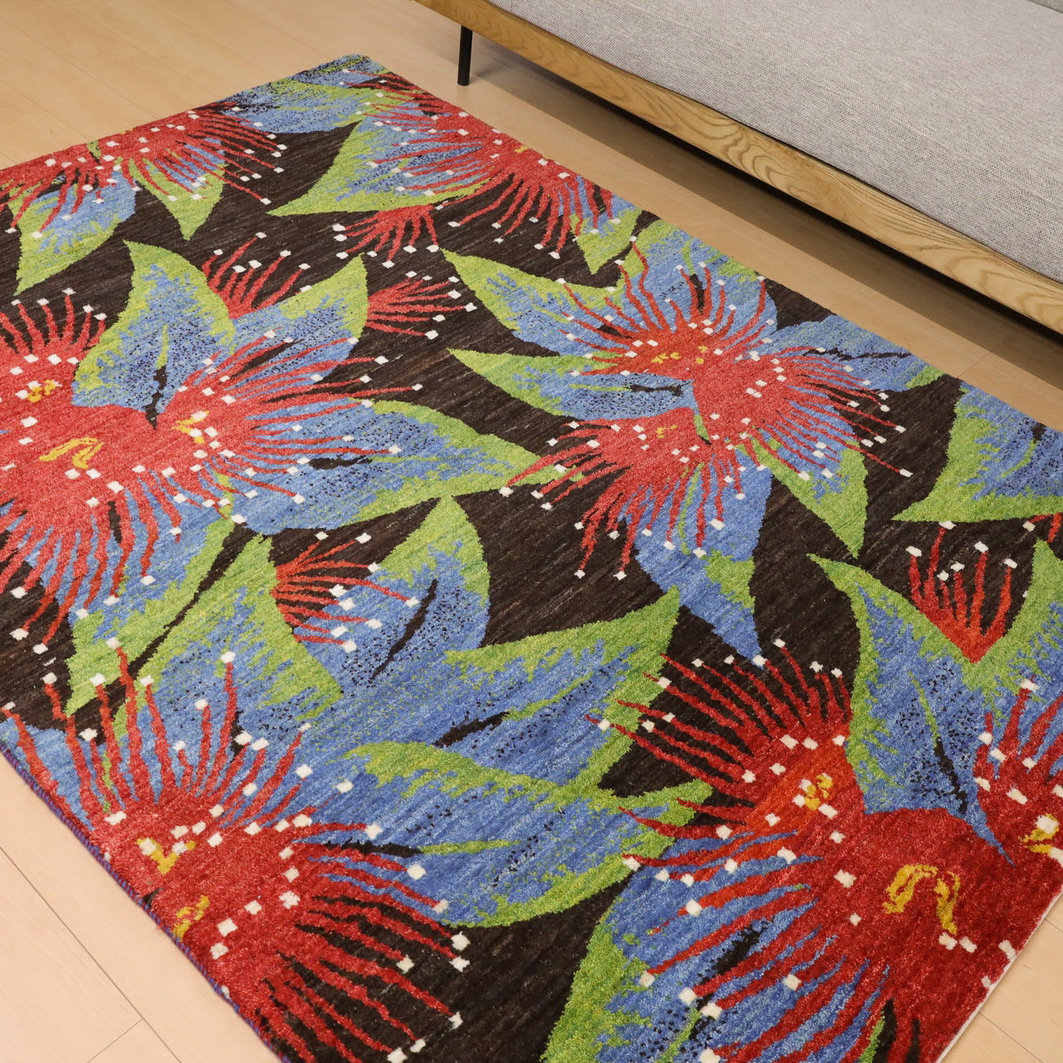 こげ茶色の背景に大きくスパークするような百合の花。青と緑と赤の取り合わせ、モダンなアート作品を飾るようにお部屋に敷いてインテリアに個性を加えるような使い方がおすすめです。見る人に力強いエネルギーと躍動感を感じさせながらも、手織りの温かみや天然のウール素材の素朴さ心地よい存在感のある品です。