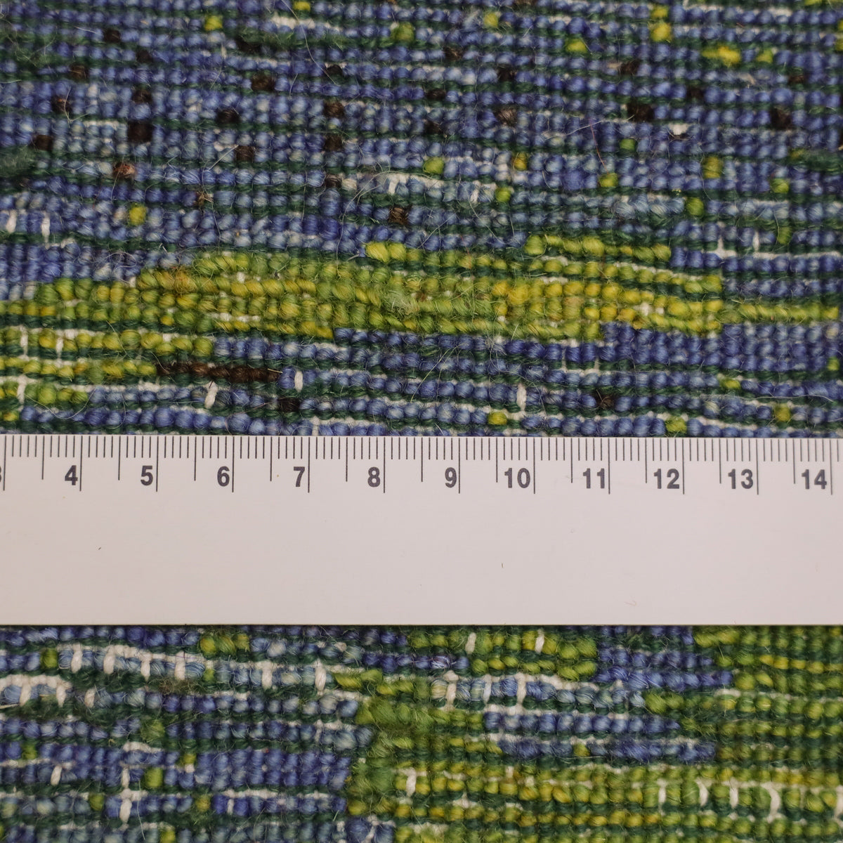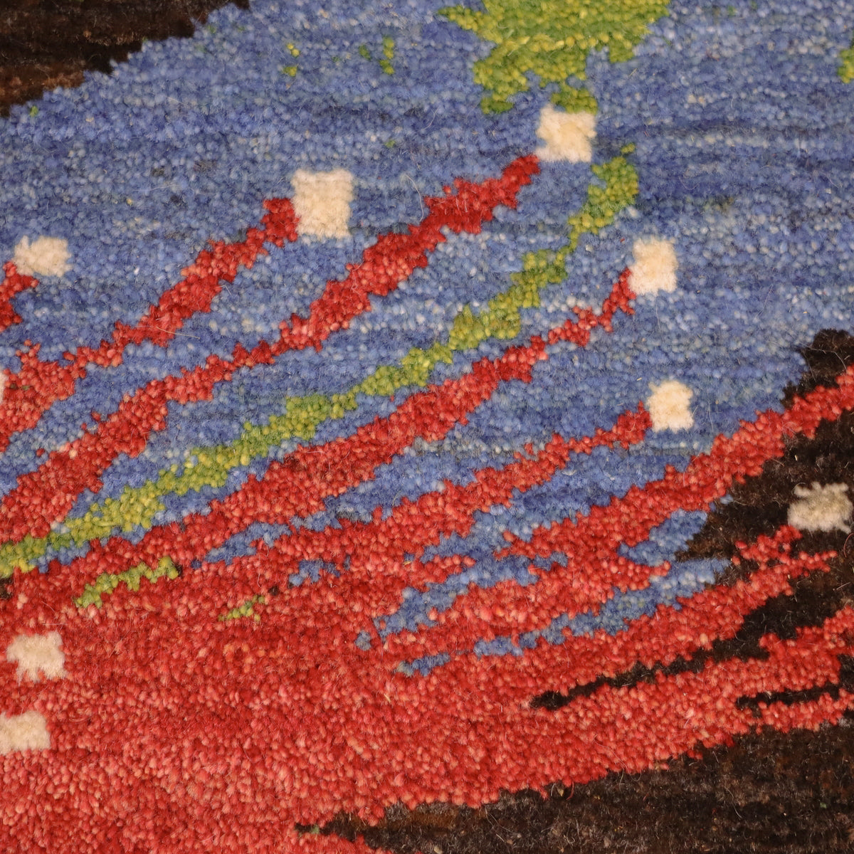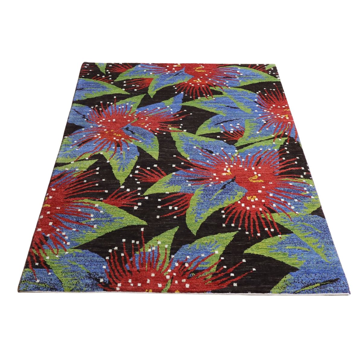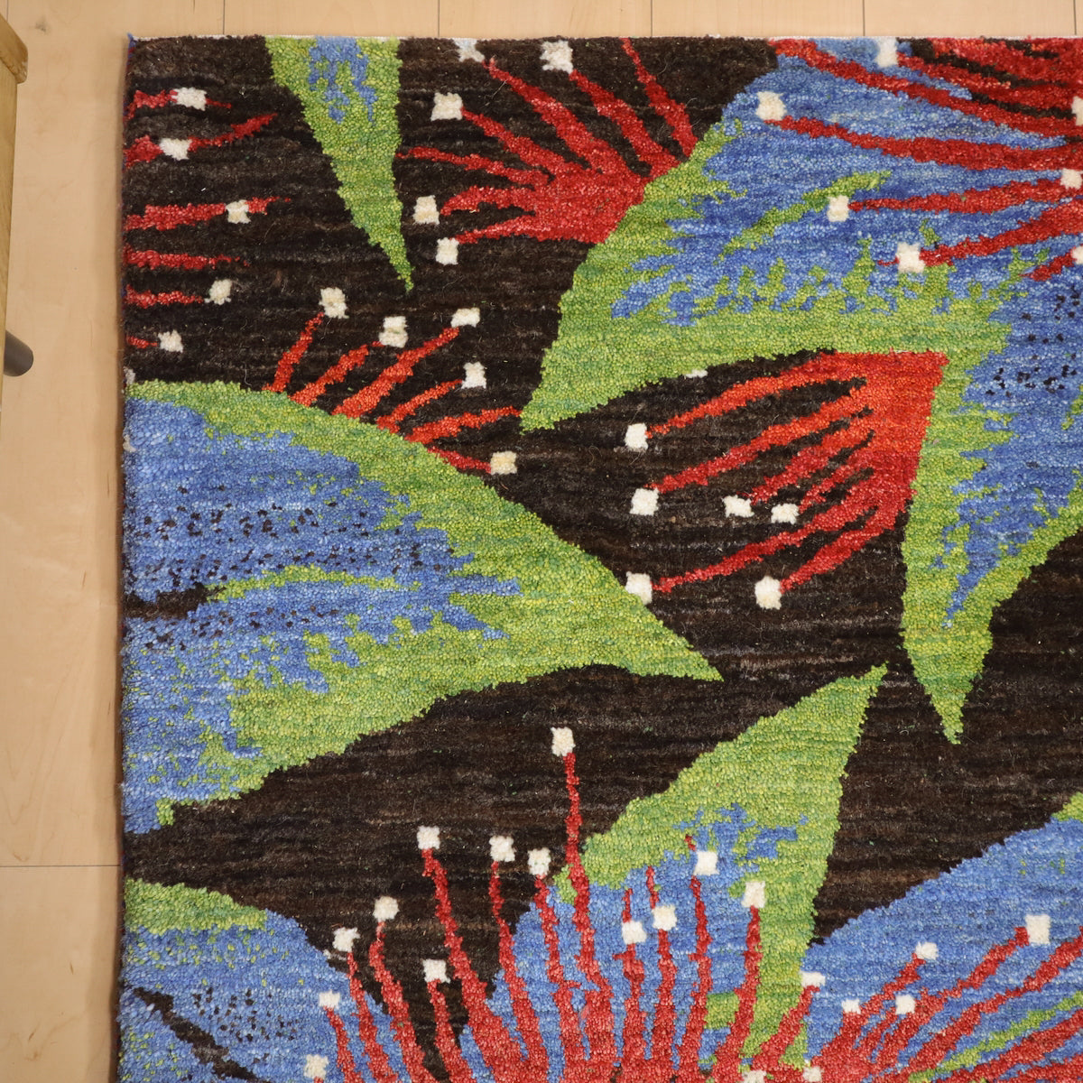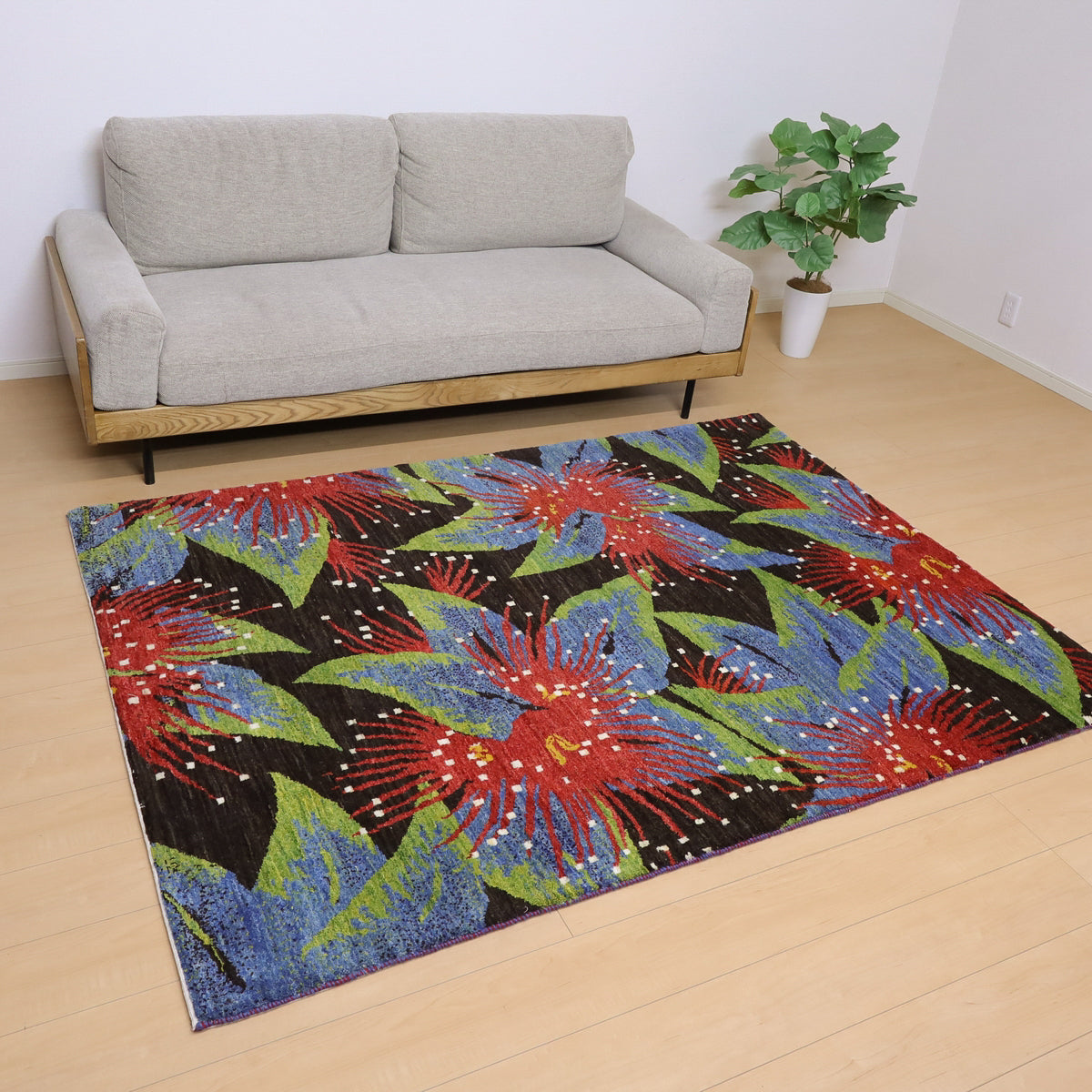 こげ茶色の背景に大きくスパークするような百合の花。青と緑と赤の取り合わせ、モダンなアート作品を飾るようにお部屋に敷いてインテリアに個性を加えるような使い方がおすすめです。見る人に力強いエネルギーと躍動感を感じさせながらも、手織りの温かみや天然のウール素材の素朴さ心地よい存在感のある品です。
