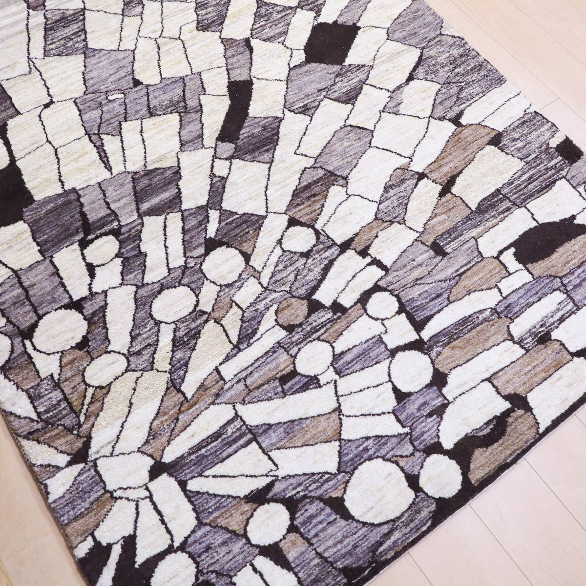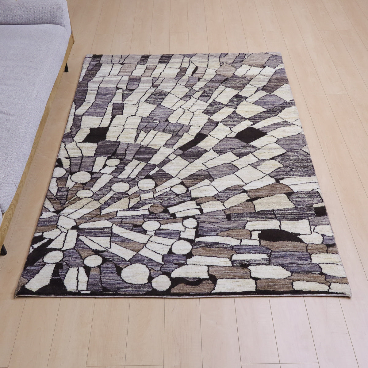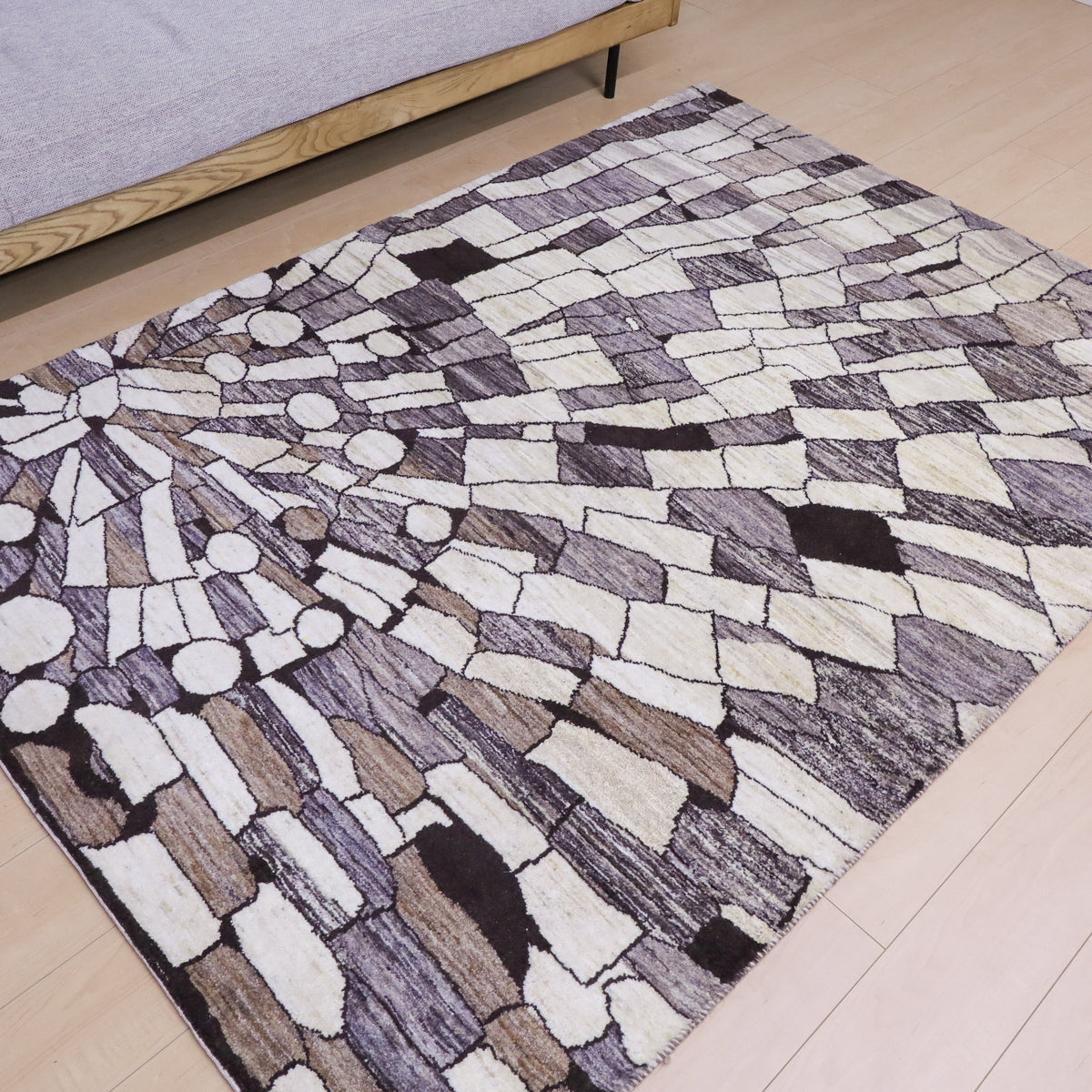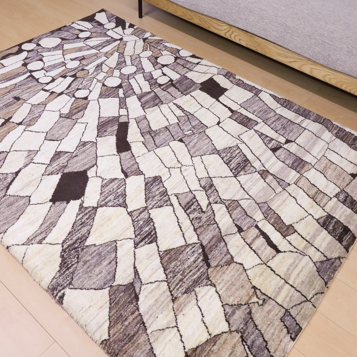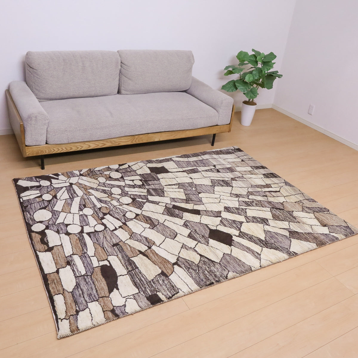 茶やグレー、ベージュ、生成りなどの、石畳を思わせるランダムな模様が印象的。全ての色は羊の毛色をそのまま活かした無染色の羊毛を使用して、天然素材の雰囲気が大きく感じられます。個性的なデザインでありながら、さりげない上品さも感じられる、敷く場所を選ばず使えるギャッベです。