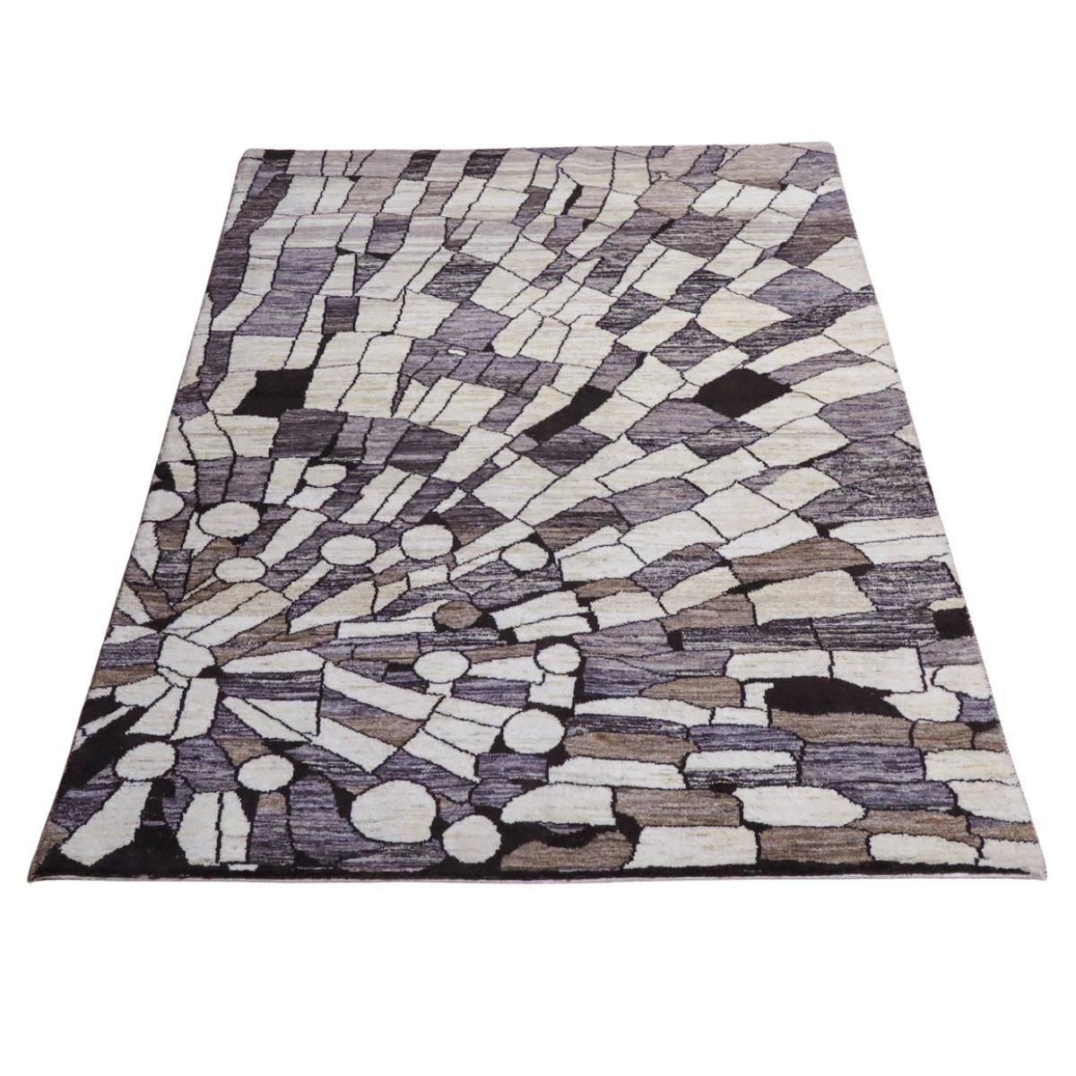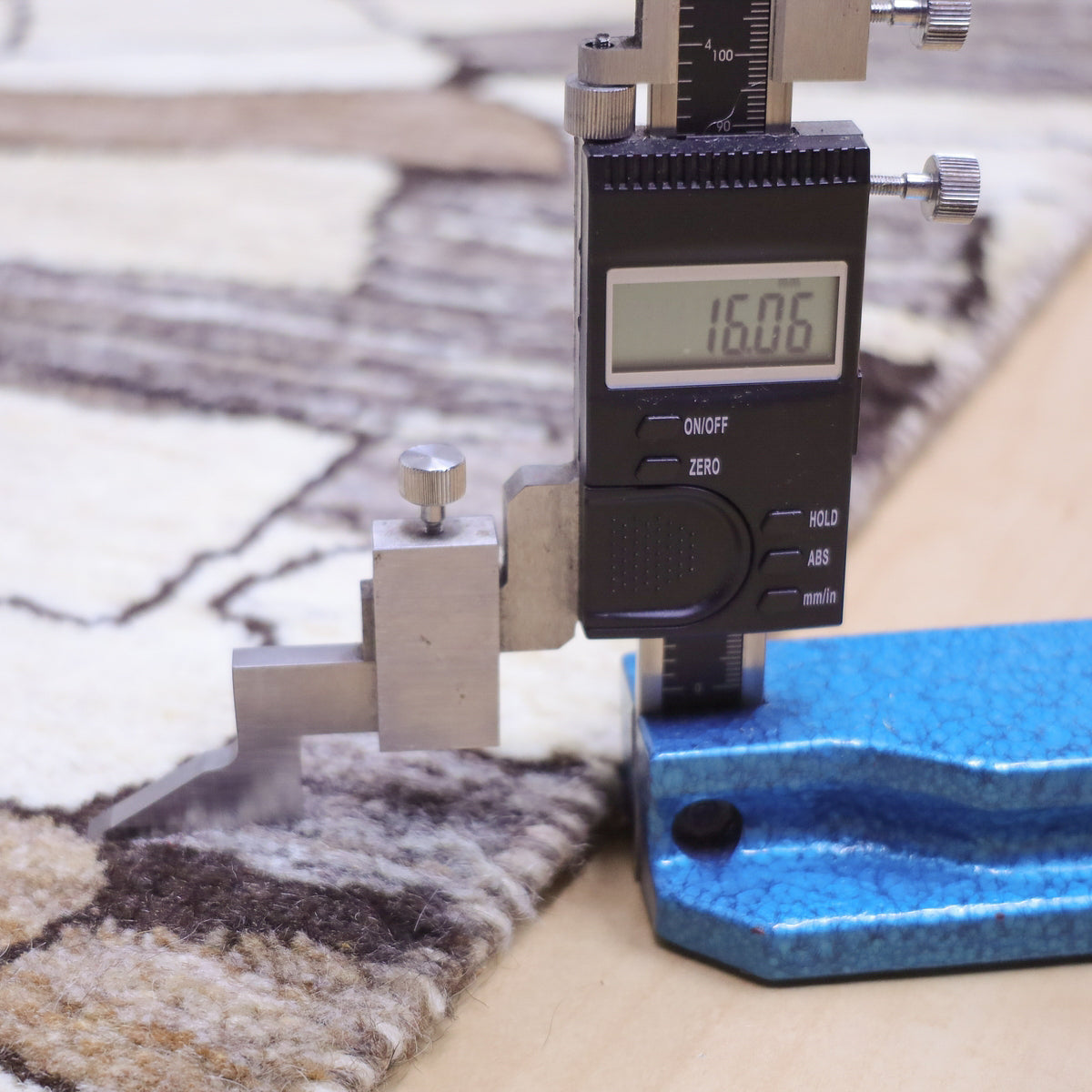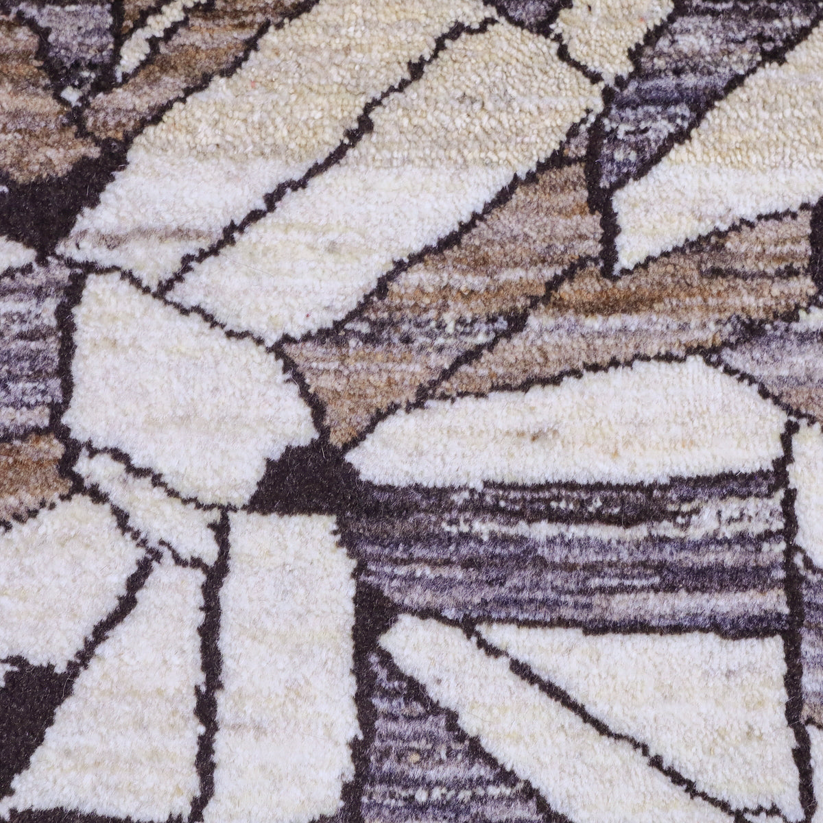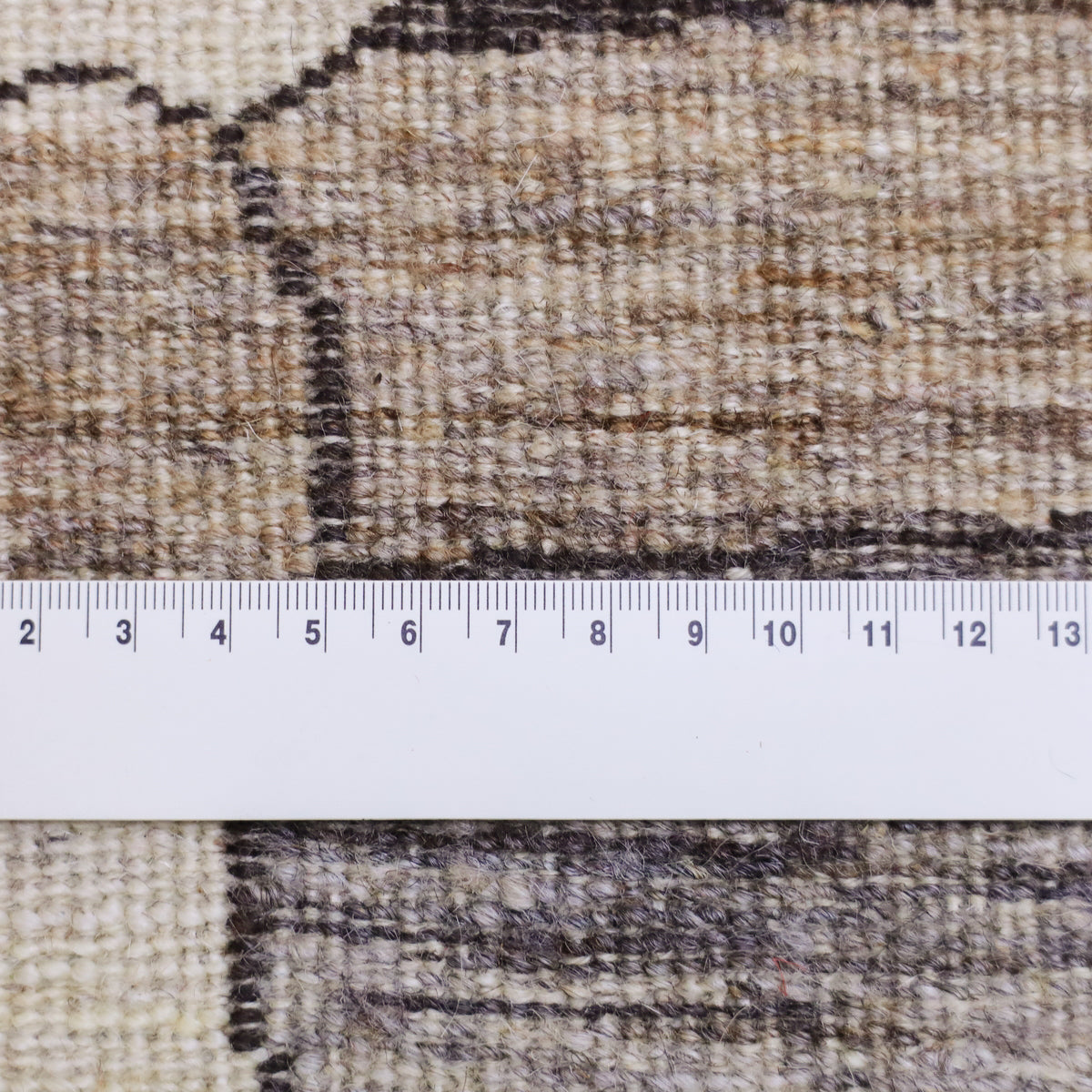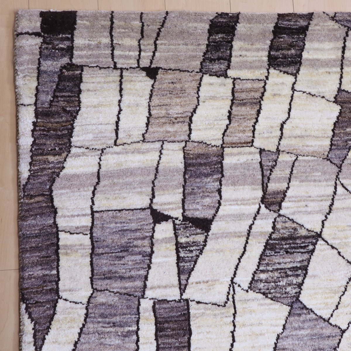 茶やグレー、ベージュ、生成りなどの、石畳を思わせるランダムな模様が印象的。全ての色は羊の毛色をそのまま活かした無染色の羊毛を使用して、天然素材の雰囲気が大きく感じられます。個性的なデザインでありながら、さりげない上品さも感じられる、敷く場所を選ばず使えるギャッベです。