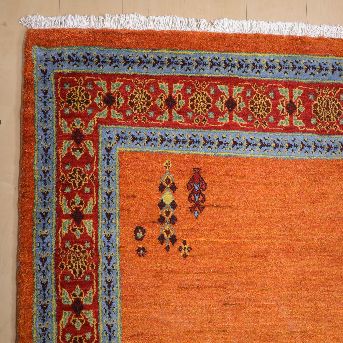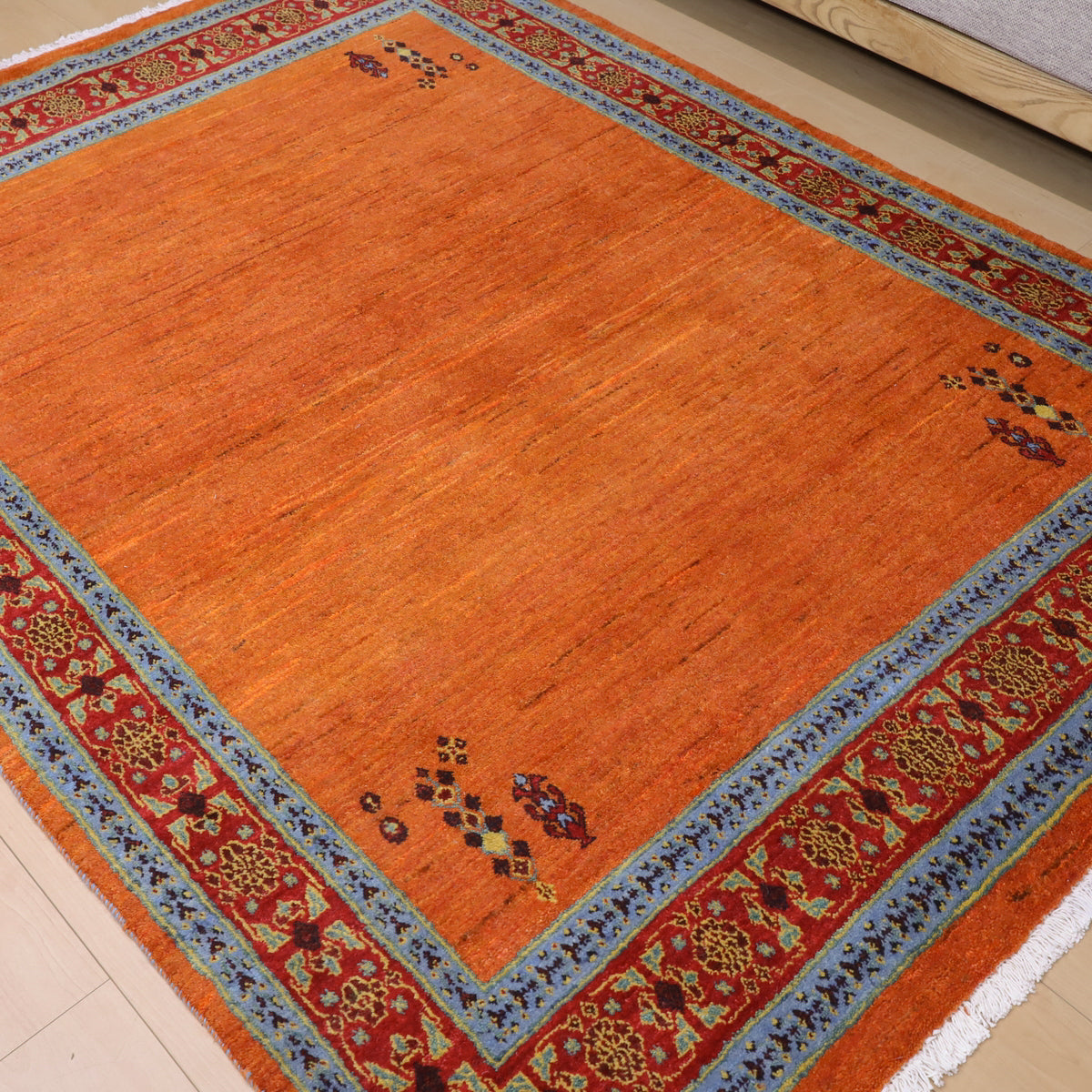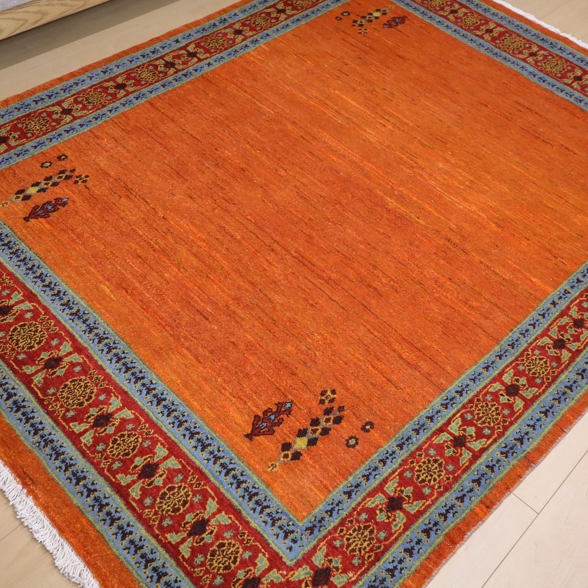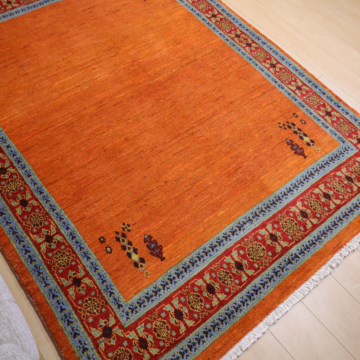 くっきり鮮やかなオレンジ色がフルーツのようなビタミンカラー。細かな濃淡のアブラシ(色のグラデーション)が全体にこまかく入って、イランのギャッベならではの美しい色合いを楽しめます。シアンブルーと赤を基調にした伝統的な文様の外枠は落ち着いた上品な印象に、四隅の植物柄が優しさを感じさせるアクセントとなっています。丁寧な作りでお部屋に温かみと上品さをもたらしてくれるギャッベです。
