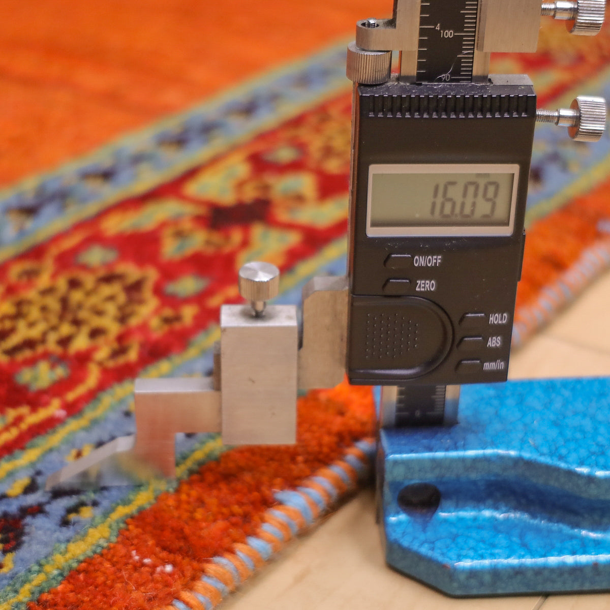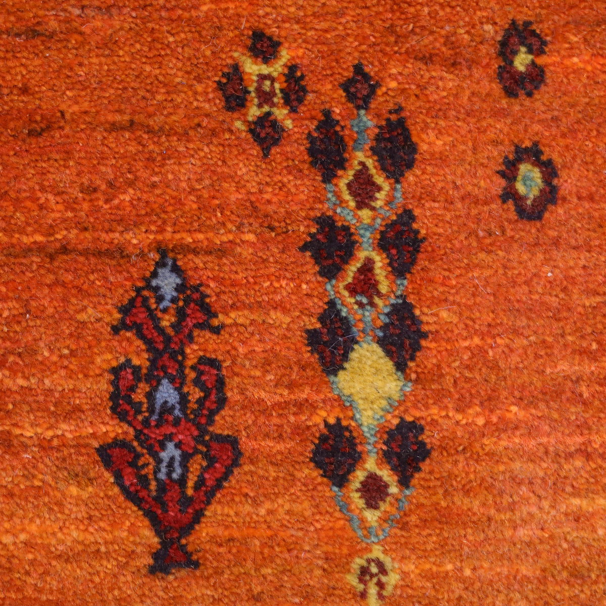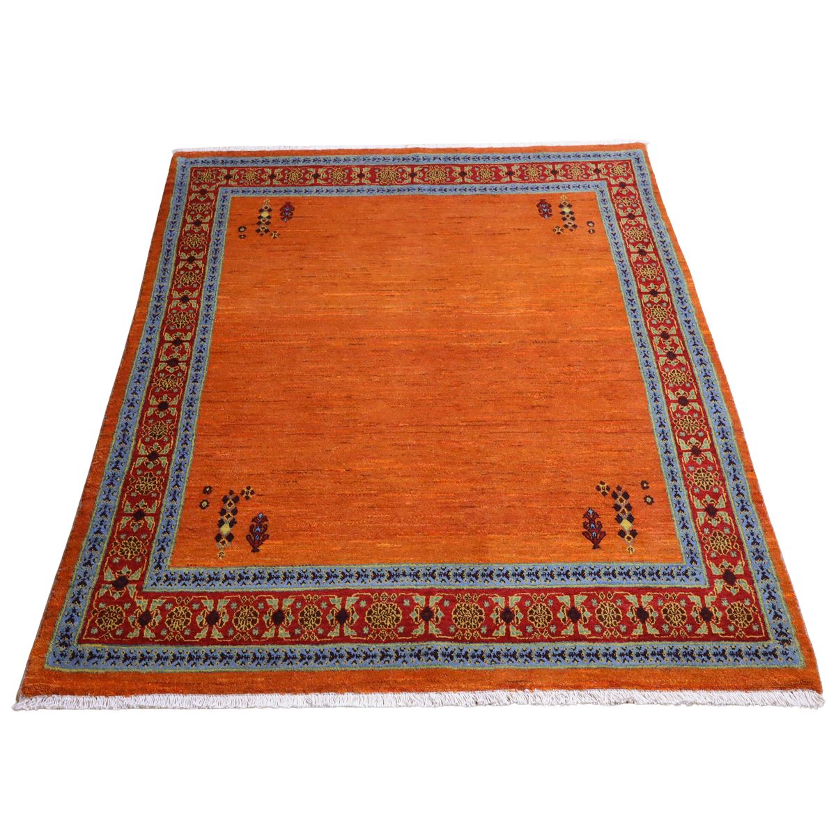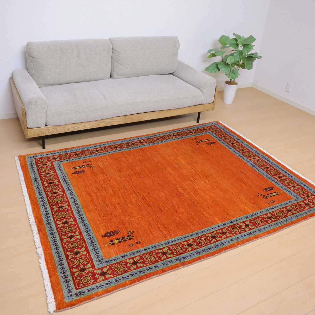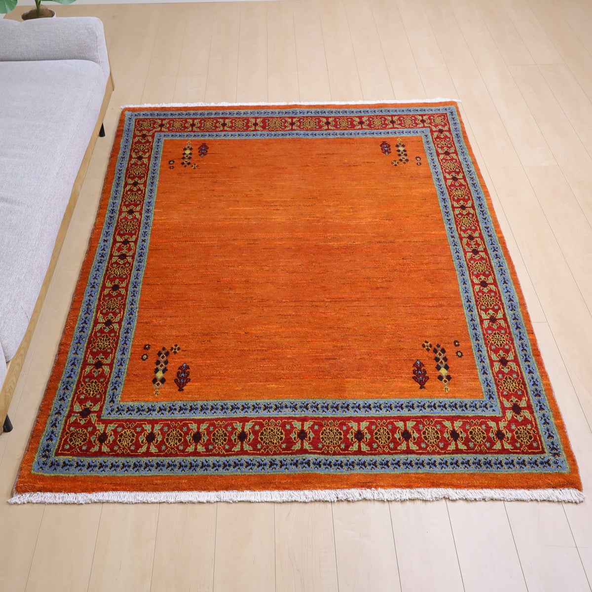 くっきり鮮やかなオレンジ色がフルーツのようなビタミンカラー。細かな濃淡のアブラシ(色のグラデーション)が全体にこまかく入って、イランのギャッベならではの美しい色合いを楽しめます。シアンブルーと赤を基調にした伝統的な文様の外枠は落ち着いた上品な印象に、四隅の植物柄が優しさを感じさせるアクセントとなっています。丁寧な作りでお部屋に温かみと上品さをもたらしてくれるギャッベです。