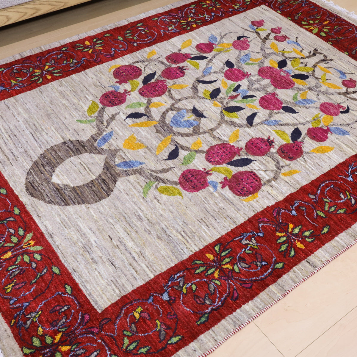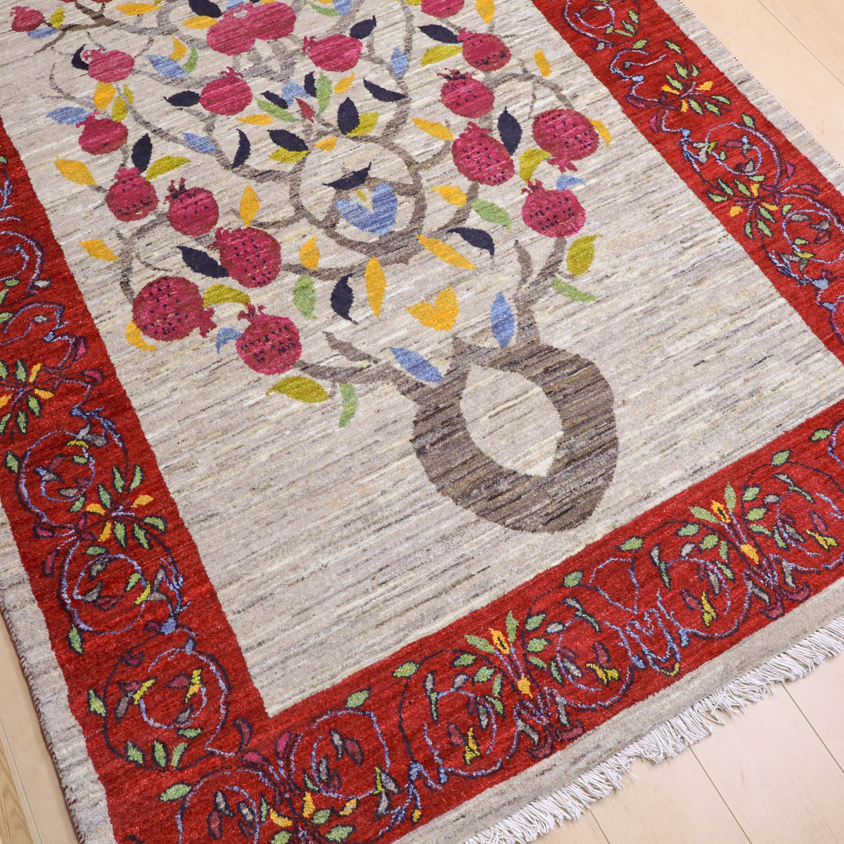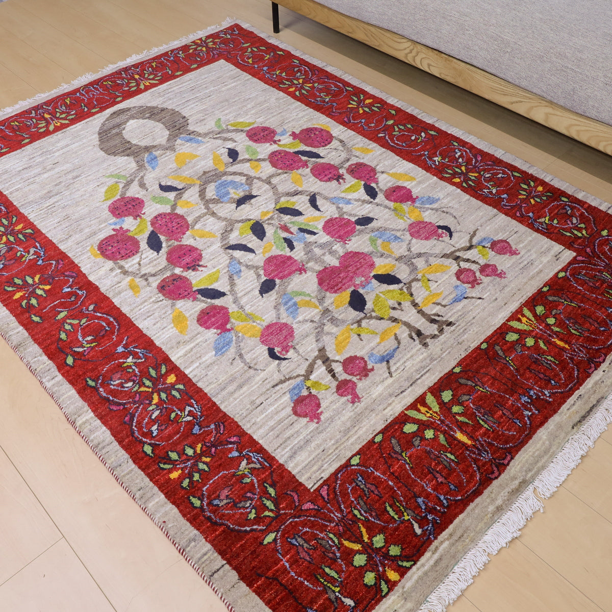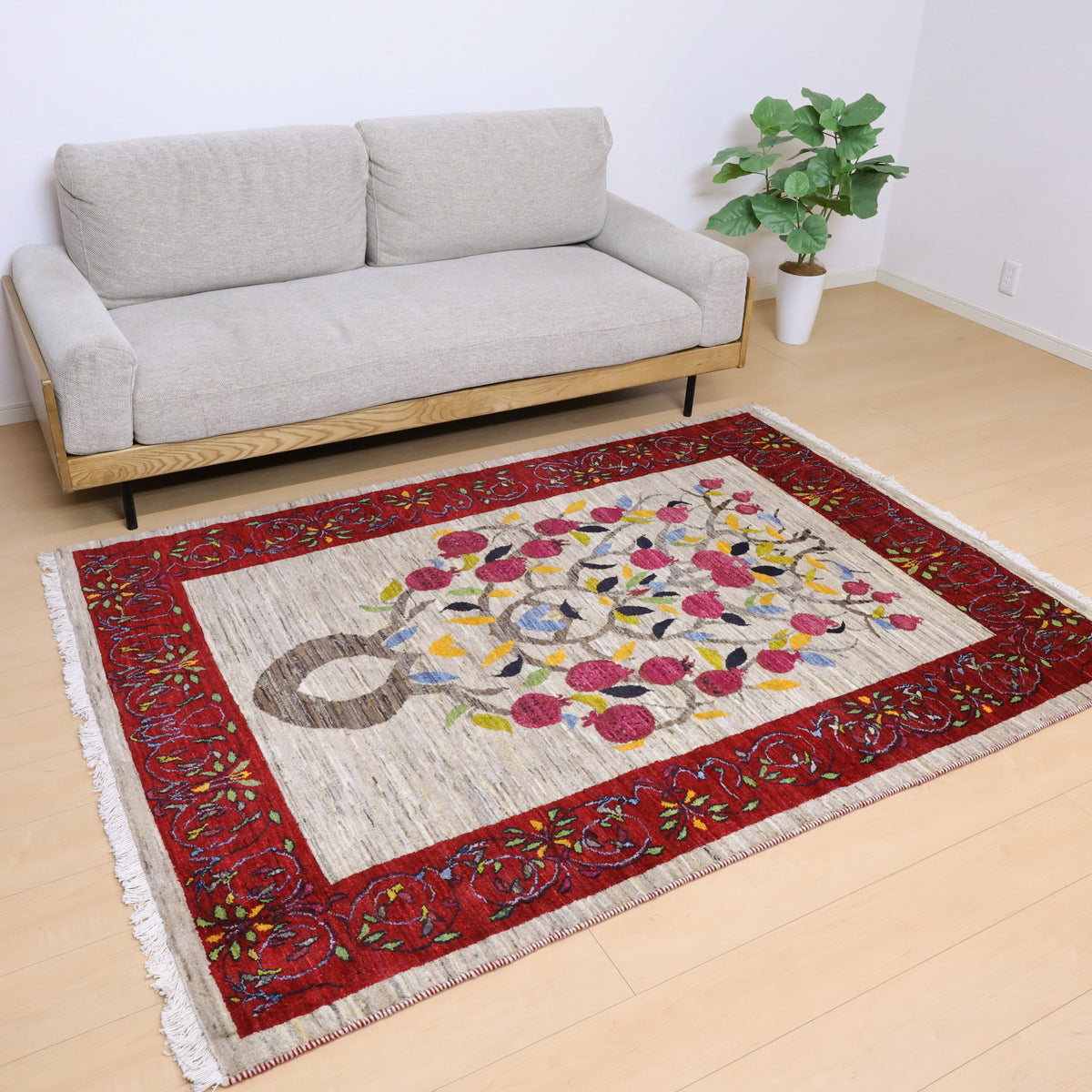 地色のグレーベージュは、羊の毛色をそのまま活かした無染色の羊毛を使用していてナチュラルな風合い。周囲は温かみのある赤色のフレーム、濃いめの赤でしゅっと引き締まった印象でもあります。センターにはザクロの大きな生命の木が活き活きと。曲線のフォルムがにっこり笑うような柔和なイメージにデザインされているので、アート作品のように敷いて楽しめます。