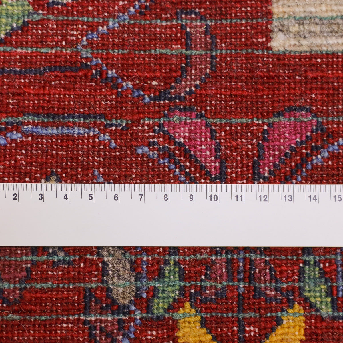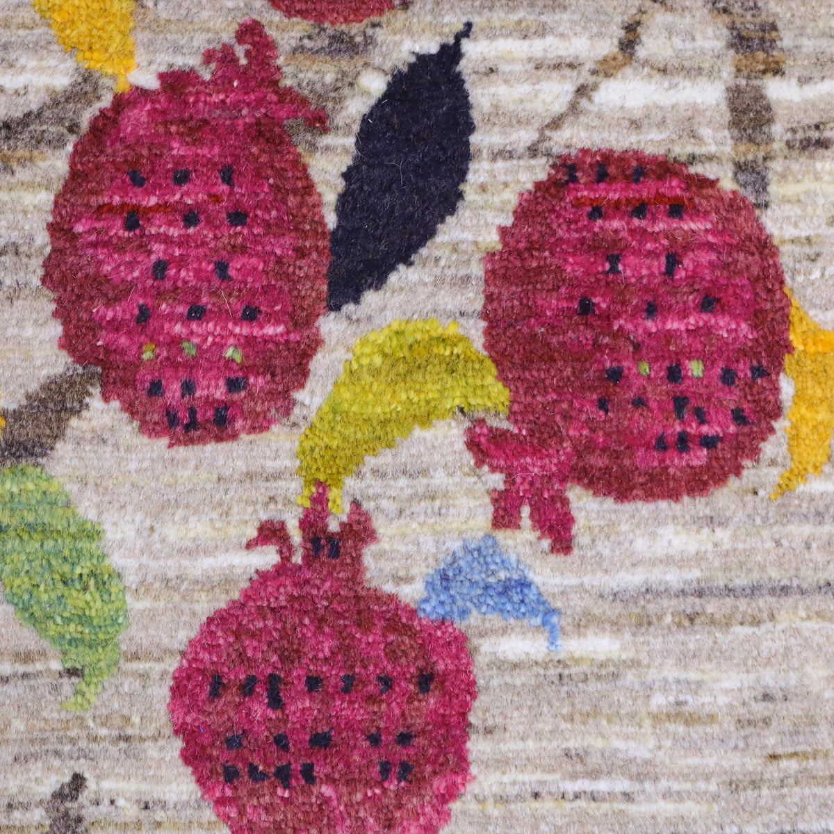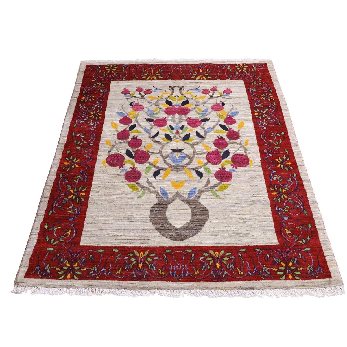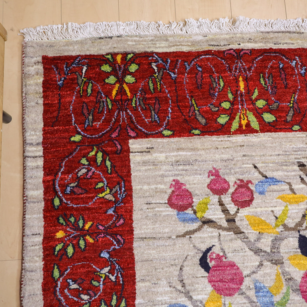 地色のグレーベージュは、羊の毛色をそのまま活かした無染色の羊毛を使用していてナチュラルな風合い。周囲は温かみのある赤色のフレーム、濃いめの赤でしゅっと引き締まった印象でもあります。センターにはザクロの大きな生命の木が活き活きと。曲線のフォルムがにっこり笑うような柔和なイメージにデザインされているので、アート作品のように敷いて楽しめます。