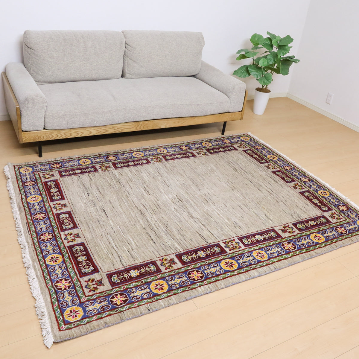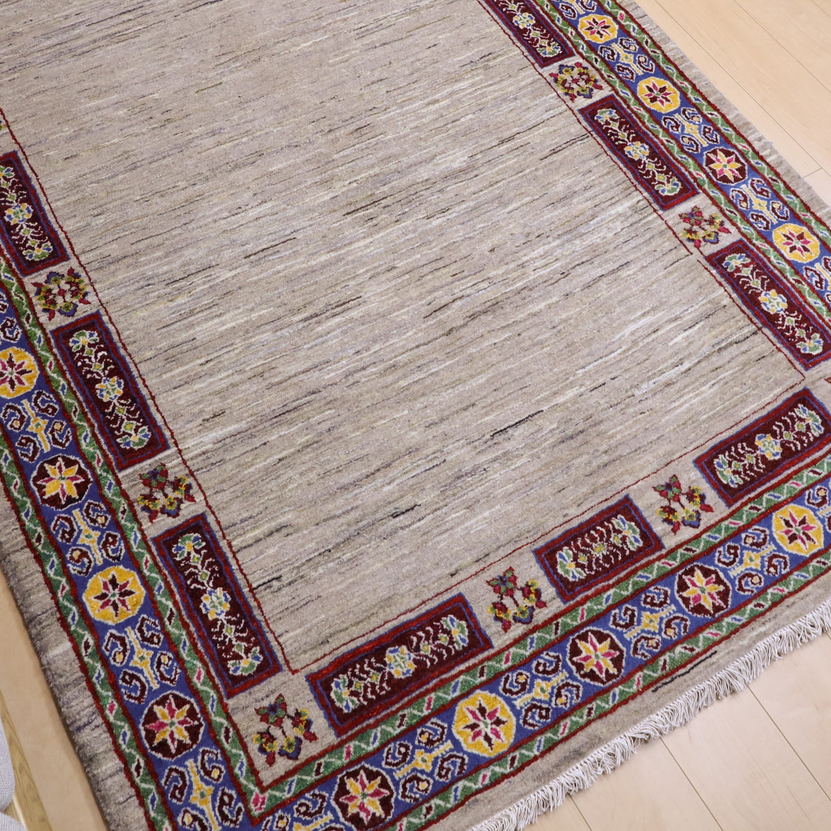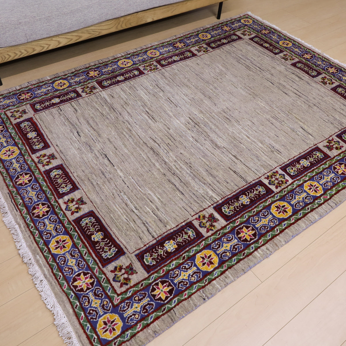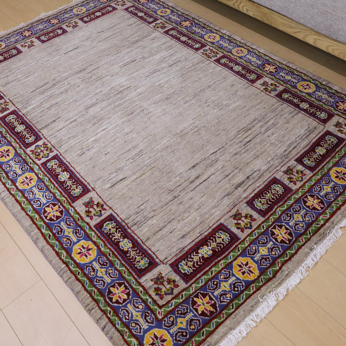 地色は薄いグレーベージュで、羊の毛色をそのまま活かした無染色の羊毛を使用しています。細かなアブラシ(色のグラデーション)が全体に入って、イランのギャッベならではの美しい色の揺らぎを楽しめます。周囲を囲むルリバフの伝統柄は、濃いえんじと青基調のシックな配色で丁寧に織り込まれ、生成りの地色と相まって、上品さが際立ちます。どの方向から見ても美しく見え、センターテーブルを置いてもおさまりの良い使いやすいデザインです。
