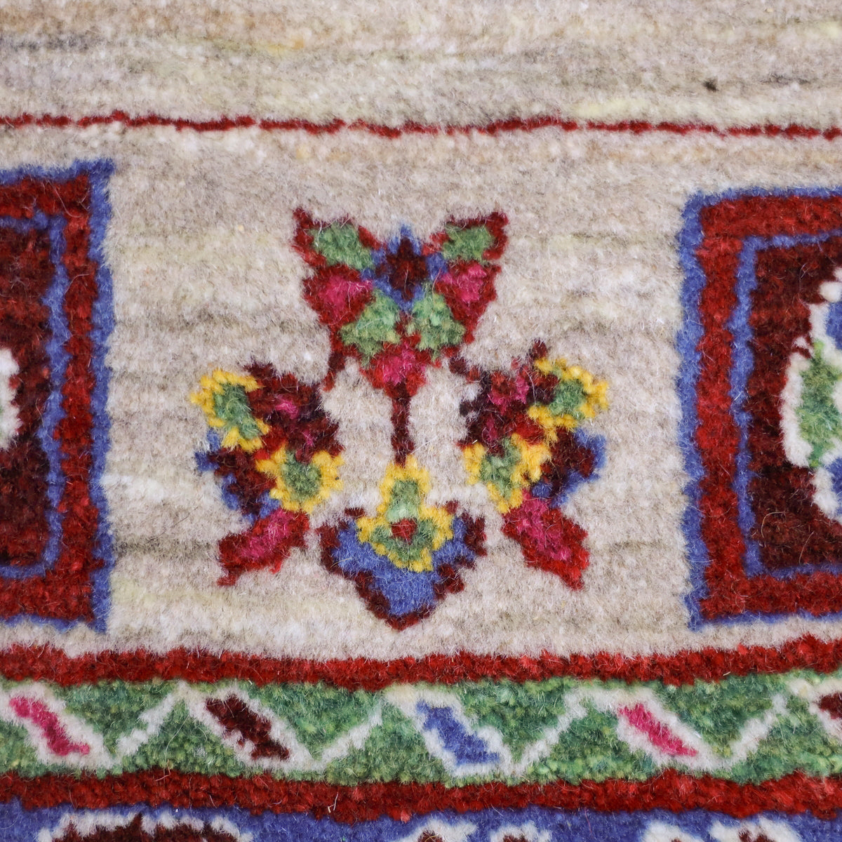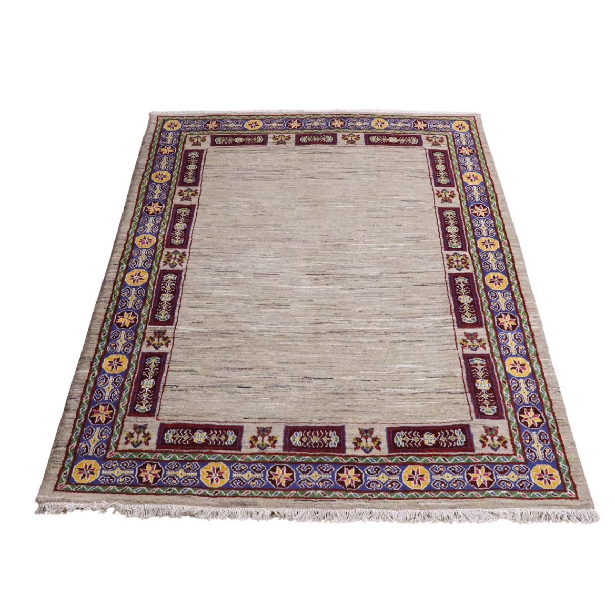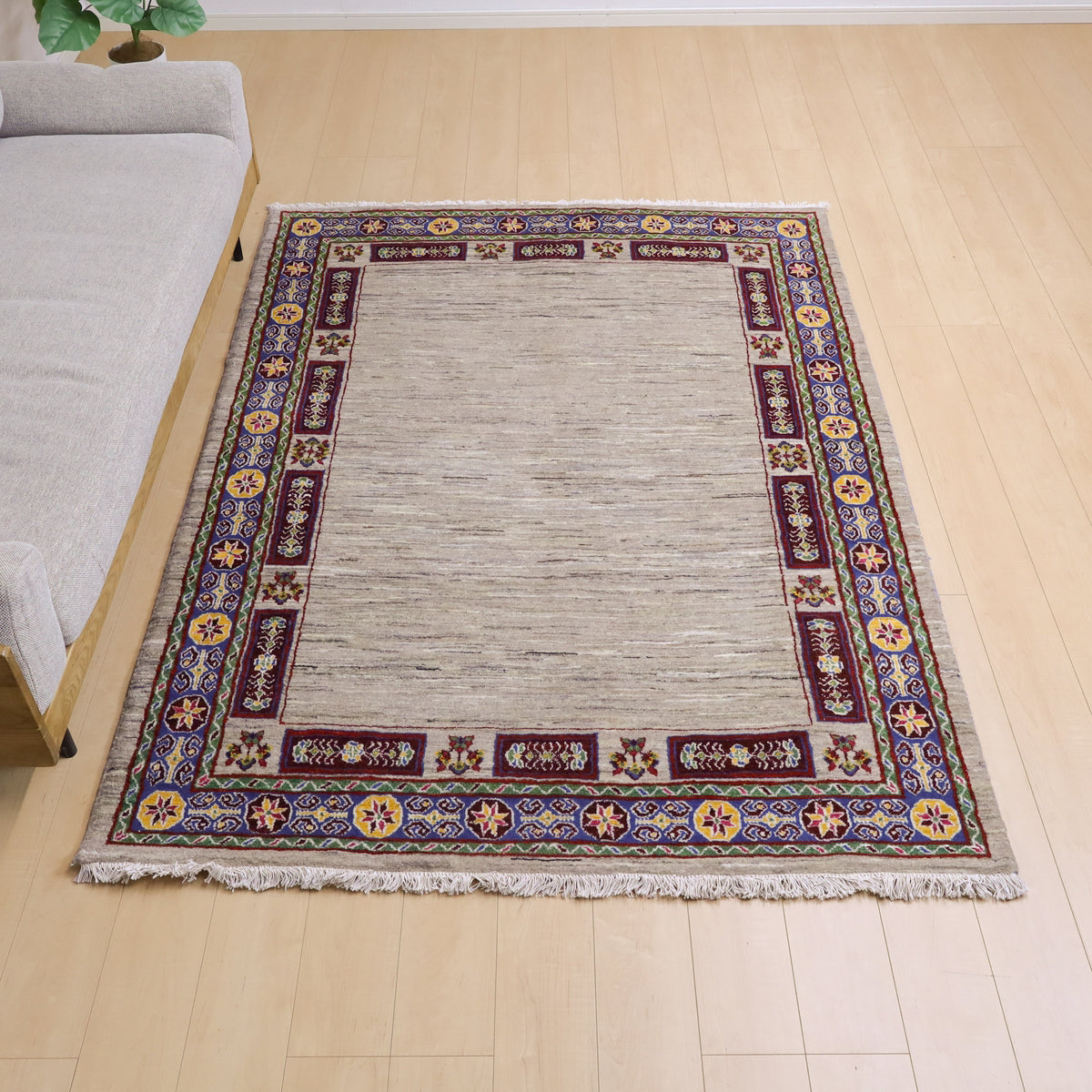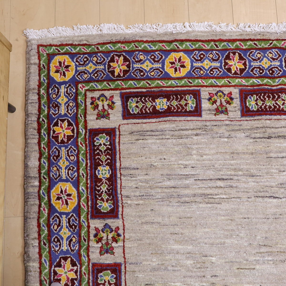 地色は薄いグレーベージュで、羊の毛色をそのまま活かした無染色の羊毛を使用しています。細かなアブラシ(色のグラデーション)が全体に入って、イランのギャッベならではの美しい色の揺らぎを楽しめます。周囲を囲むルリバフの伝統柄は、濃いえんじと青基調のシックな配色で丁寧に織り込まれ、生成りの地色と相まって、上品さが際立ちます。どの方向から見ても美しく見え、センターテーブルを置いてもおさまりの良い使いやすいデザインです。
