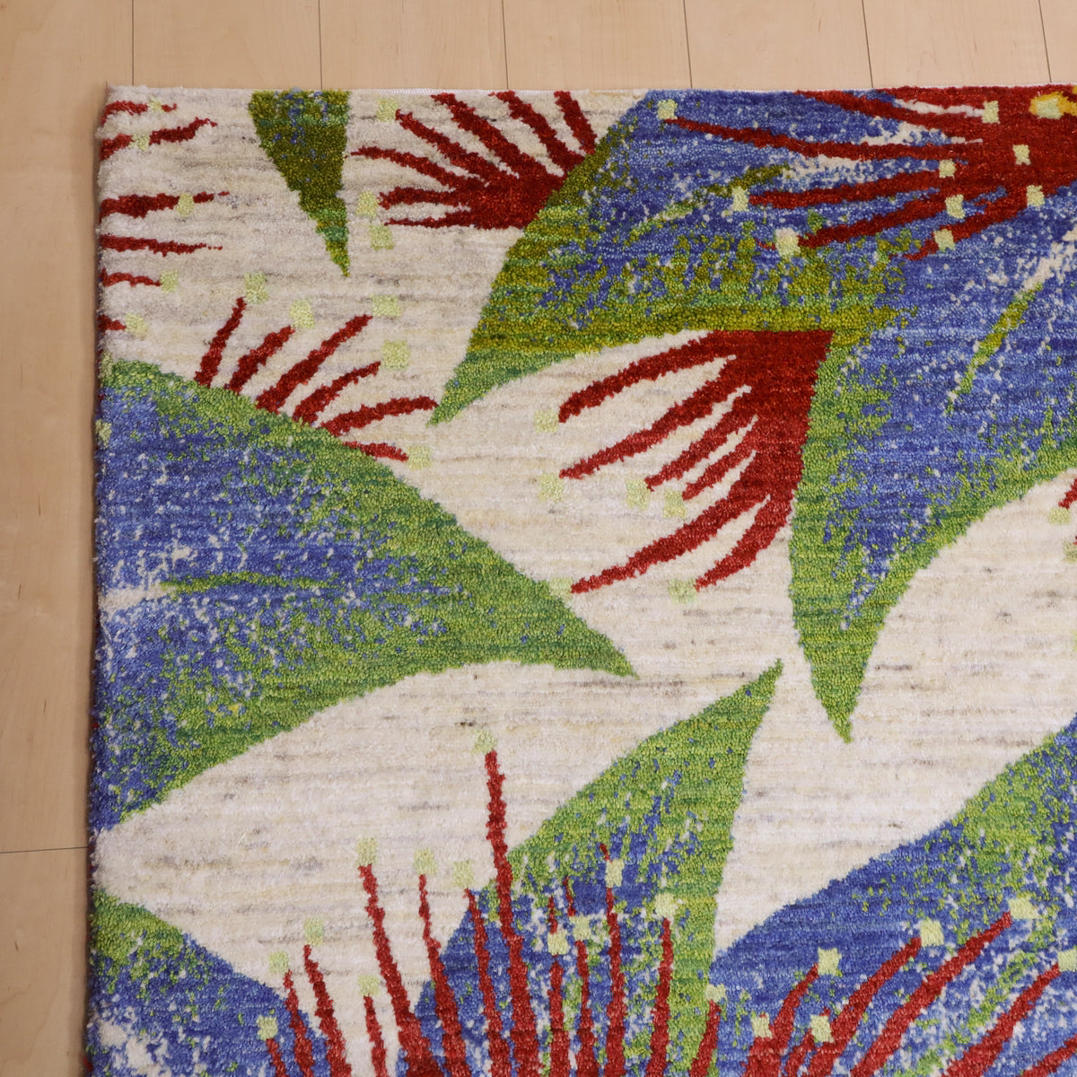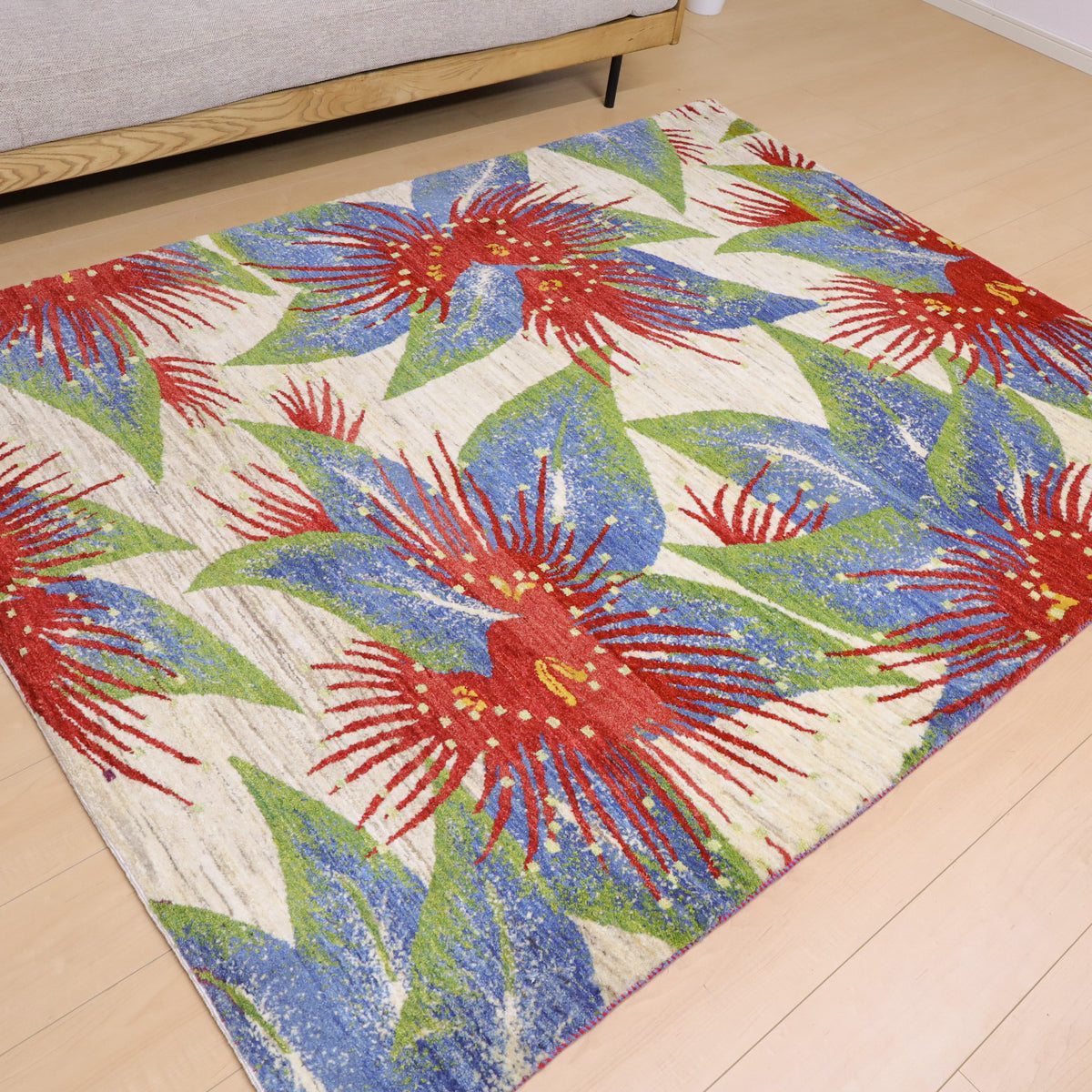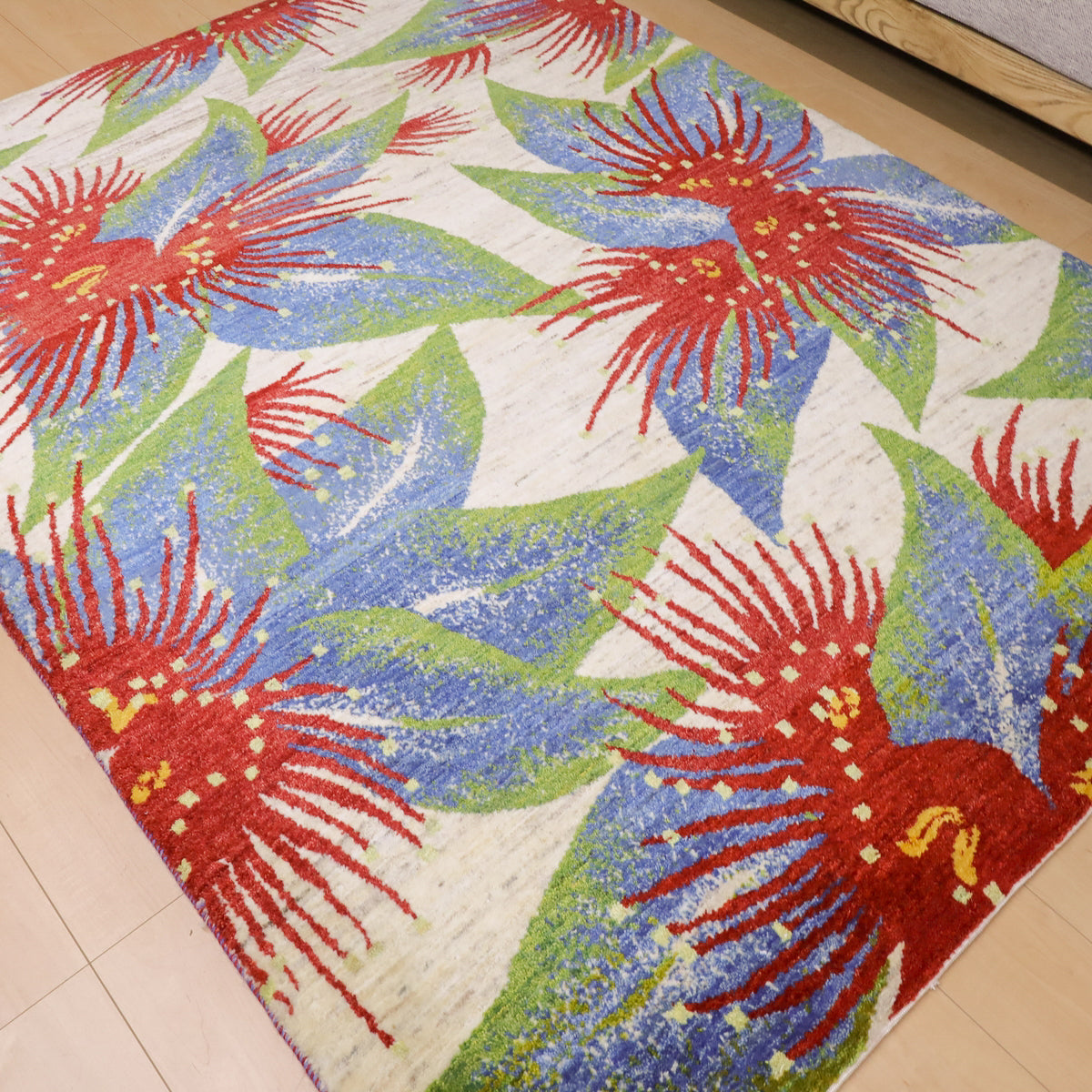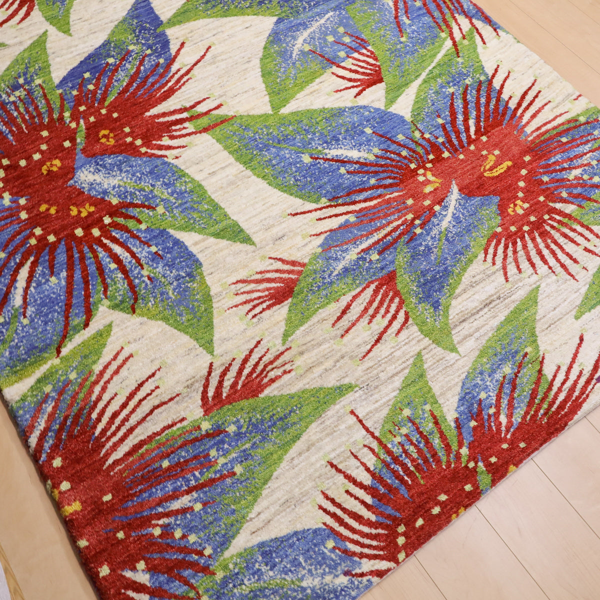 羊の毛色をそのまま使用した無染色の生成りを背景に、大きくスパークするような百合の花。青と緑と赤の取り合わせが爽やかな雰囲気、モダンなアート作品を飾るようにお部屋に敷いてインテリアに個性を加えるような使い方がおすすめです。見る人に力強いエネルギーと躍動感を感じさせながらも、手織りの温かみや天然のウール素材の素朴さ心地よい存在感のある品です。