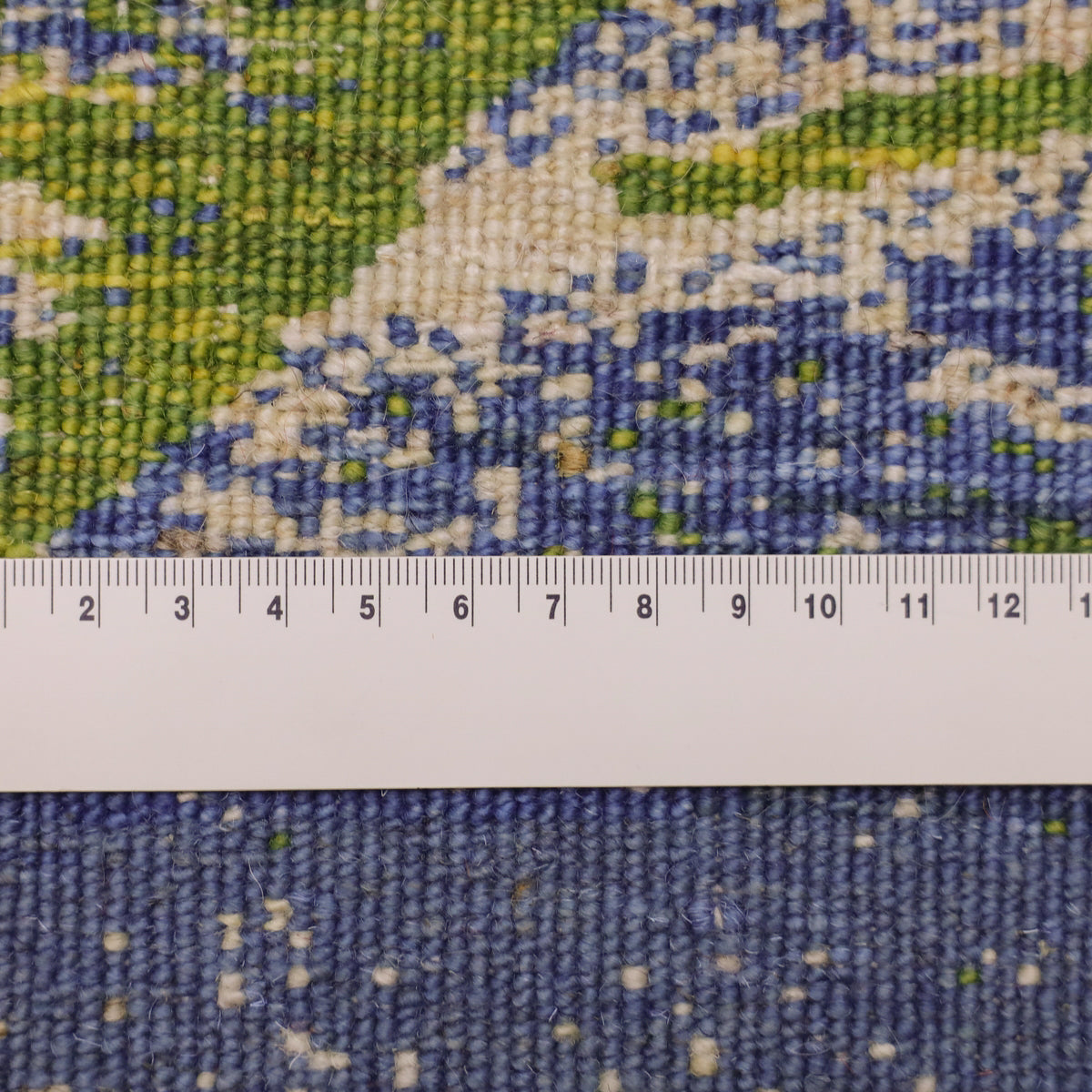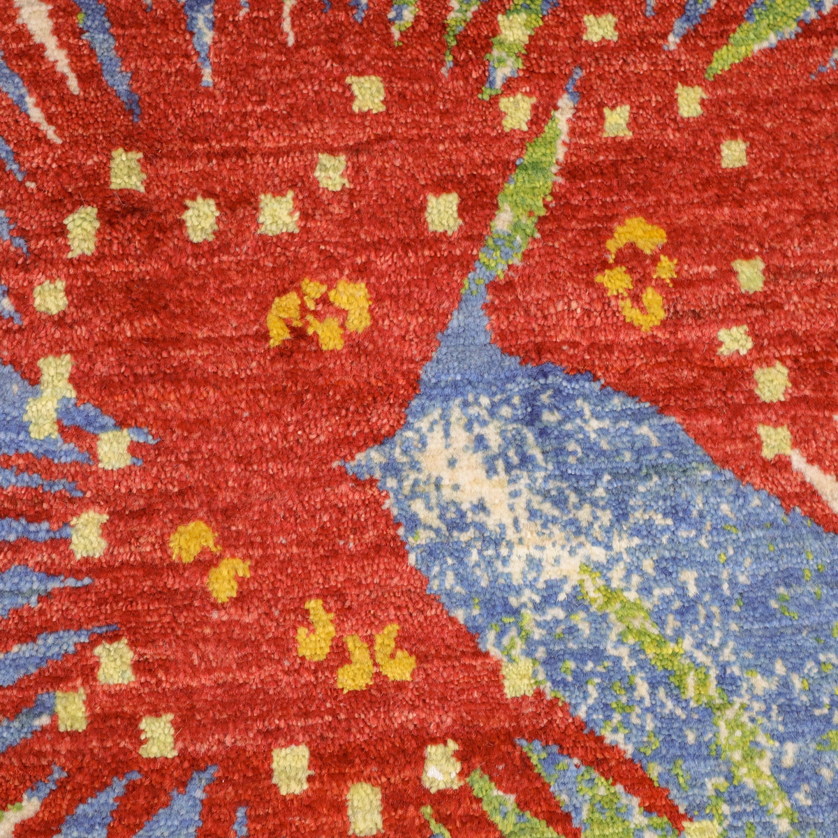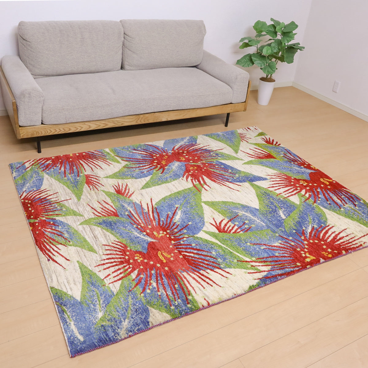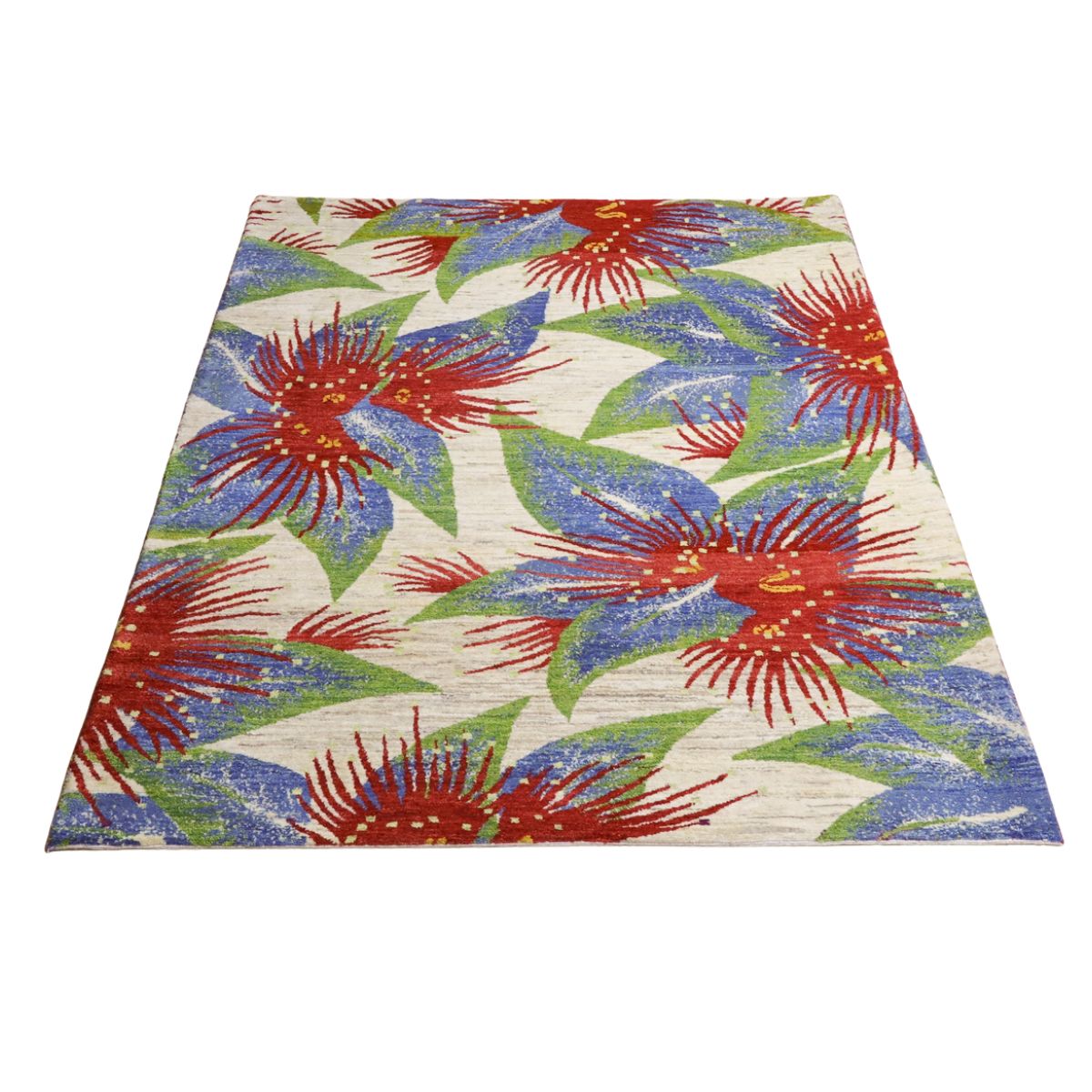 羊の毛色をそのまま使用した無染色の生成りを背景に、大きくスパークするような百合の花。青と緑と赤の取り合わせが爽やかな雰囲気、モダンなアート作品を飾るようにお部屋に敷いてインテリアに個性を加えるような使い方がおすすめです。見る人に力強いエネルギーと躍動感を感じさせながらも、手織りの温かみや天然のウール素材の素朴さ心地よい存在感のある品です。