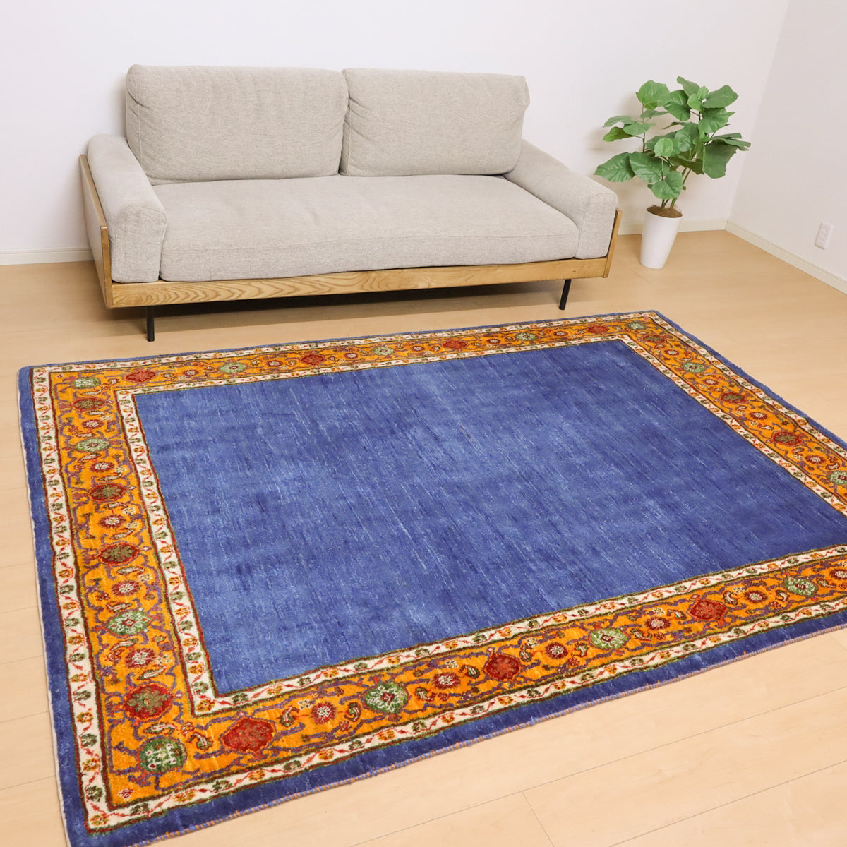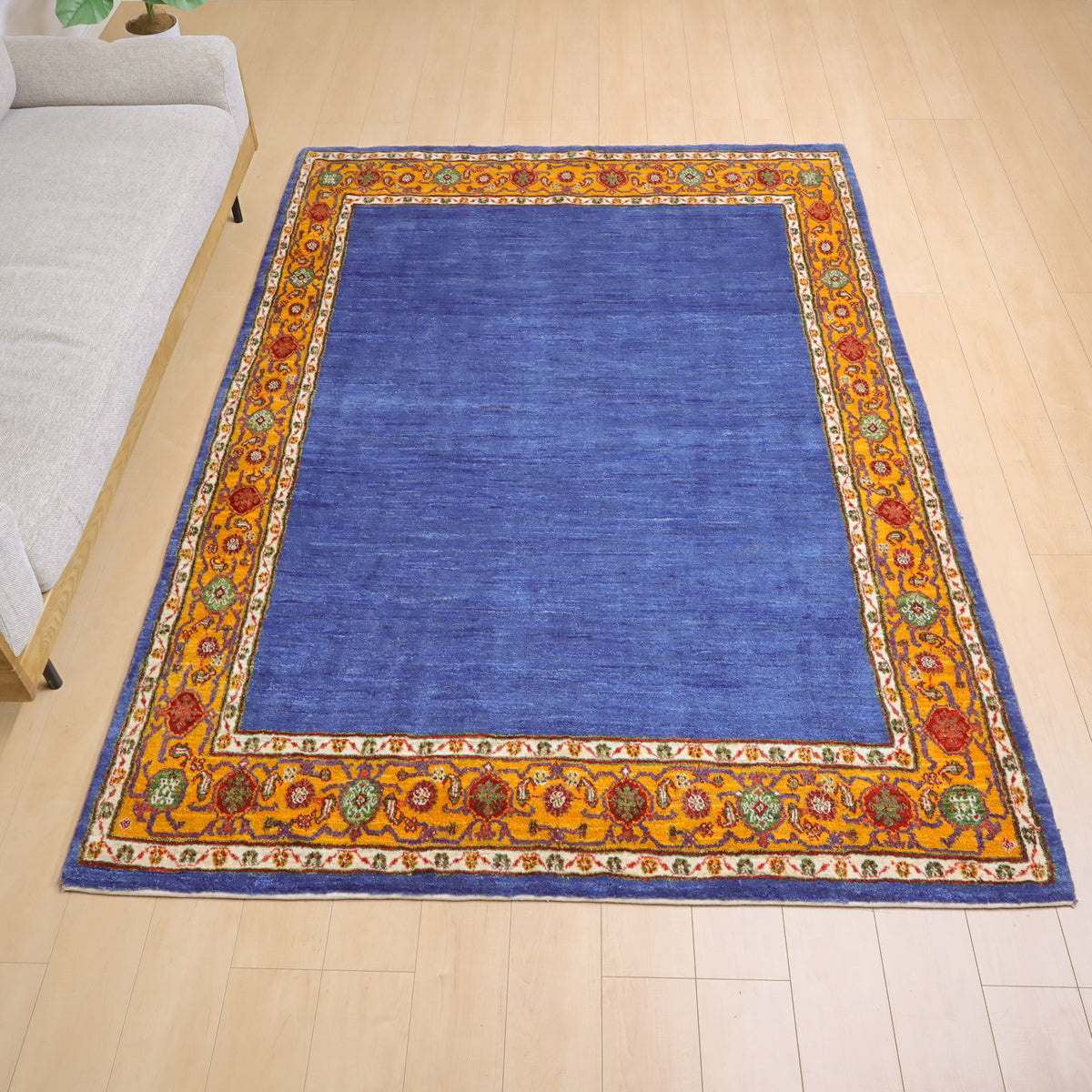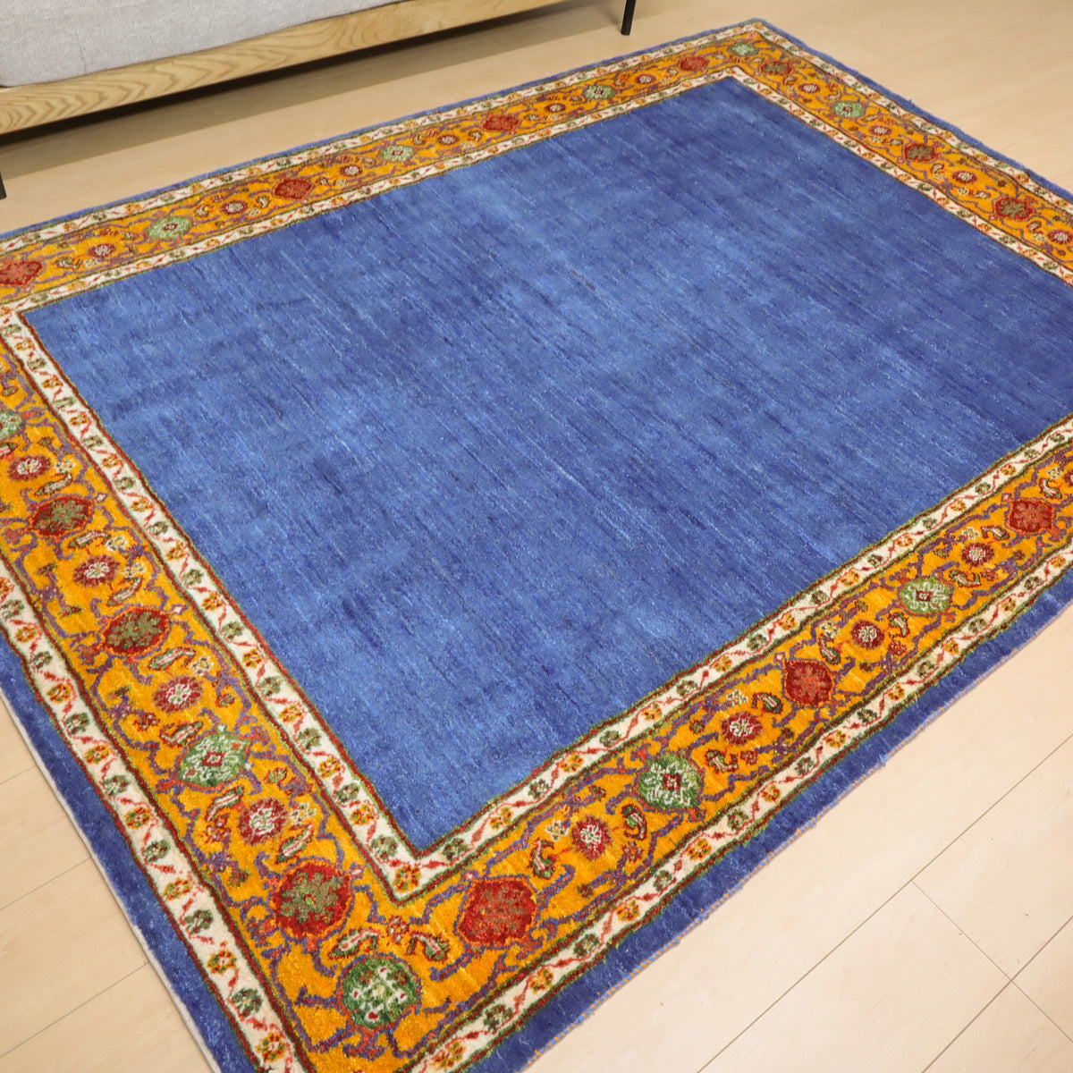 濃い藍色には濃淡の細かなグラデーションが入って色の揺らぎが味わえます。山吹色で周囲を囲むルリバフの伝統柄は丁寧に織り込まれ、ダークな寒色に温かみを添えます。どの方向から見ても美しく見え、センターテーブルを置いてもおさまりの良い使いやすいデザインです。シンプルでありながら存在感のある上品なギャッベです。