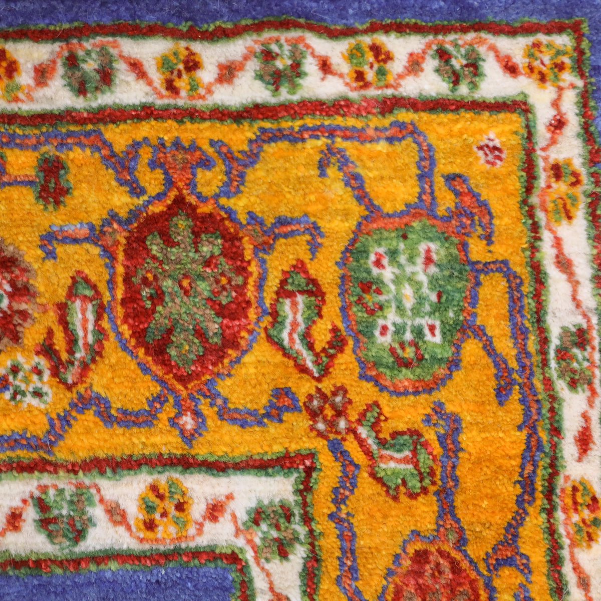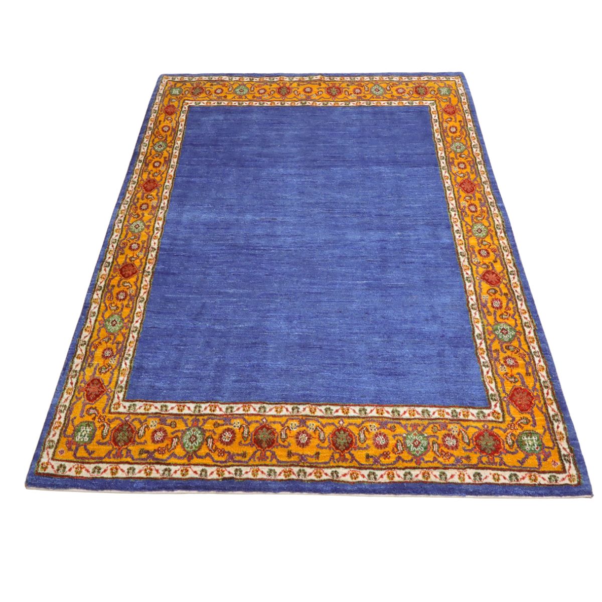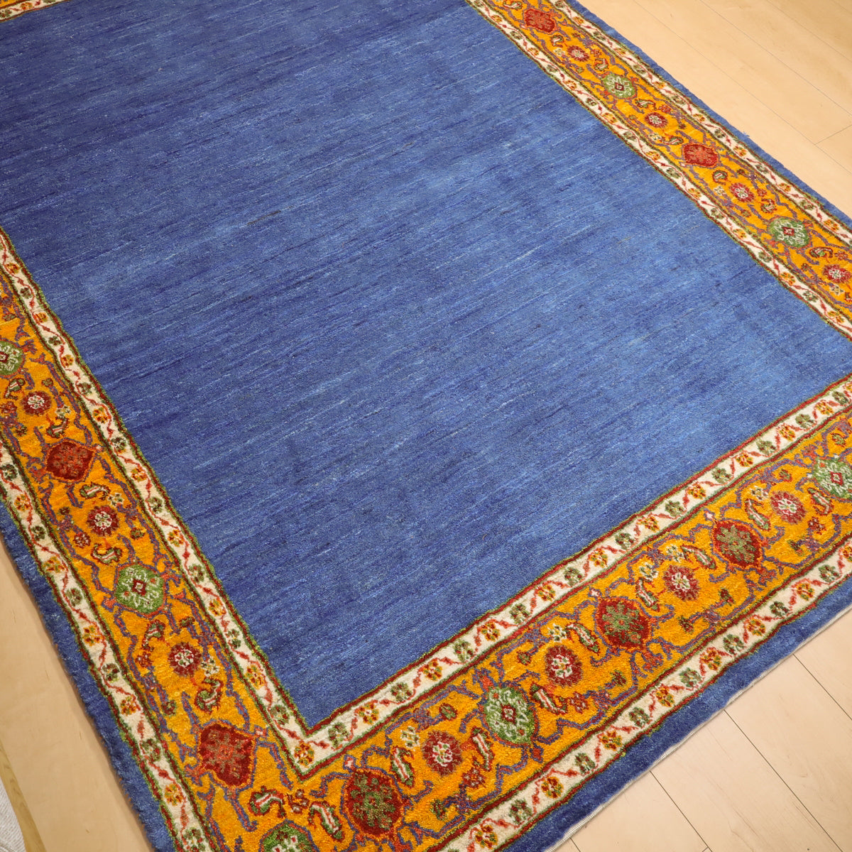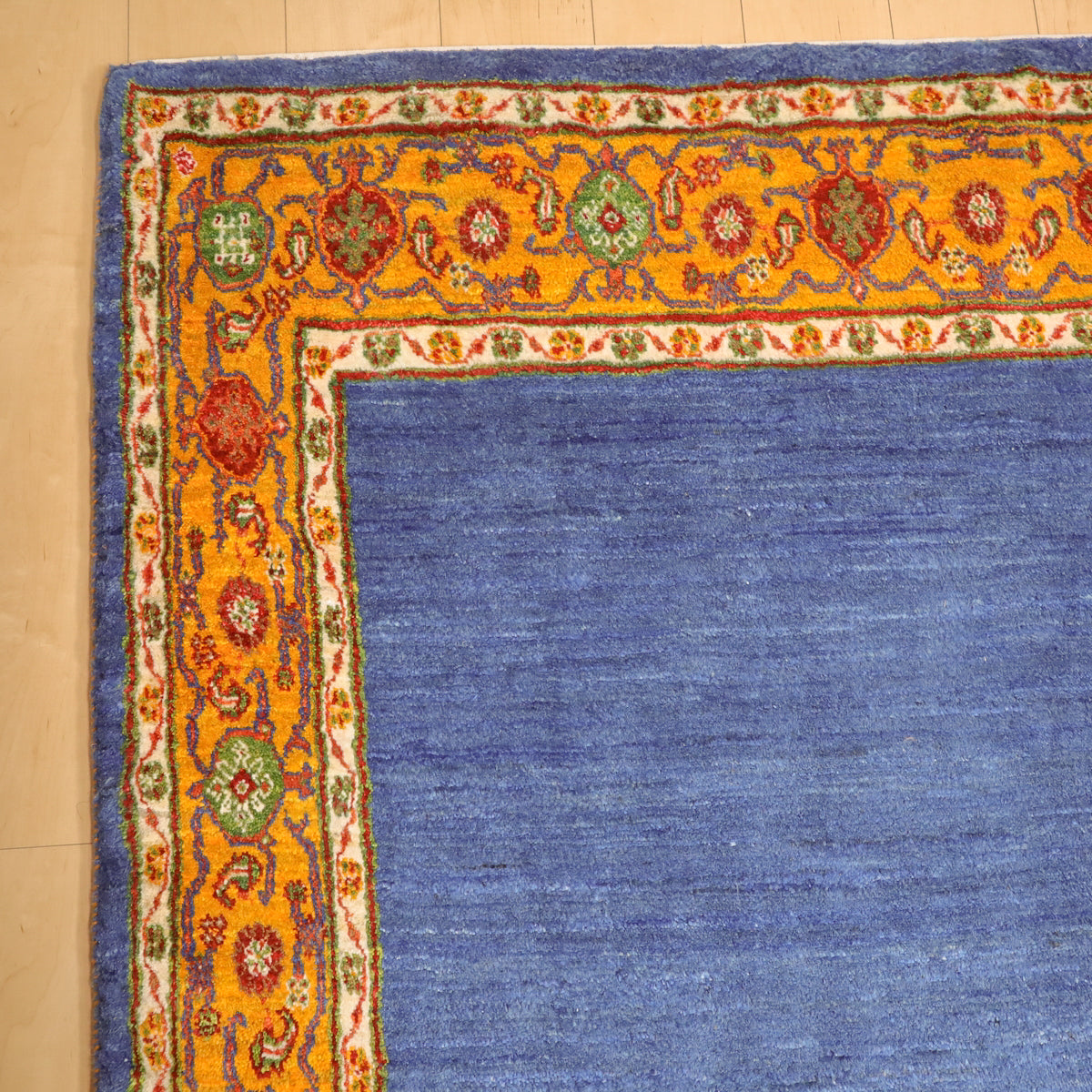 濃い藍色には濃淡の細かなグラデーションが入って色の揺らぎが味わえます。山吹色で周囲を囲むルリバフの伝統柄は丁寧に織り込まれ、ダークな寒色に温かみを添えます。どの方向から見ても美しく見え、センターテーブルを置いてもおさまりの良い使いやすいデザインです。シンプルでありながら存在感のある上品なギャッベです。