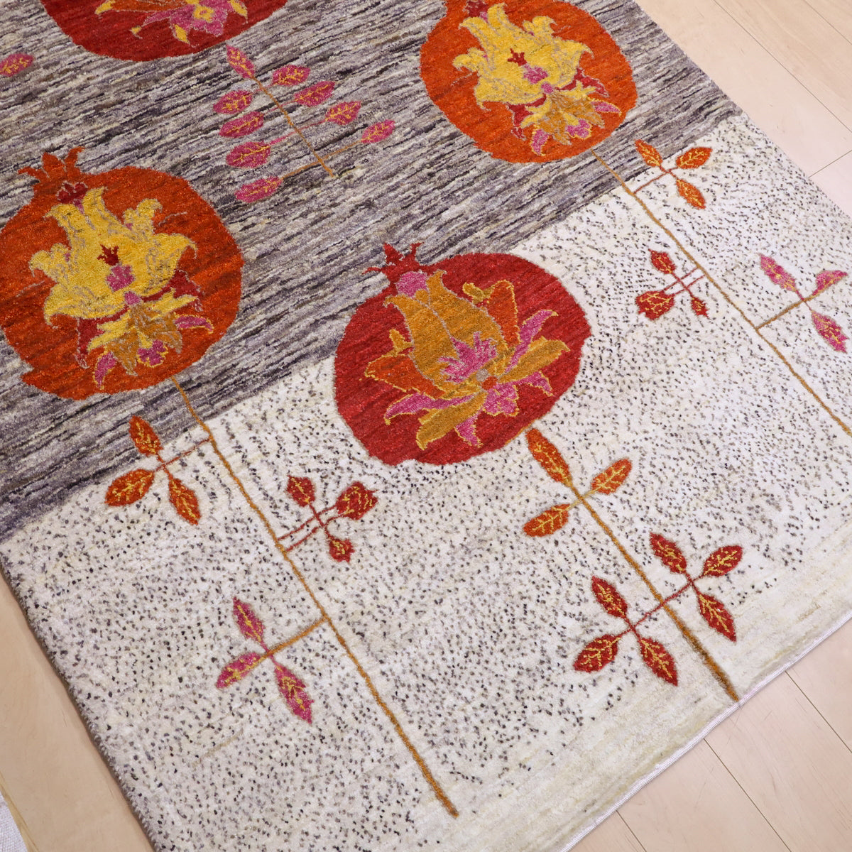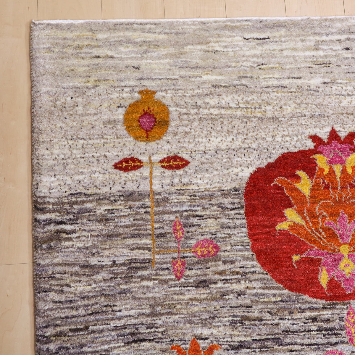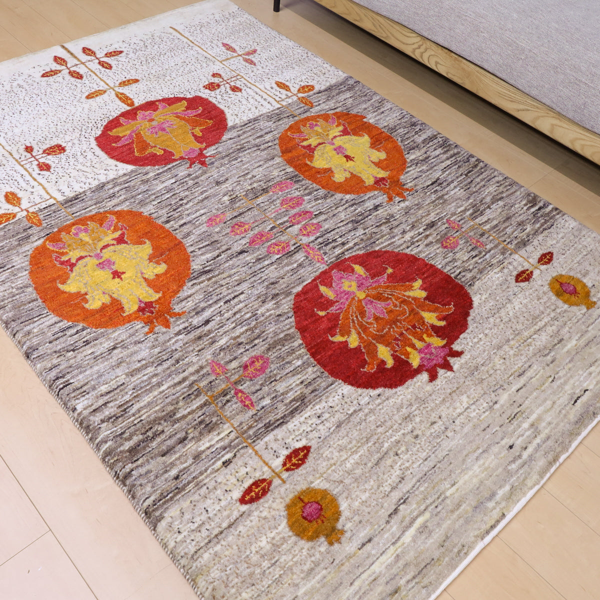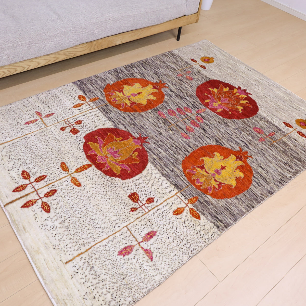羊の毛色をそのまま活かした無染色のウールを背景に、まん丸い大きなザクロが印象的。床に広げると一つのアート作品を飾るように空間がぐっとモダンに変わります。ギャッベらしいナチュラルな風合いとやさしい感触も併せ持つユニークなギャッベです。