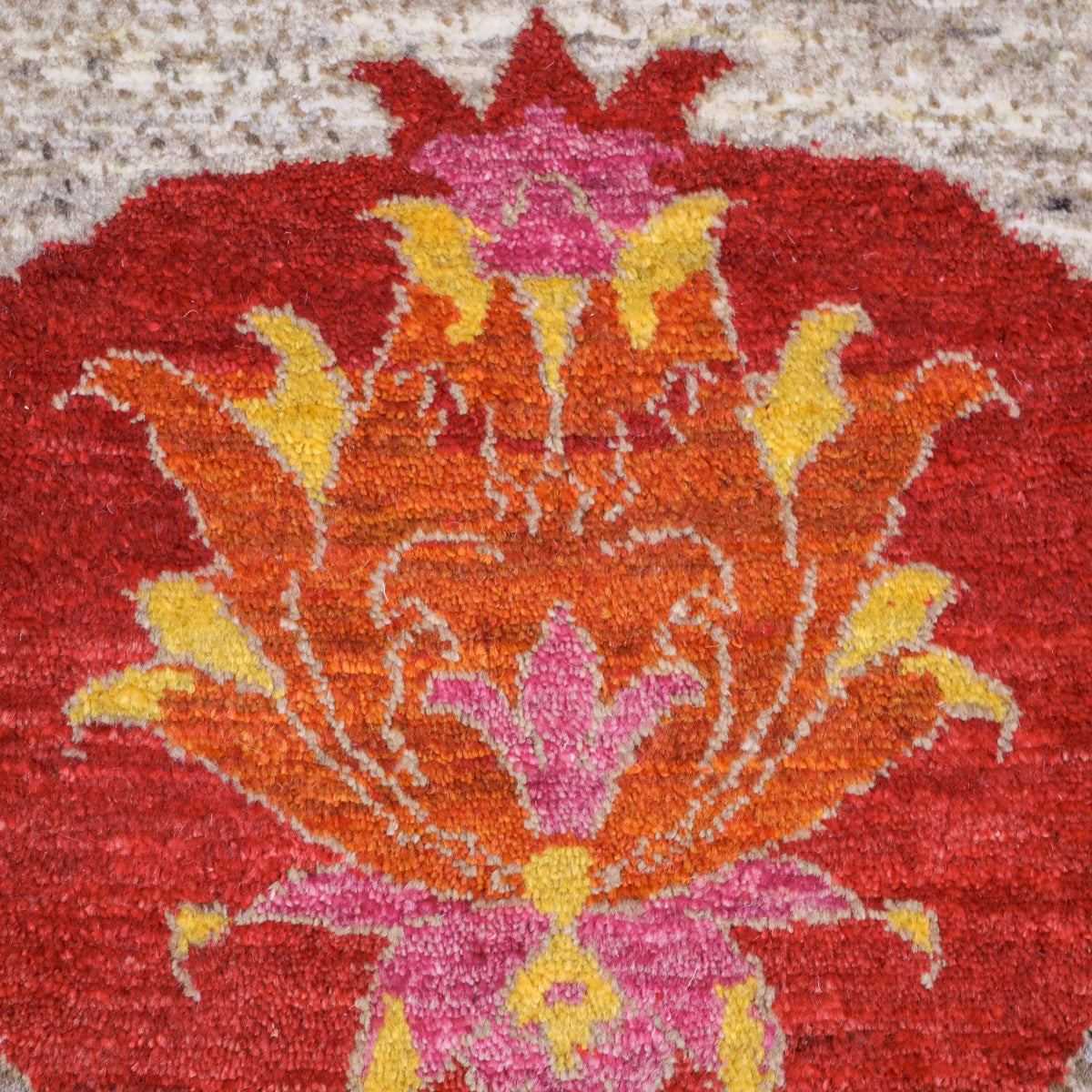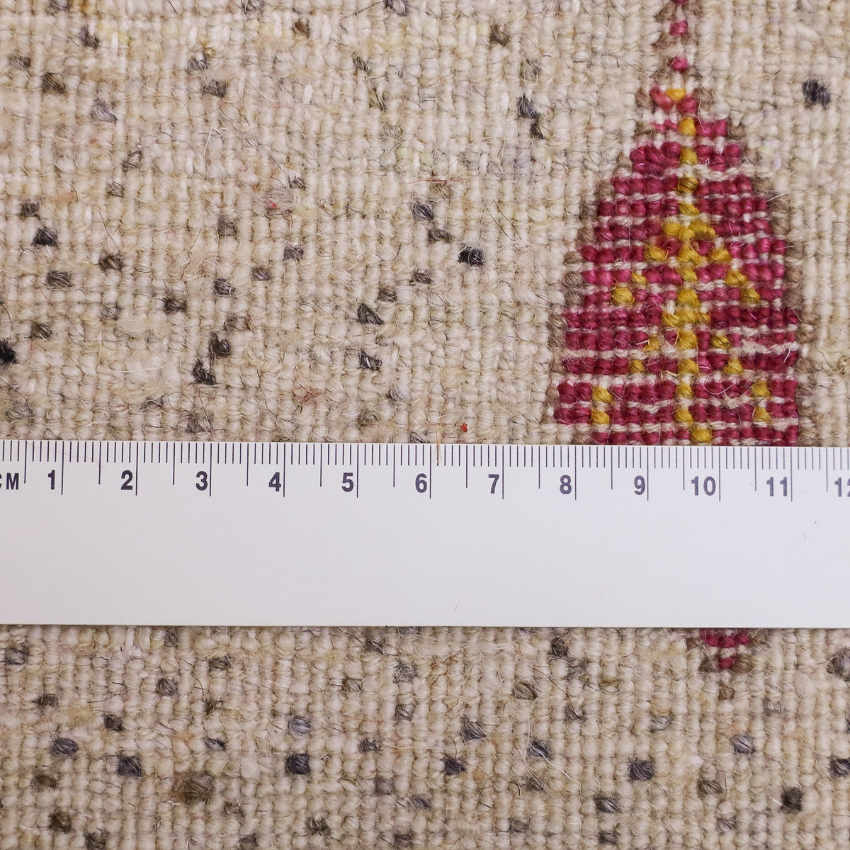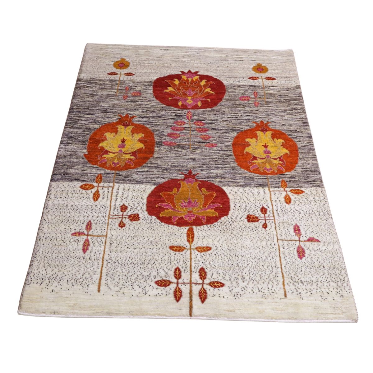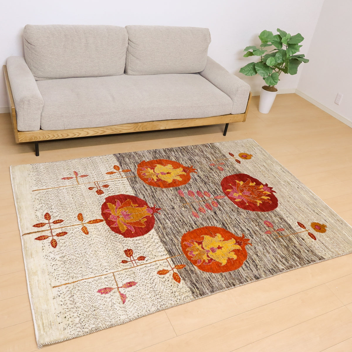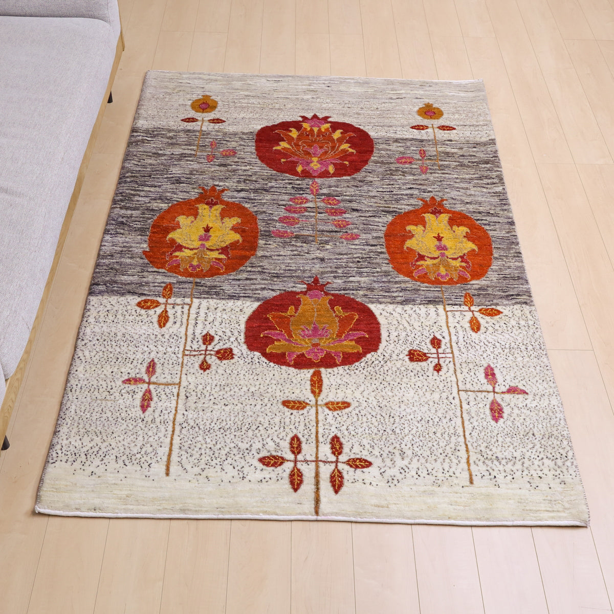 羊の毛色をそのまま活かした無染色のウールを背景に、まん丸い大きなザクロが印象的。床に広げると一つのアート作品を飾るように空間がぐっとモダンに変わります。ギャッベらしいナチュラルな風合いとやさしい感触も併せ持つユニークなギャッベです。