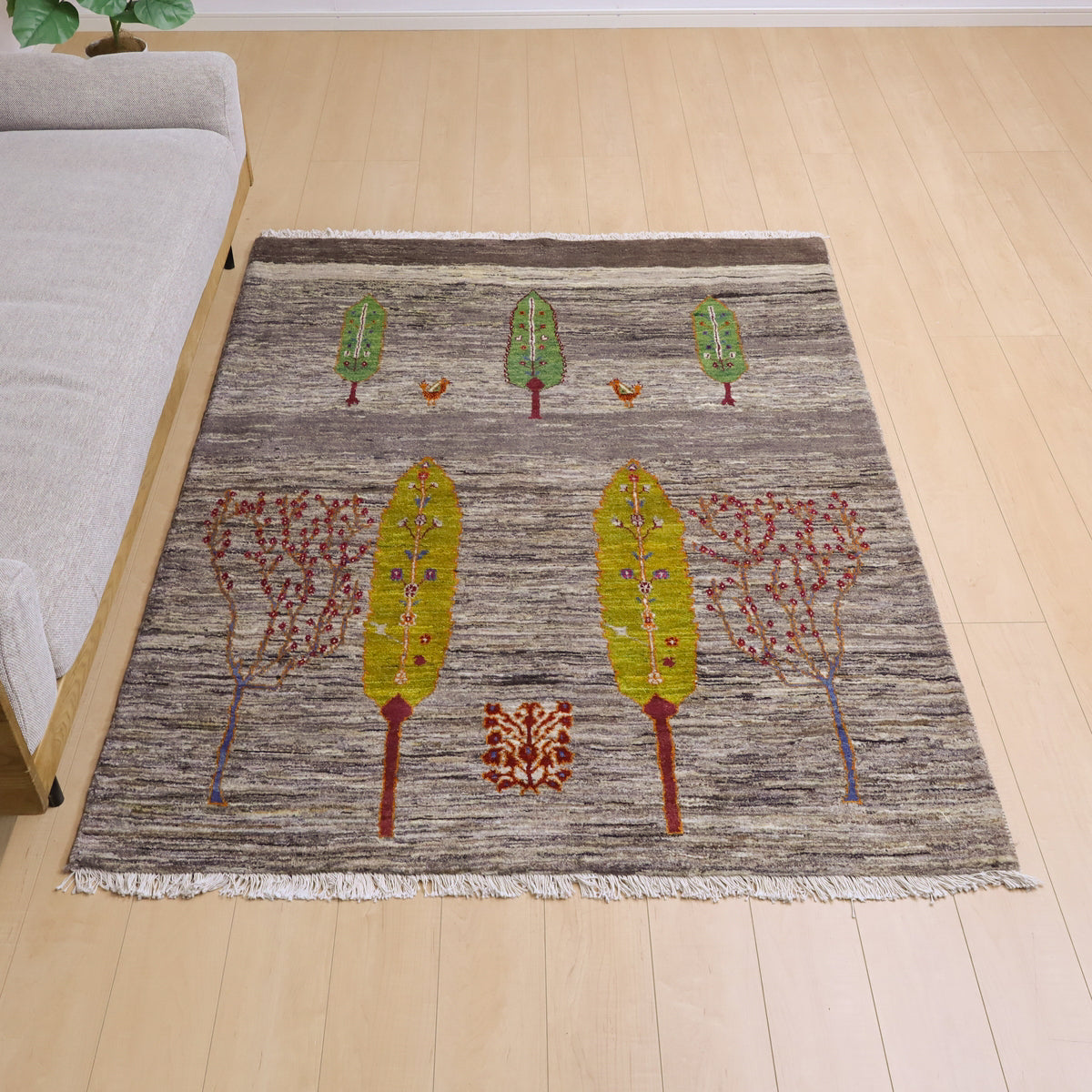 グレーやベージュの重なり合ったベースカラーは、刈り取った羊の毛、そのままの無染色です。アブラシ(色むらのグラデーション)が広がりのある風景のように変化したお部屋馴染みの良い暗めのナチュラルカラーです。シックな色合いでまとめられた生命の木のデザインです。
