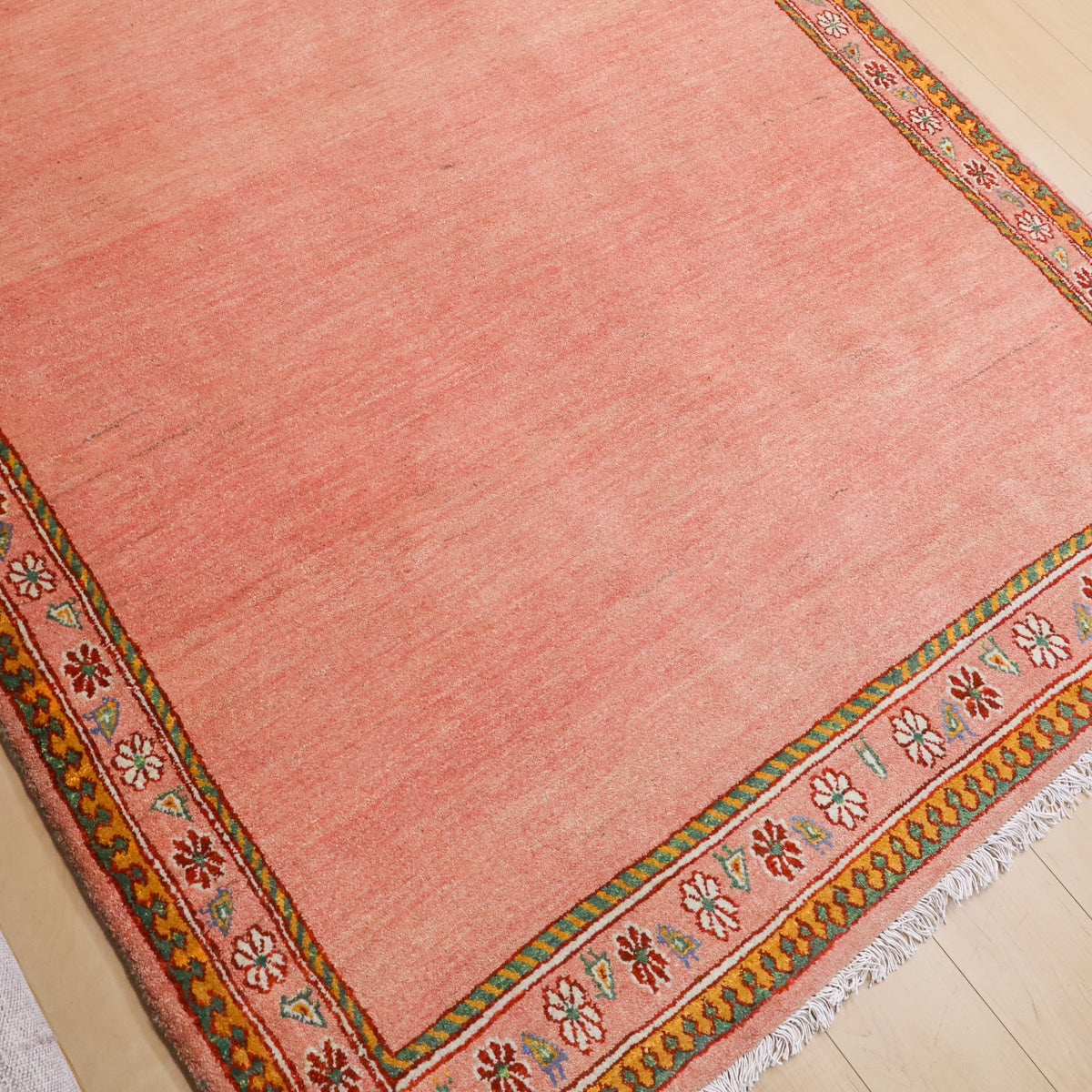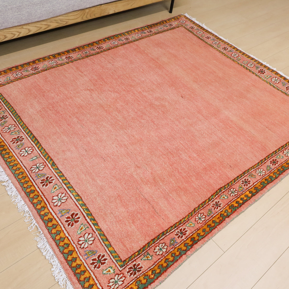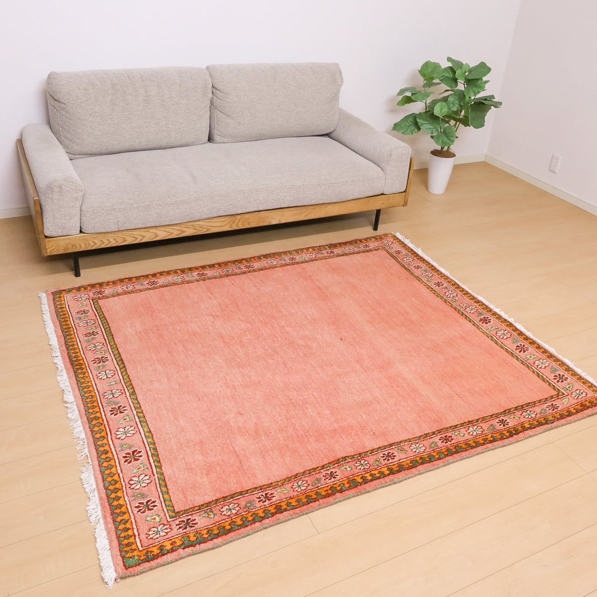 温かみのあるオレンジピンクのニュアンスカラーにお花と鳥の並んだ可愛らしいデザインでお部屋を和やかな空間にしてくれそうです。どの方向から見ても美しく見え、センターテーブルを置いてもおさまりの良い使いやすい枠デザイン。空間を優しく包むような穏やかなギャッベです。