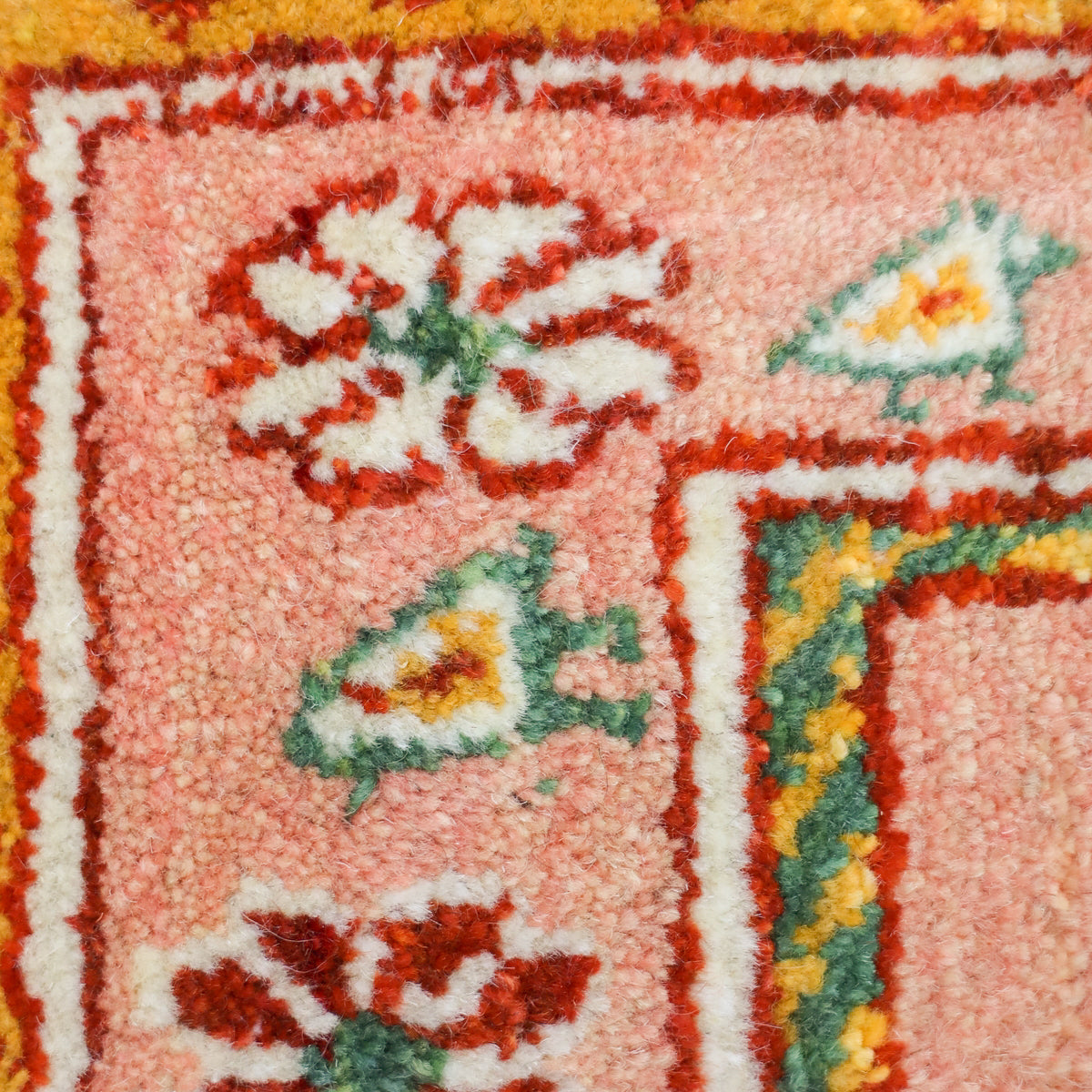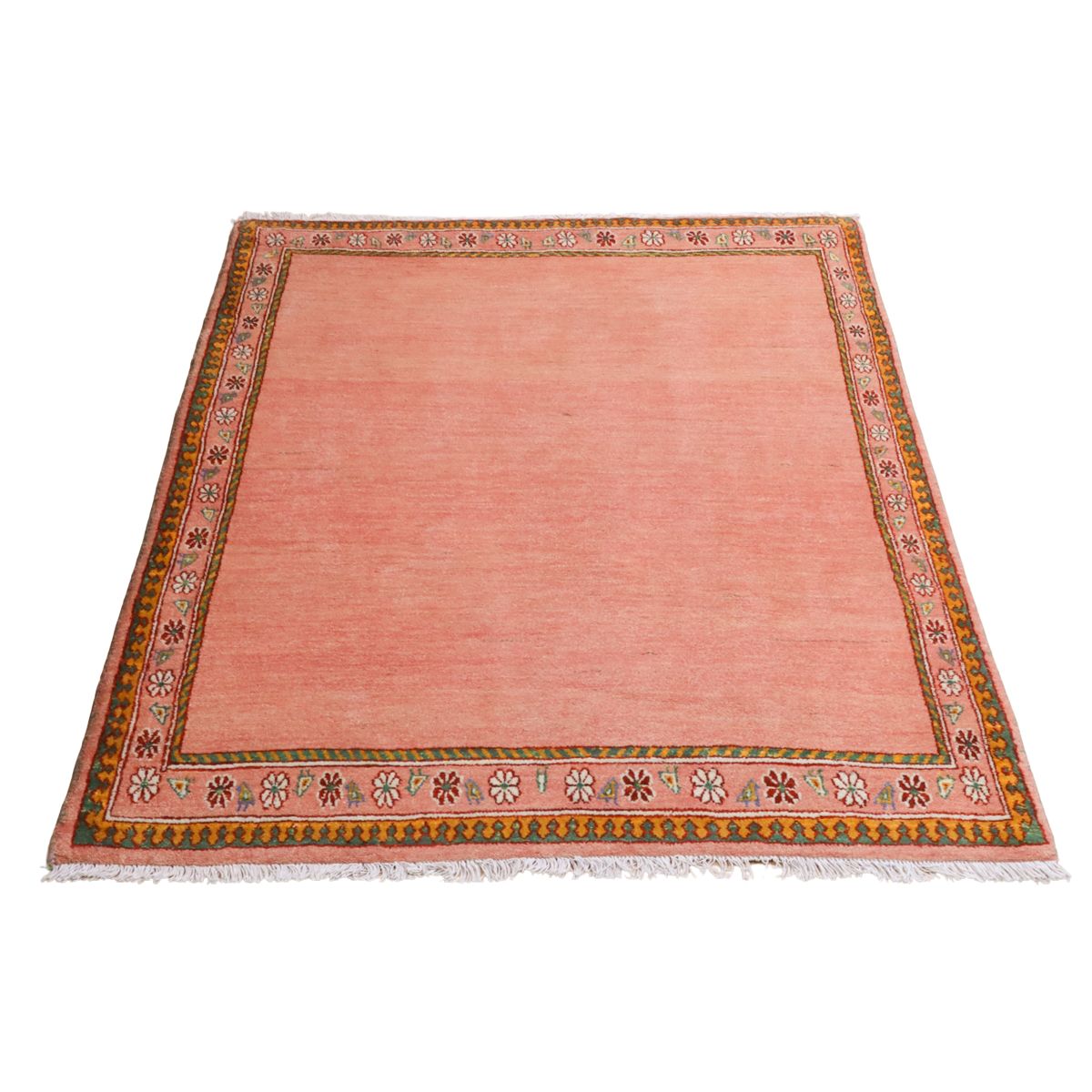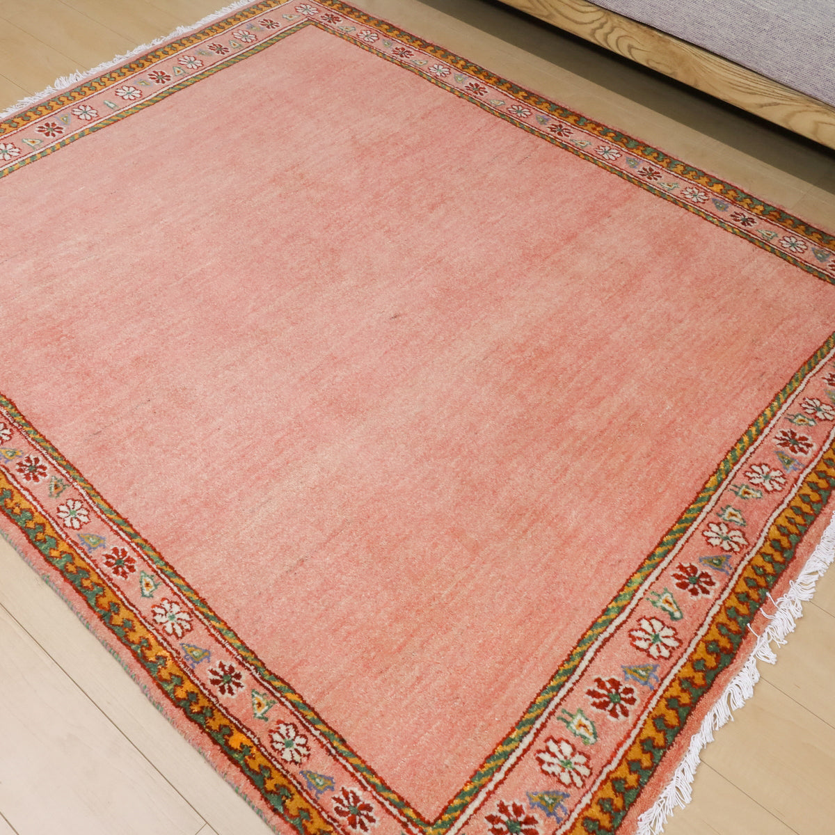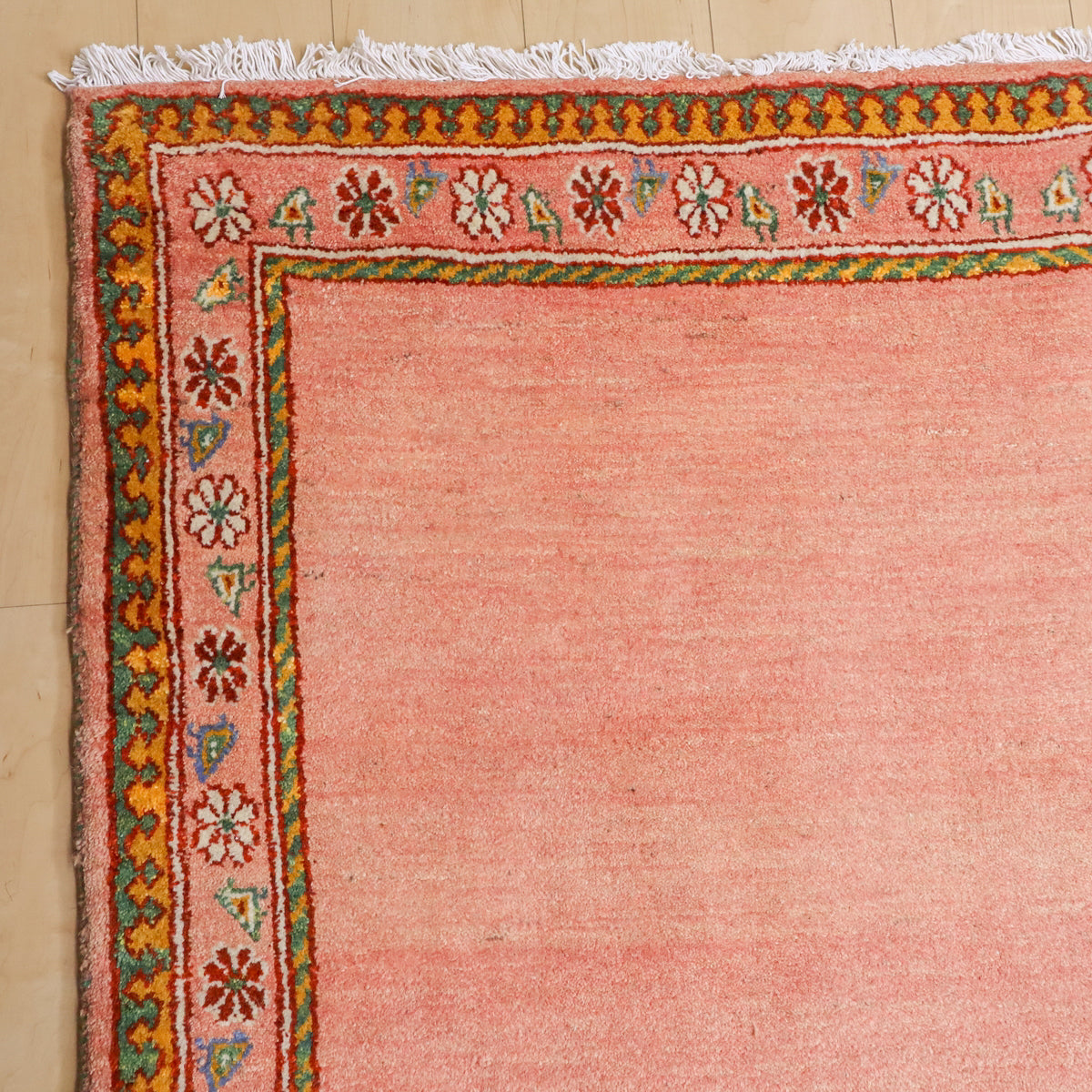 温かみのあるオレンジピンクのニュアンスカラーにお花と鳥の並んだ可愛らしいデザインでお部屋を和やかな空間にしてくれそうです。どの方向から見ても美しく見え、センターテーブルを置いてもおさまりの良い使いやすい枠デザイン。空間を優しく包むような穏やかなギャッベです。