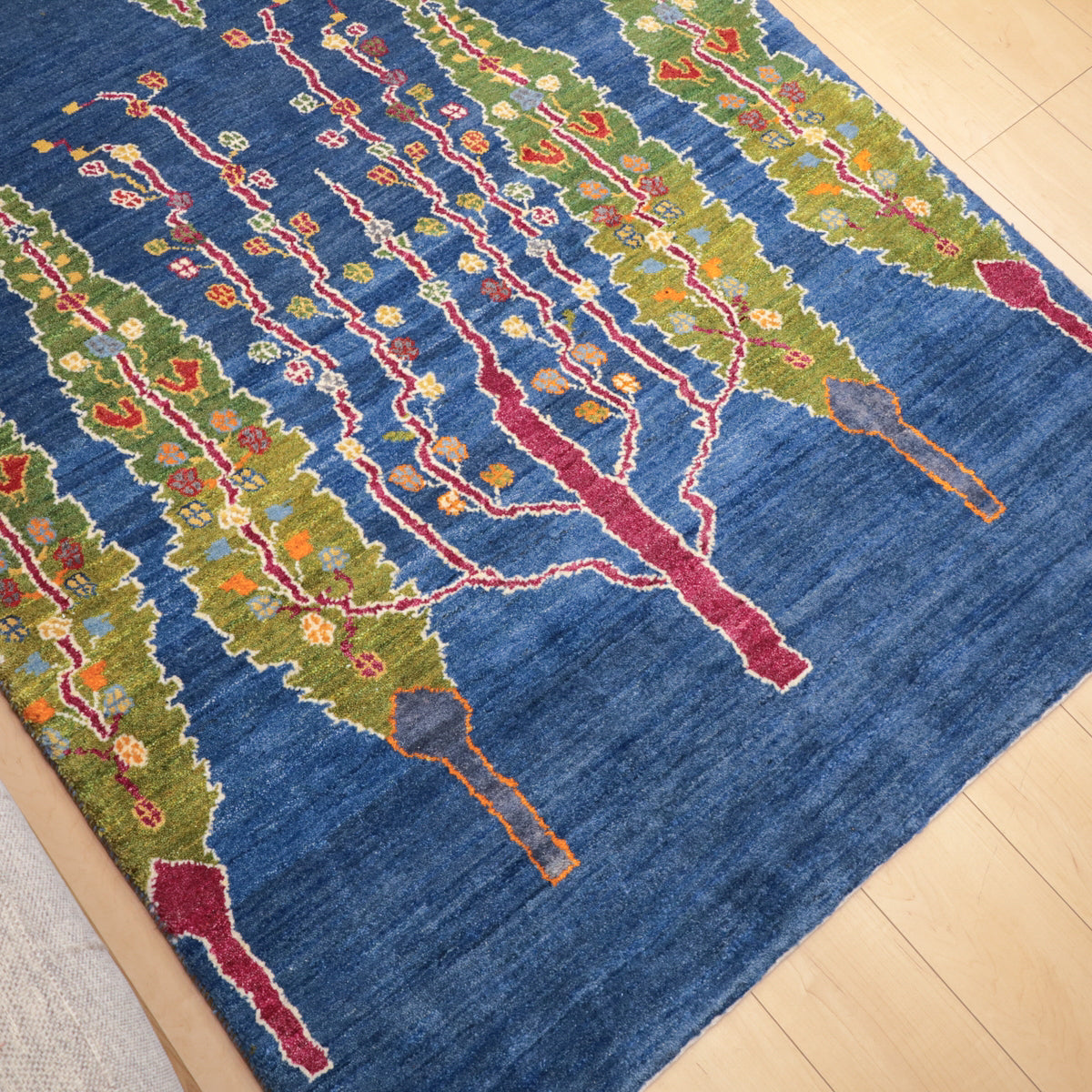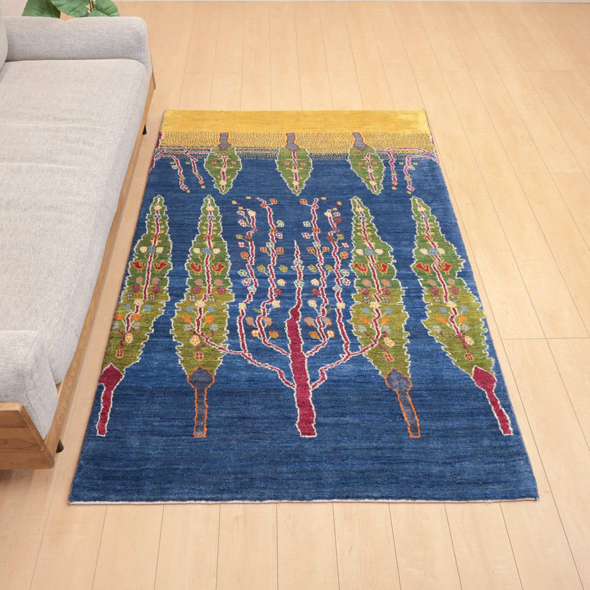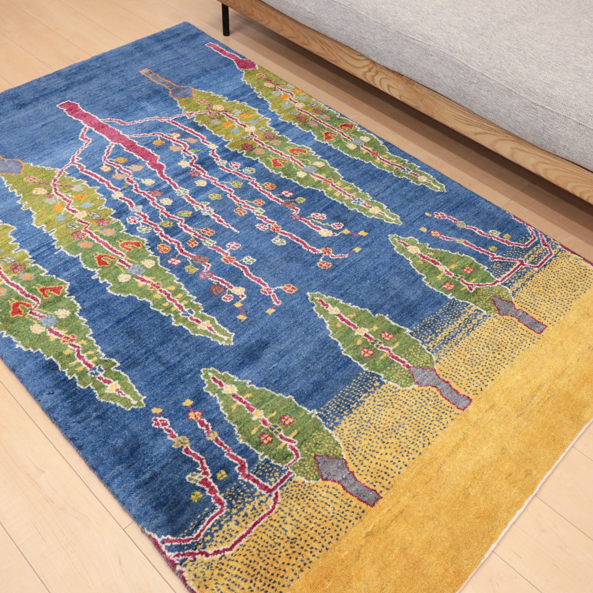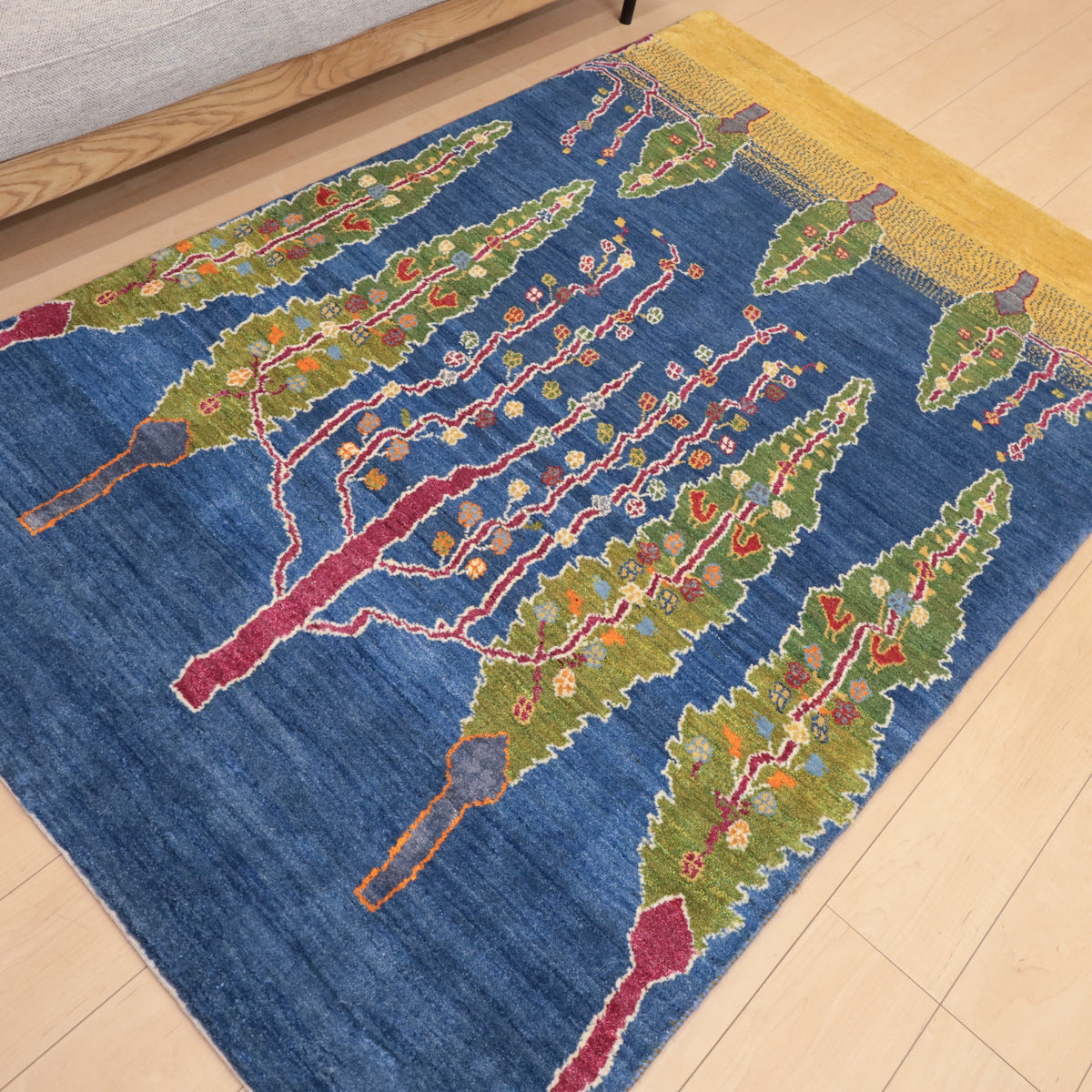 冴えた濃いめのブルーを背景に、大きく伸びた生命の木たちは、踊るような躍動感を感じます。子供の絵のような素直で楽しい雰囲気のギャッベです。