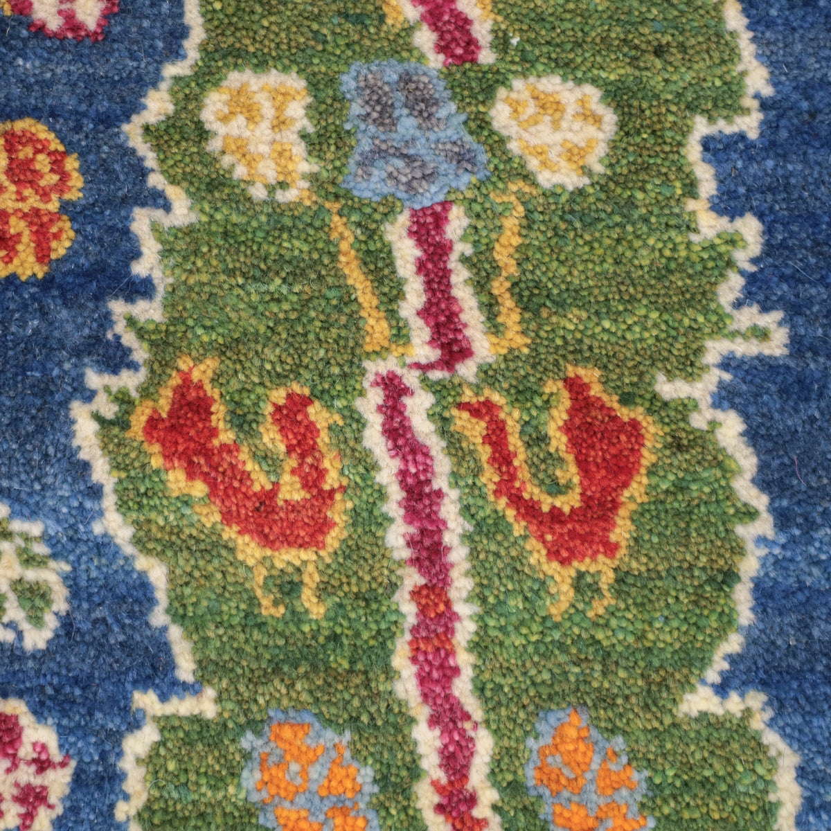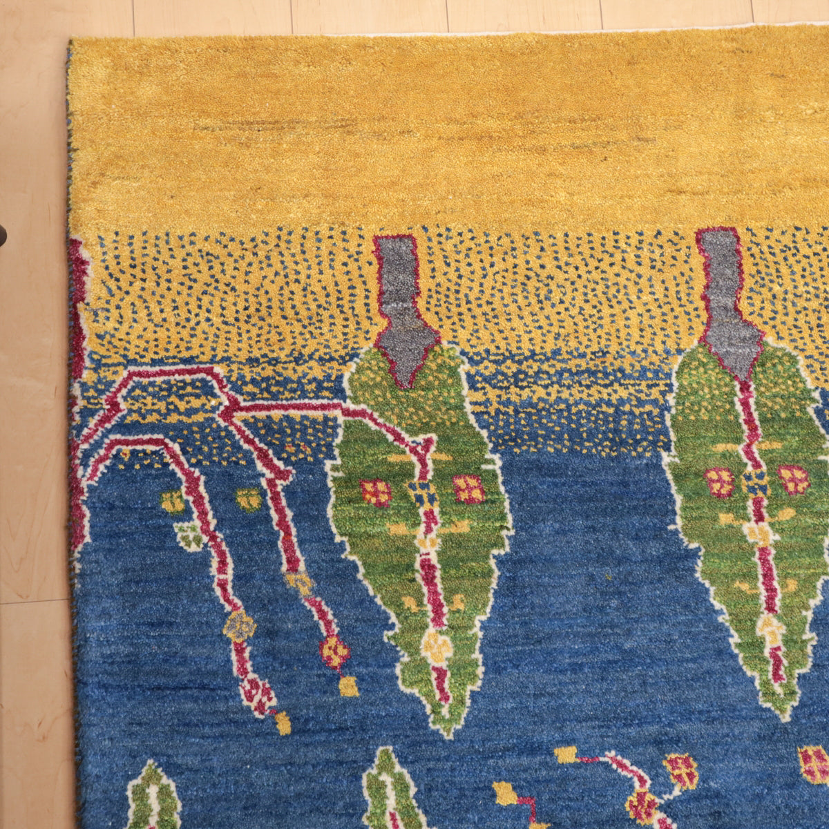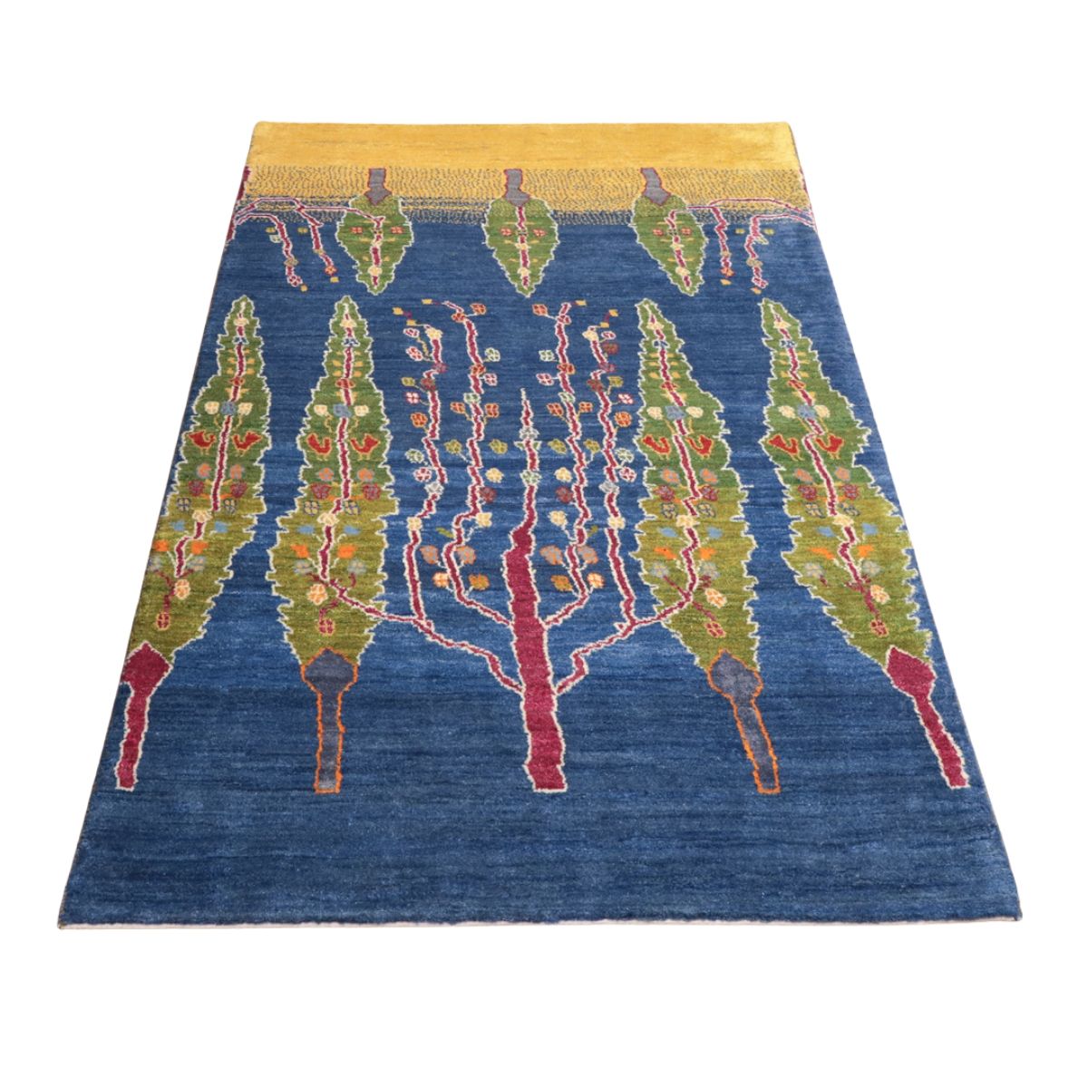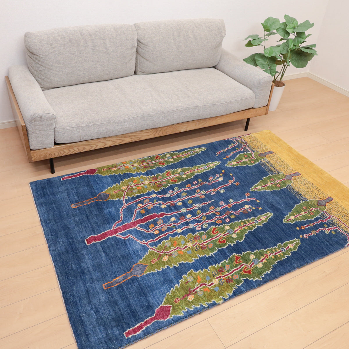冴えた濃いめのブルーを背景に、大きく伸びた生命の木たちは、踊るような躍動感を感じます。子供の絵のような素直で楽しい雰囲気のギャッベです。