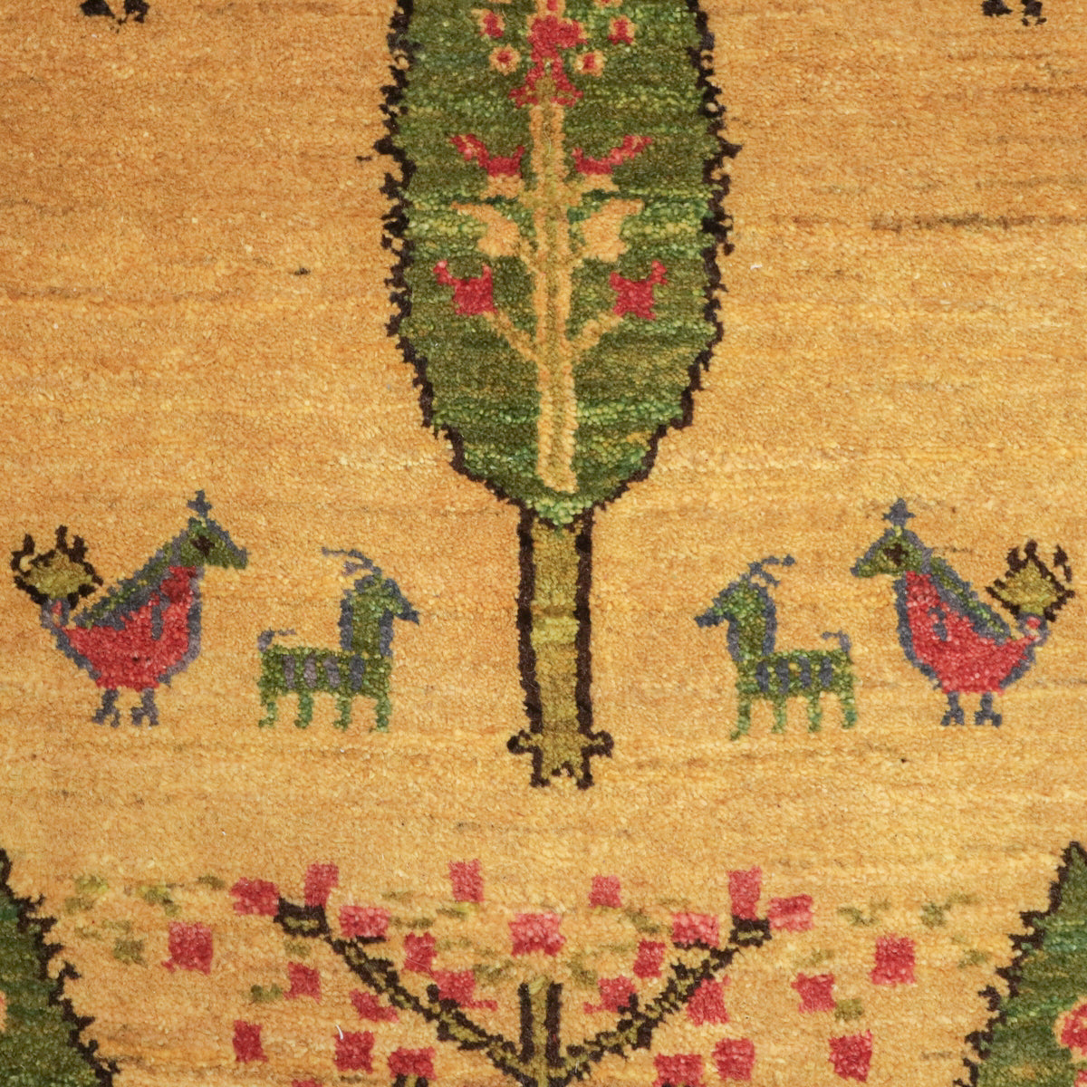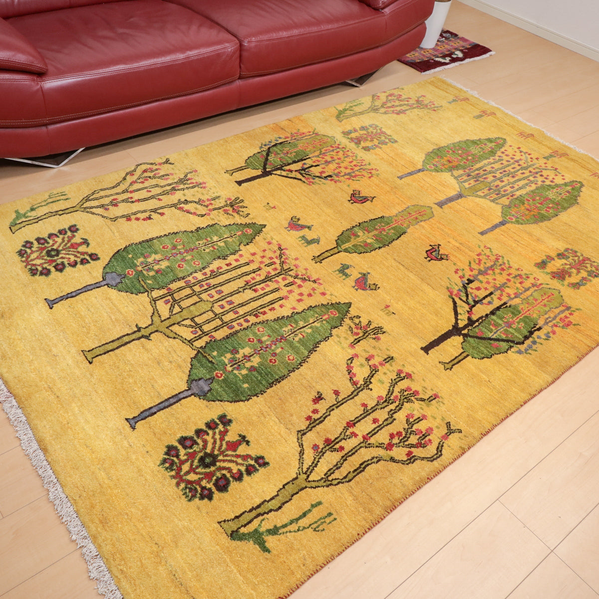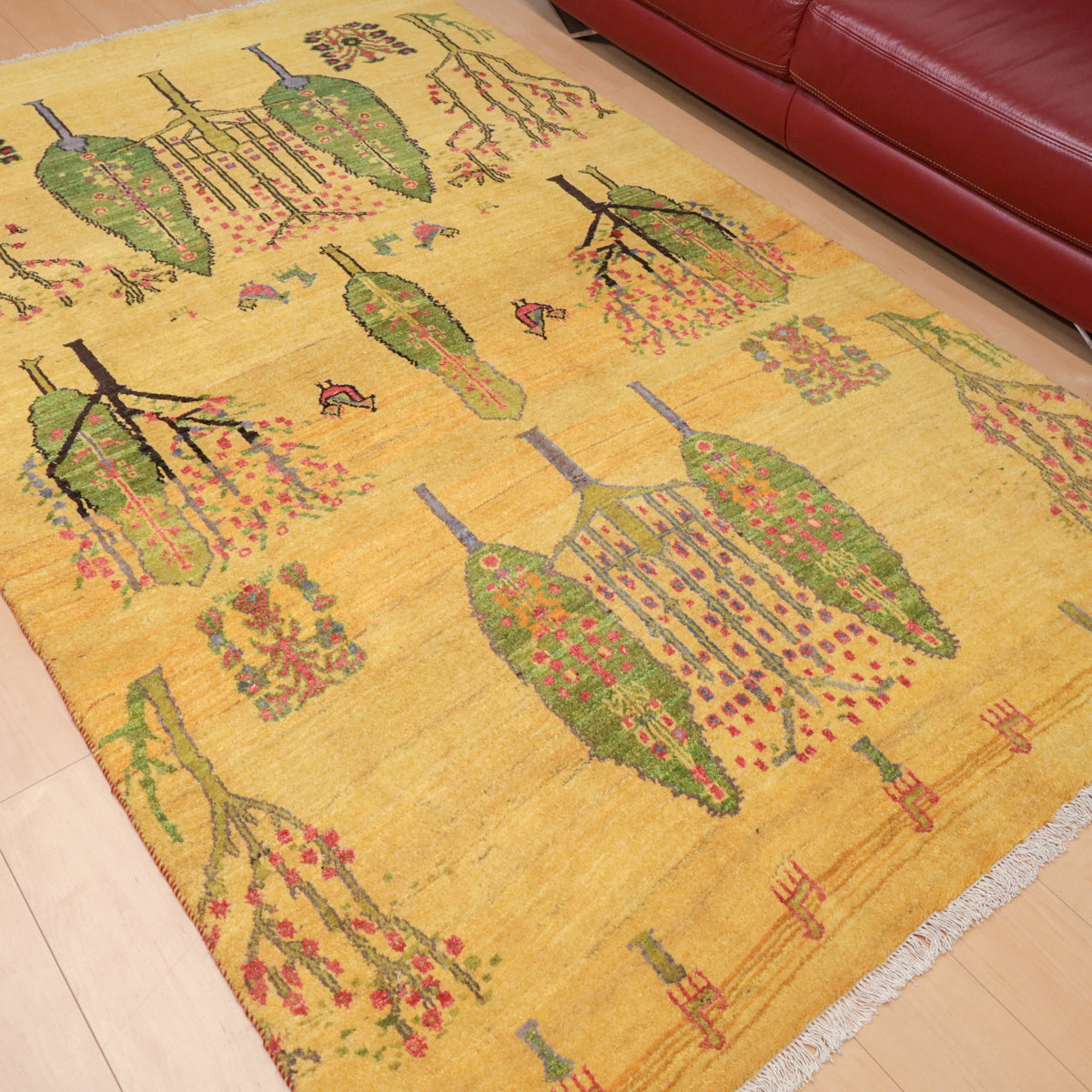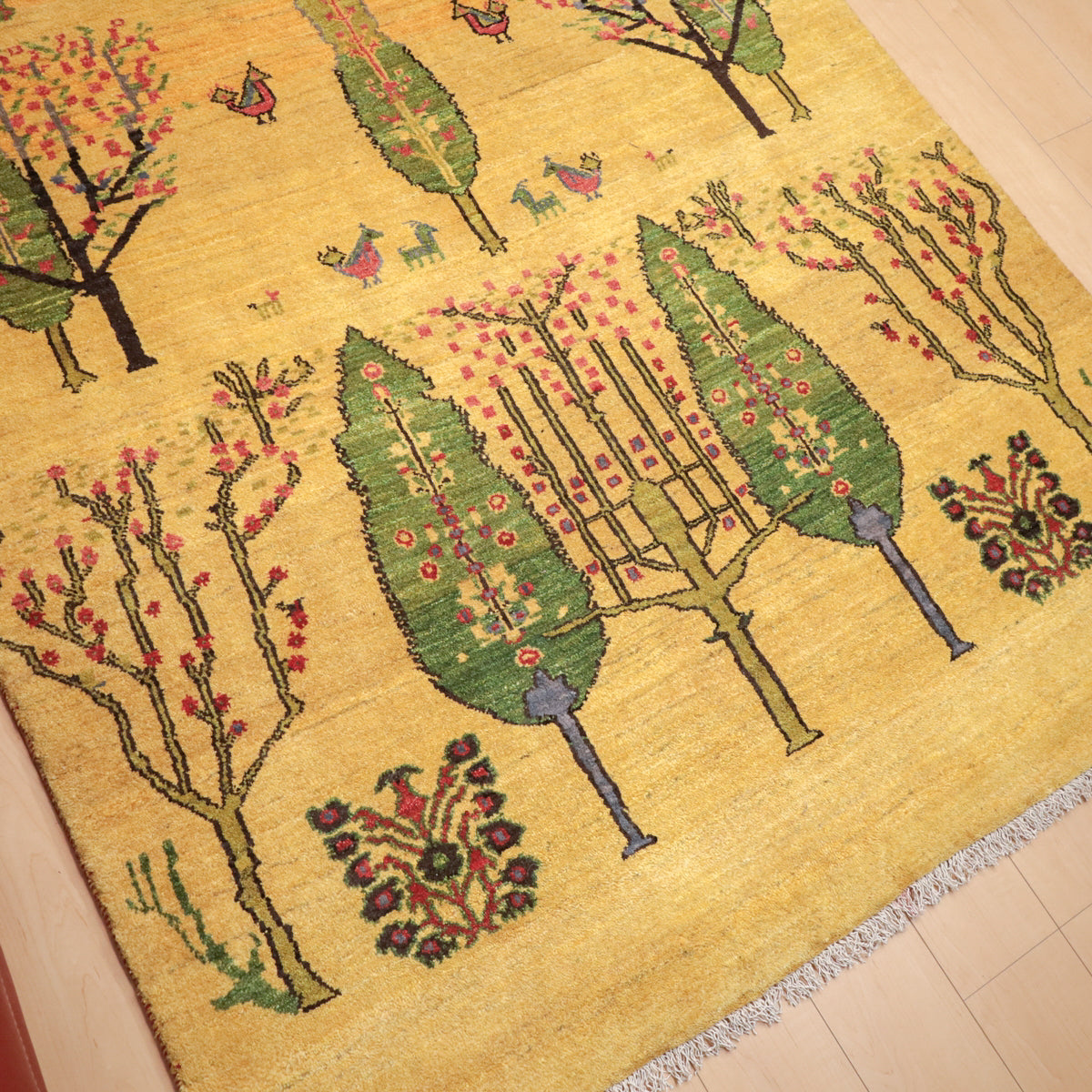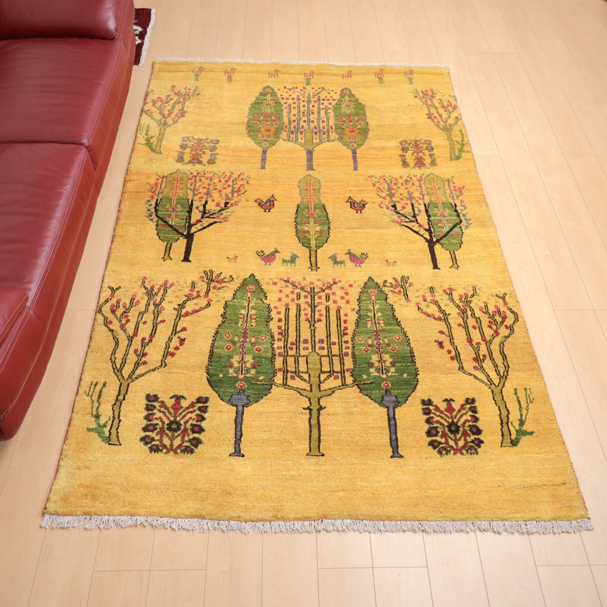 真っ直ぐに伸びる「生命の木」が立ち並び、そして、その下にあつまる動物達。ギャッベの伝統柄の一つ「生命の木」を活き活きと表現したアート・デザインです。明るさと落ち着き感のある黄色が空間をぱっと華やかに彩ります。