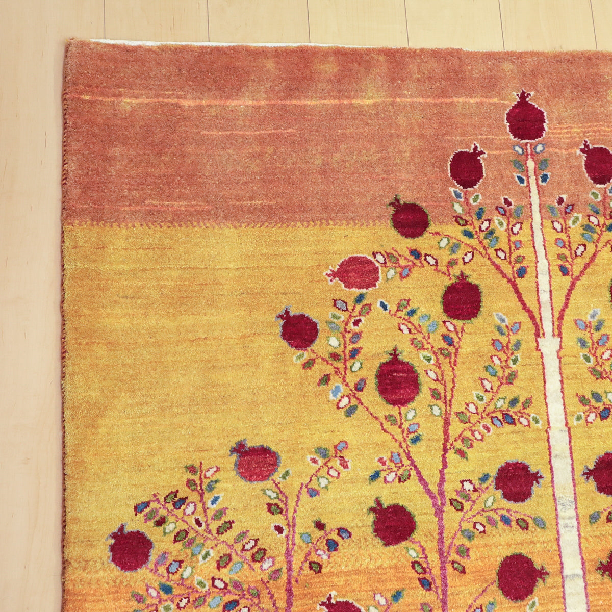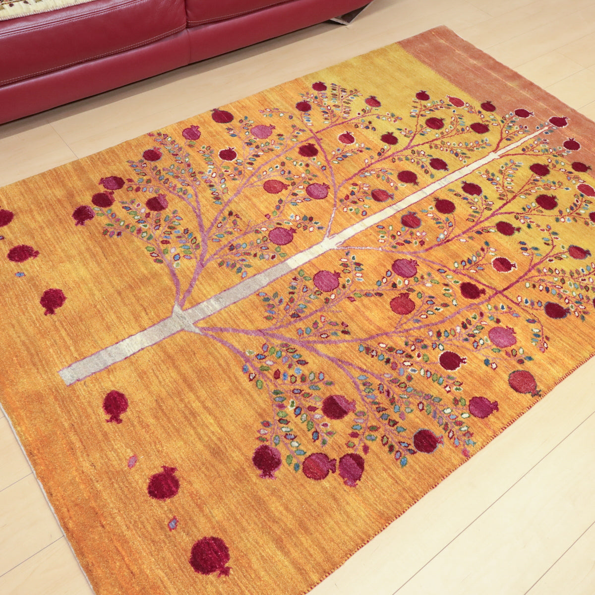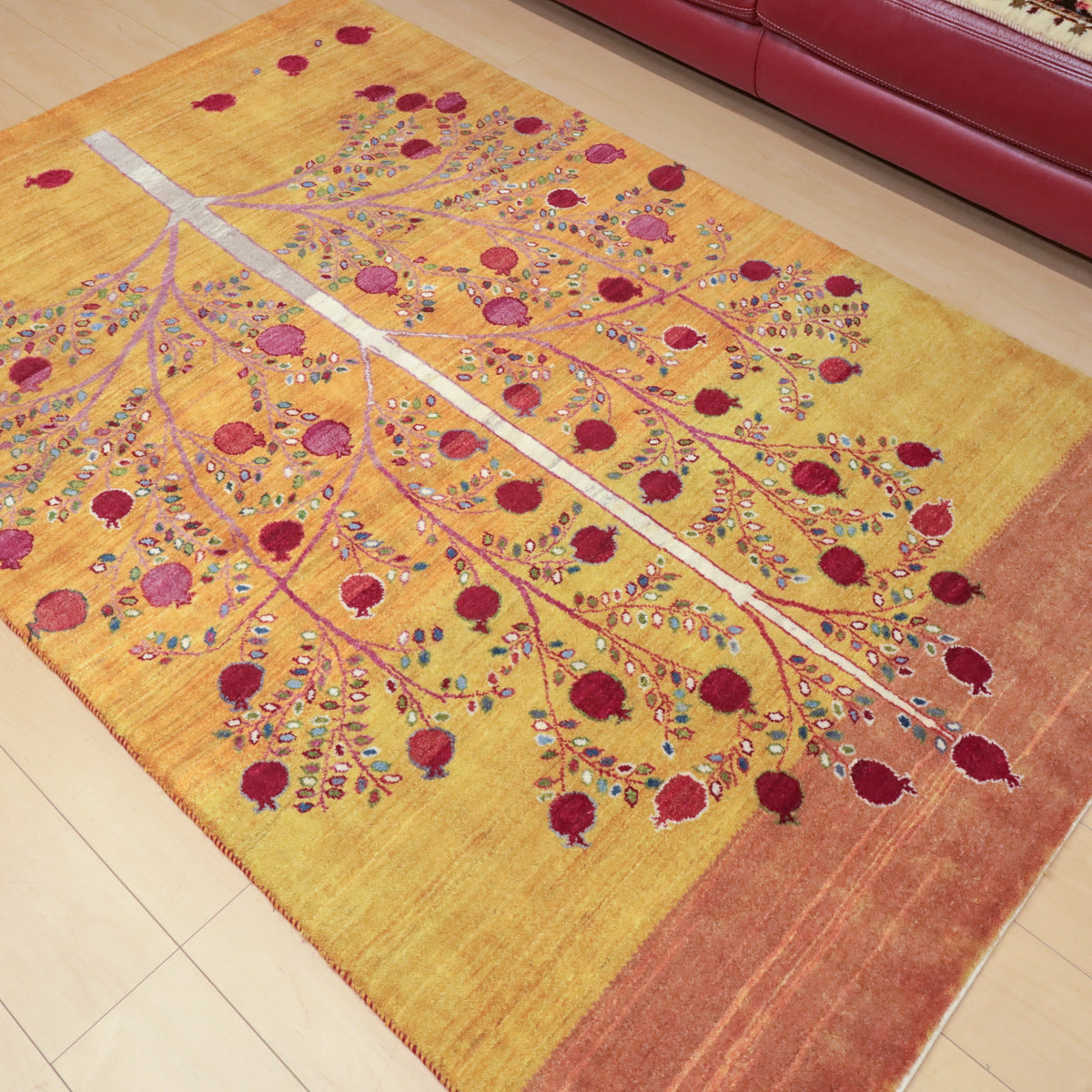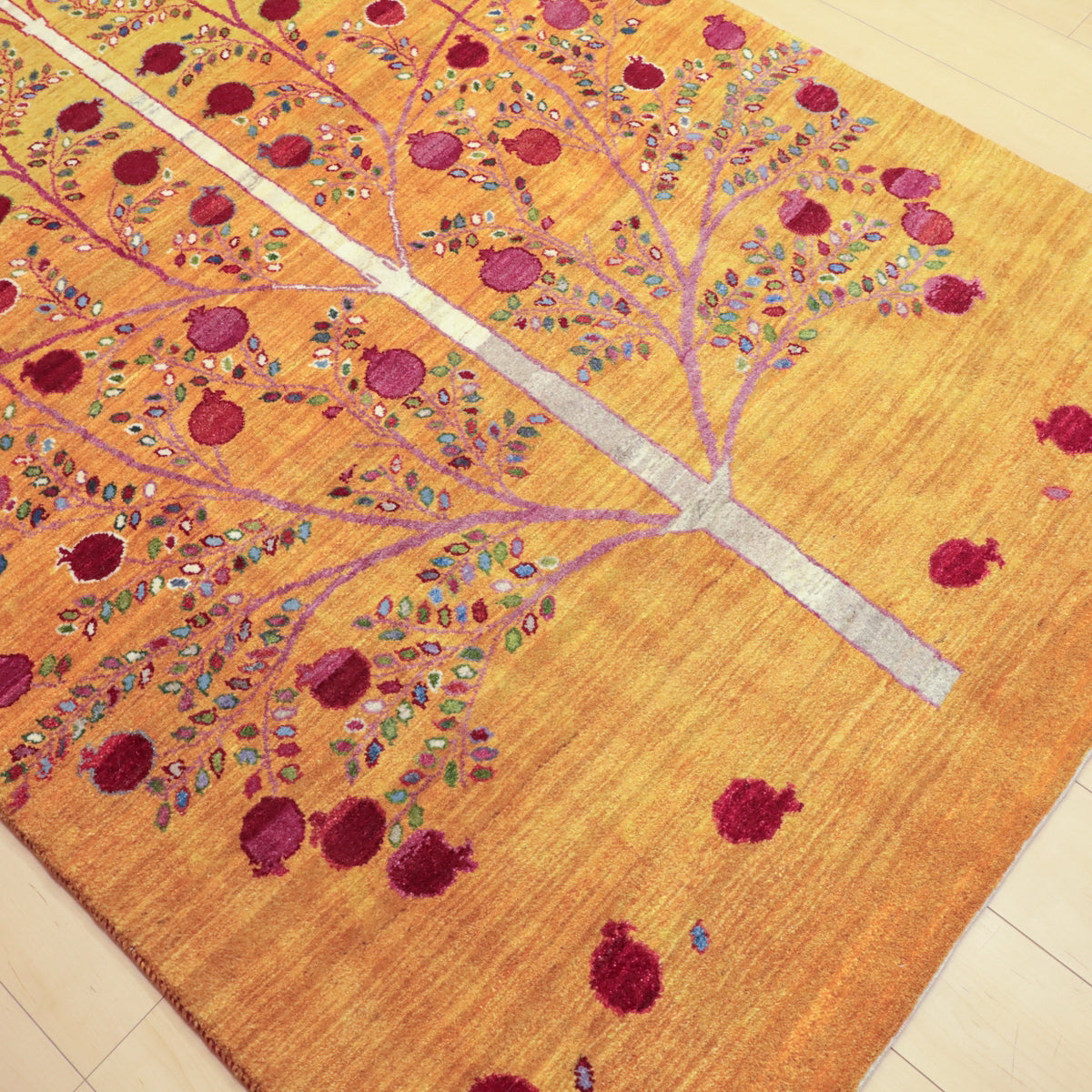 黄色、オレンジ、落ち着いた珊瑚色へと同系色が重なった美しい色の変化が温かみのあるモダンなアートデザイン。柘榴(ザクロ)は、イランでは子宝の薬として身近な食べ物ですが、たわわに実をつけた大きな柘榴(ザクロ)のモチーフには、子孫繁栄の願いも込められています。