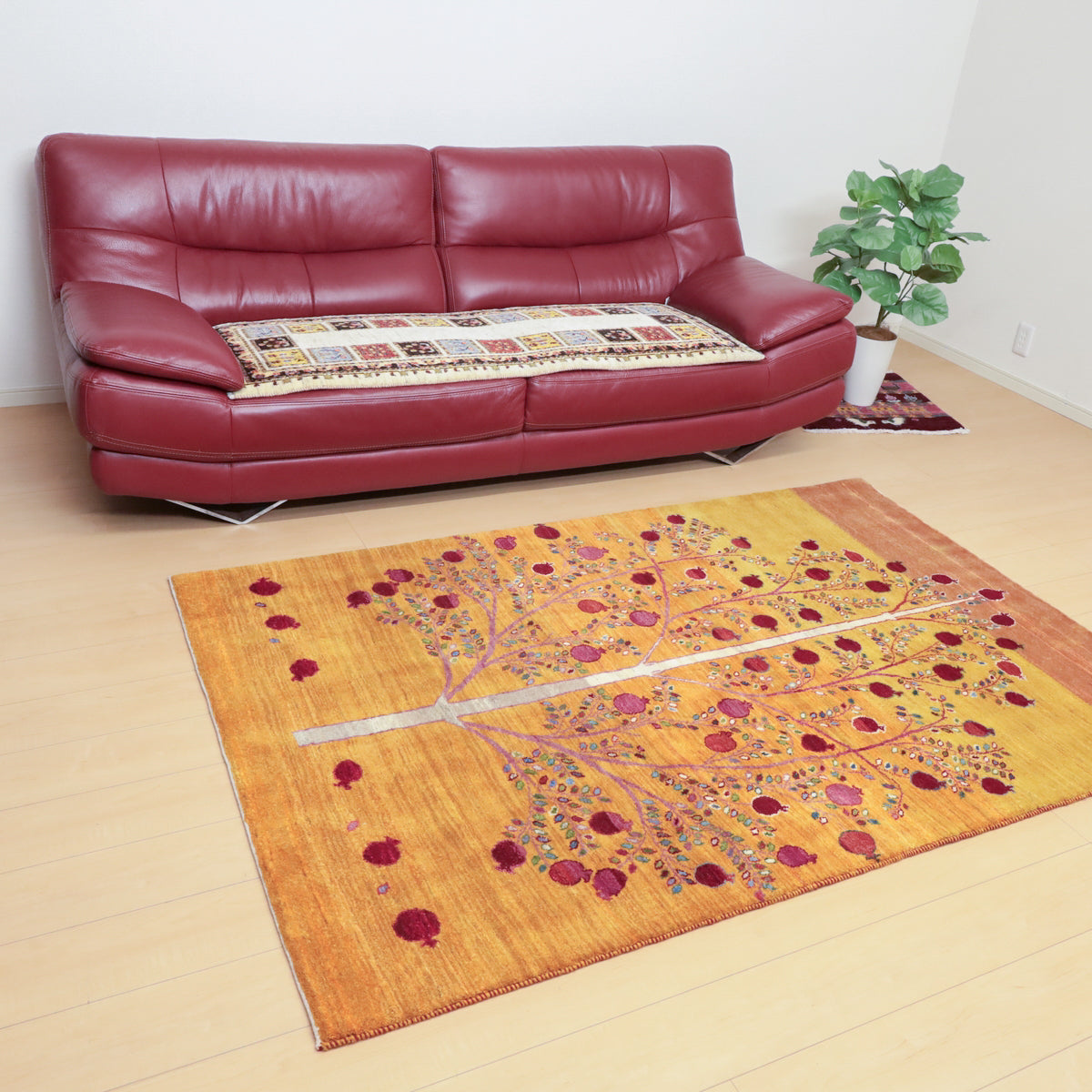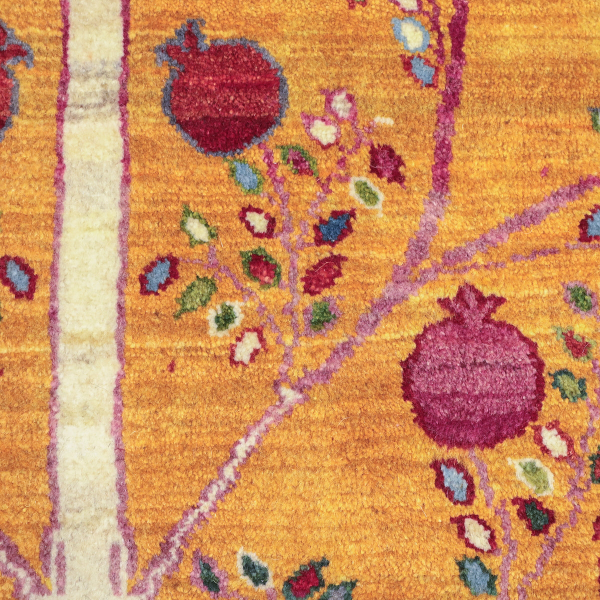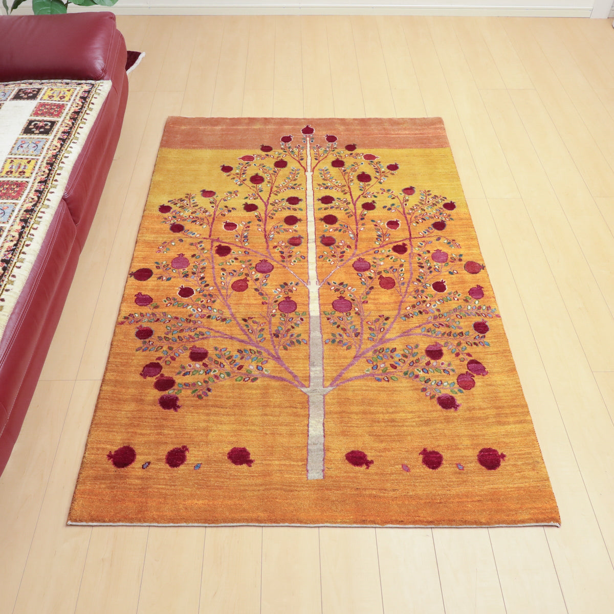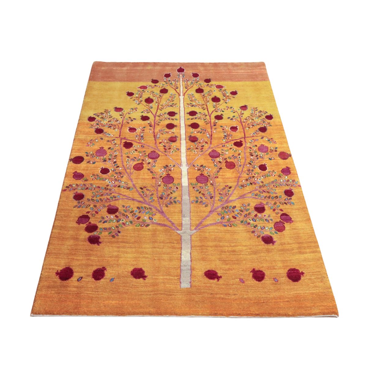 黄色、オレンジ、落ち着いた珊瑚色へと同系色が重なった美しい色の変化が温かみのあるモダンなアートデザイン。柘榴(ザクロ)は、イランでは子宝の薬として身近な食べ物ですが、たわわに実をつけた大きな柘榴(ザクロ)のモチーフには、子孫繁栄の願いも込められています。