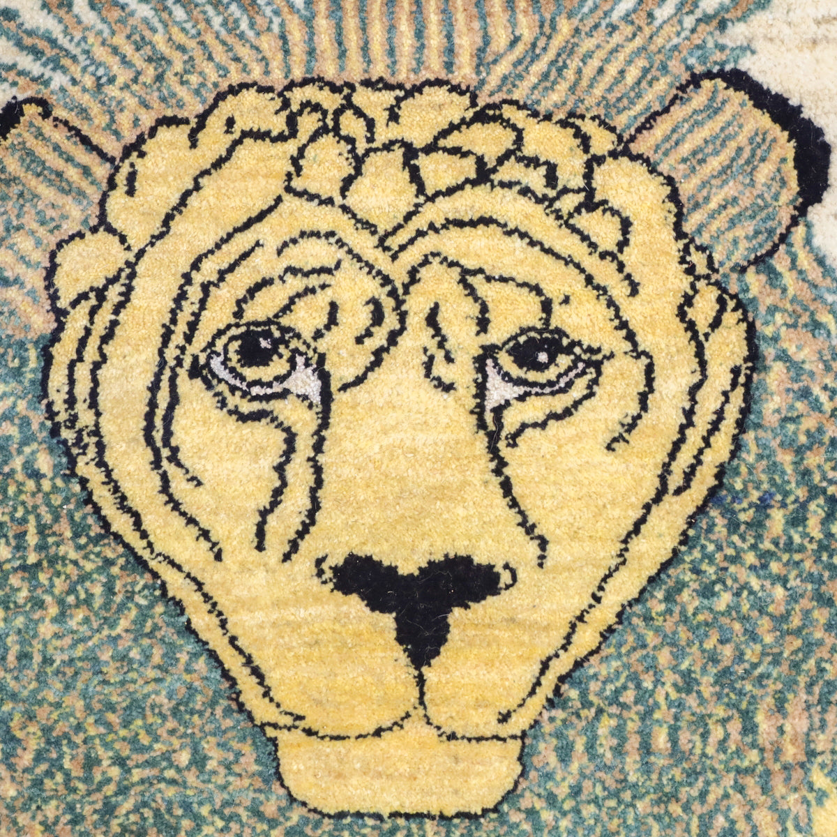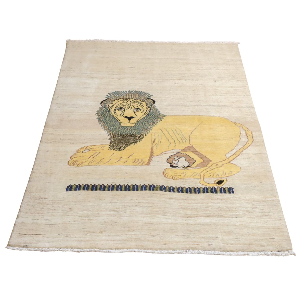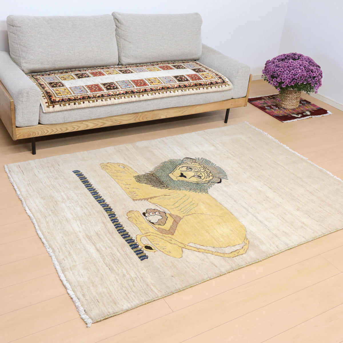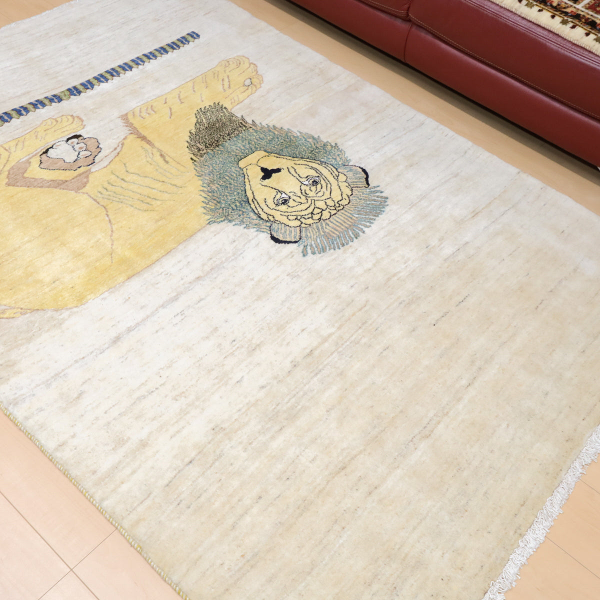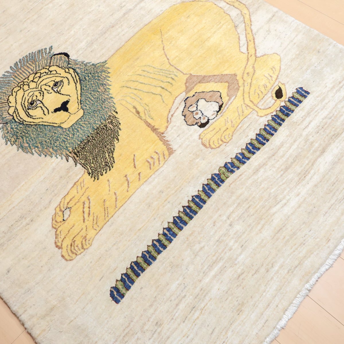 刈り取った羊の毛を染めずにそのままの色を使用した生成りのナチュラルカラーをベースに、ペルシャでは強い者の象徴として人気の動物ライオンが大きく鎮座するインパクトのあるギャッベ。細かな描写が非常にユニークで、床にアートを飾る感覚で使ってください。