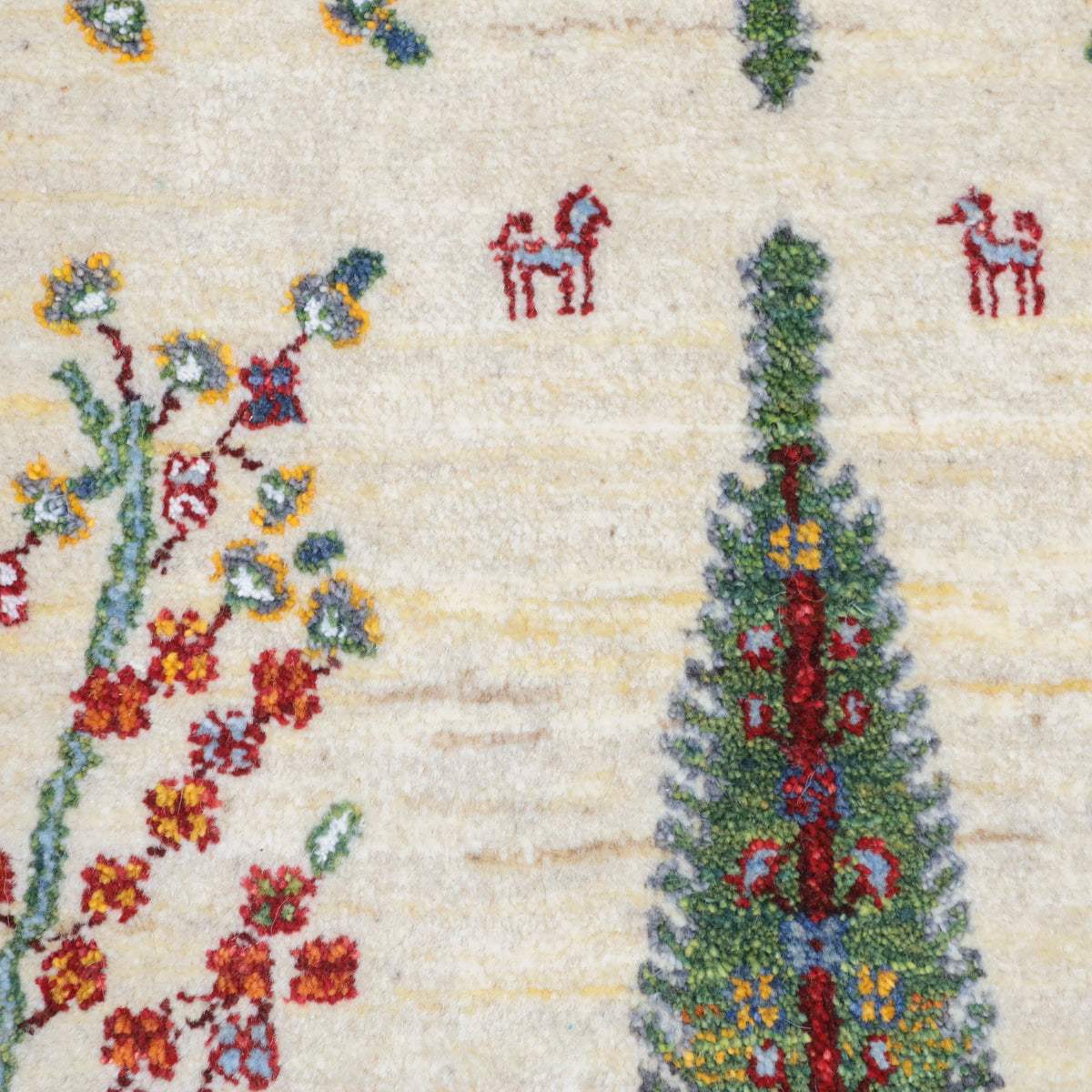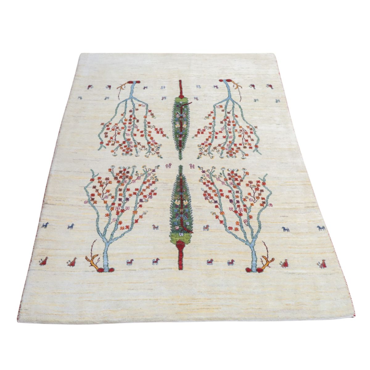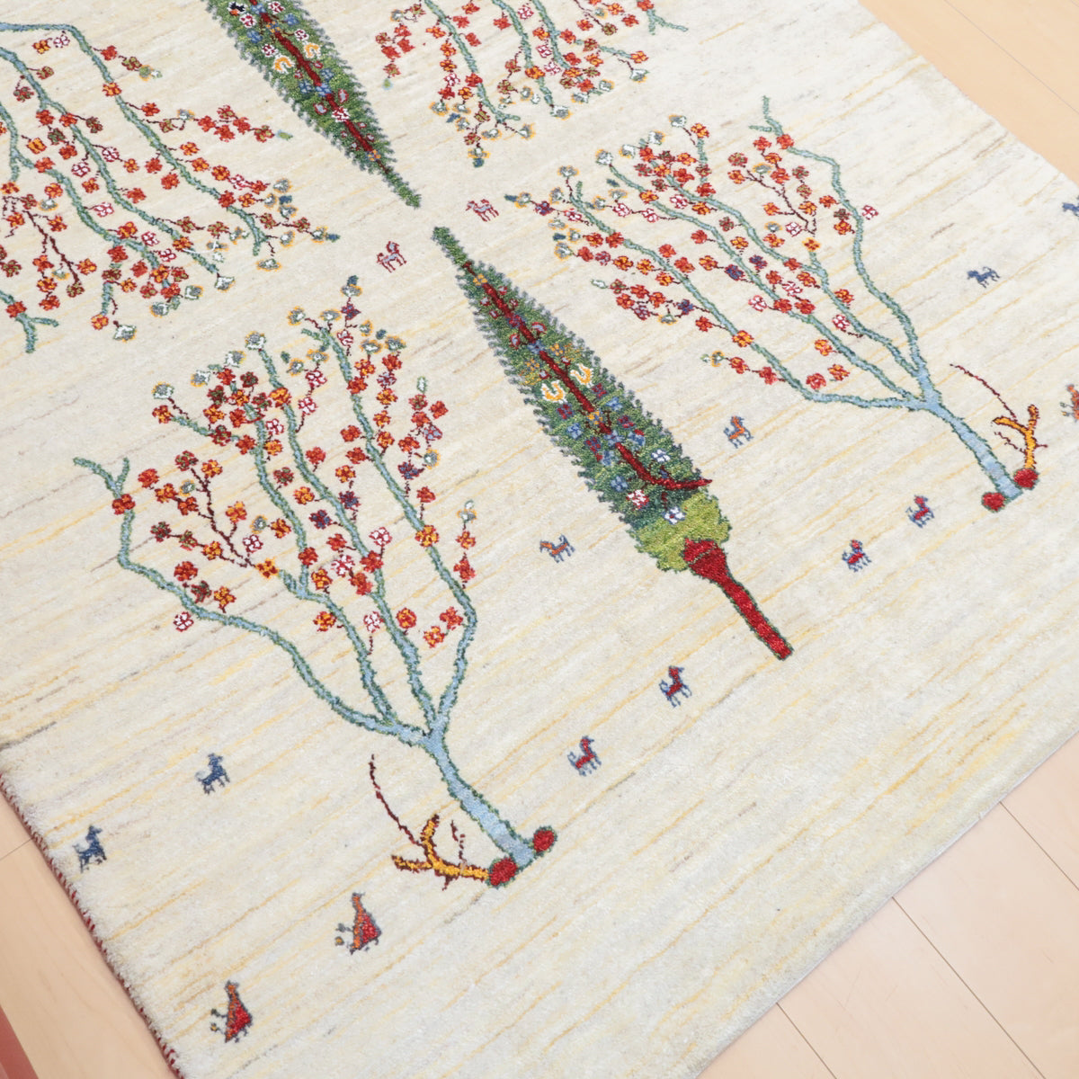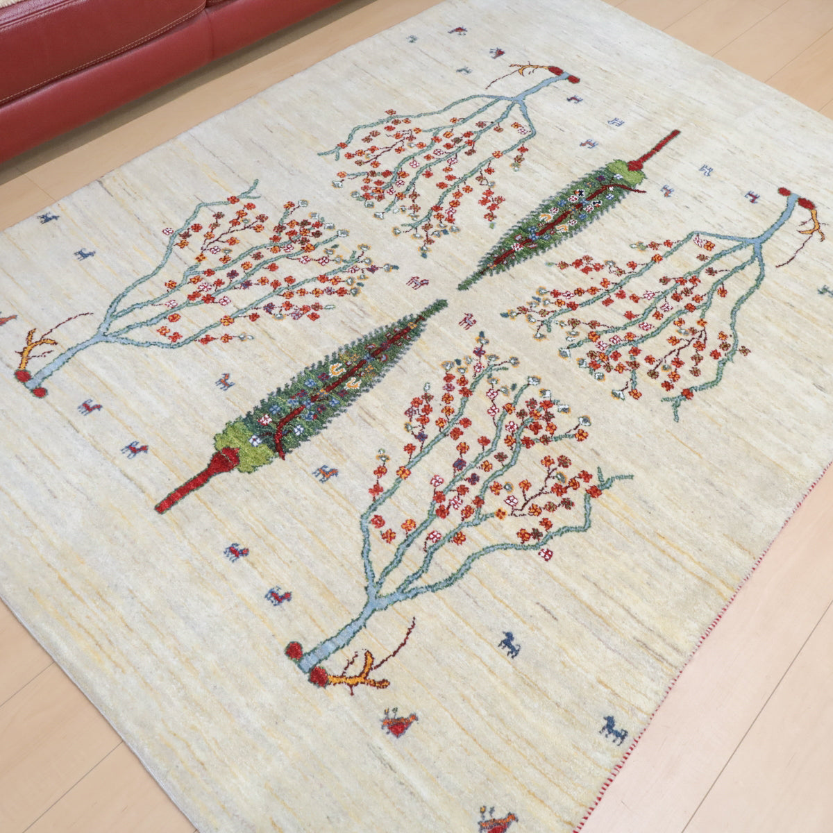 羊の毛色をそのまま活かした無染色の羊色がベースのナチュラルな風合い。生命の木たちが並び、その下に集う動物達。アート・デザインが、敷く場所をやさしく彩ります。ソフトで落ち着いた色合いです。