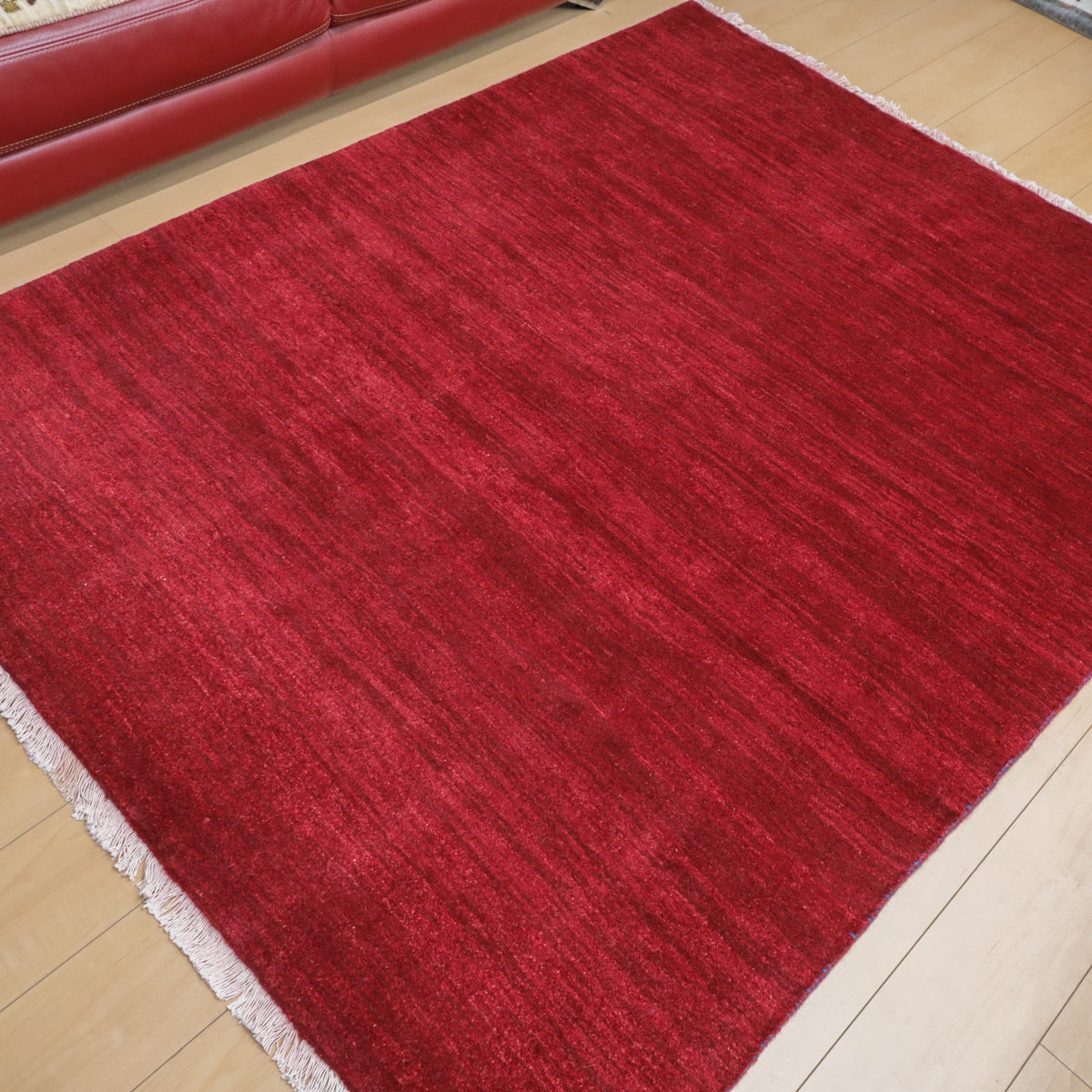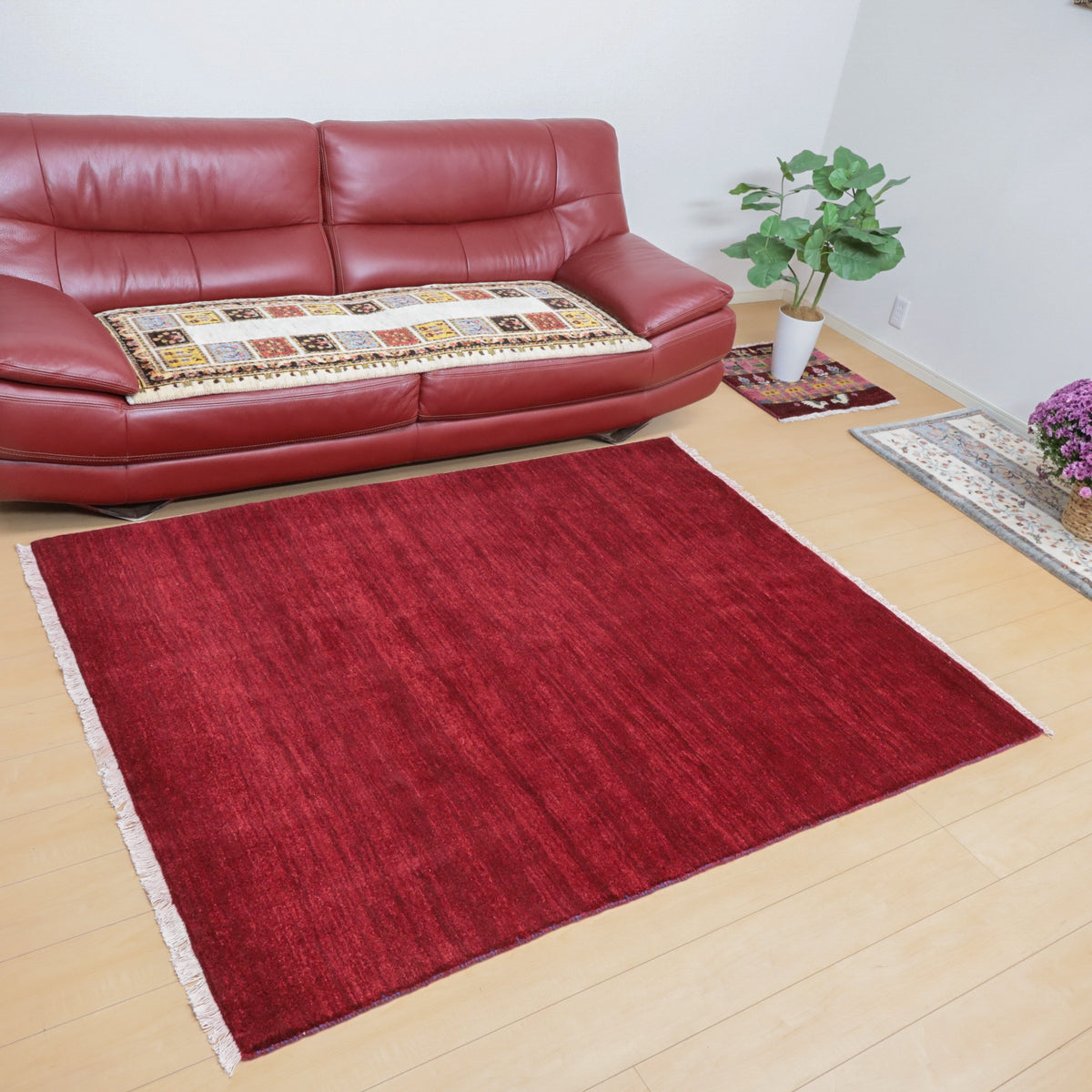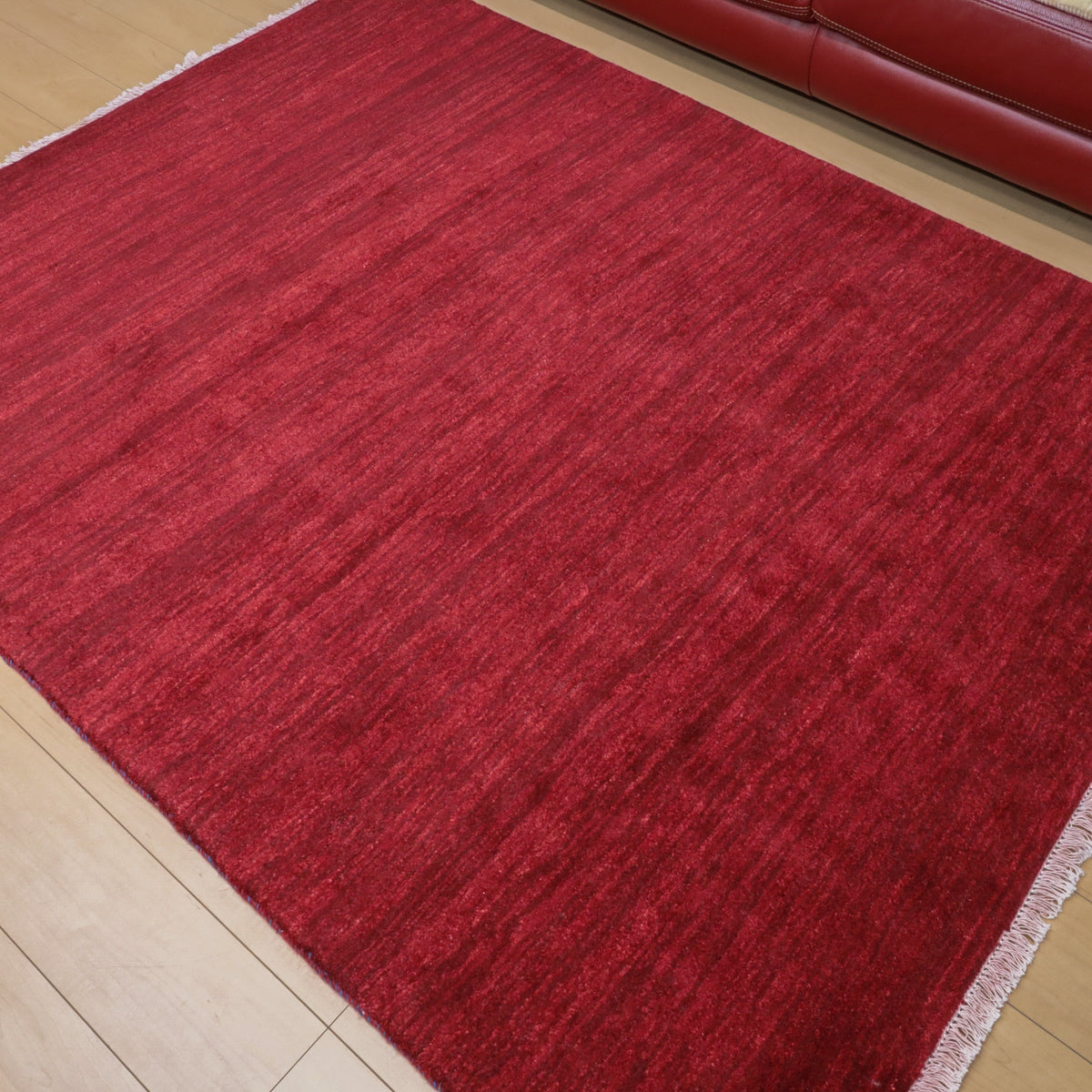 草木染めならではの濃い赤色が落ち着きのあるカラー。やんわりと変化する濃淡のグラデーションを楽しむようなシンプルな無地のギャッベです。細かなアブラシ(色のグラデーション)が全体に入って、イランのギャッベならではの美しい色の揺らぎを楽しむようなお品です。