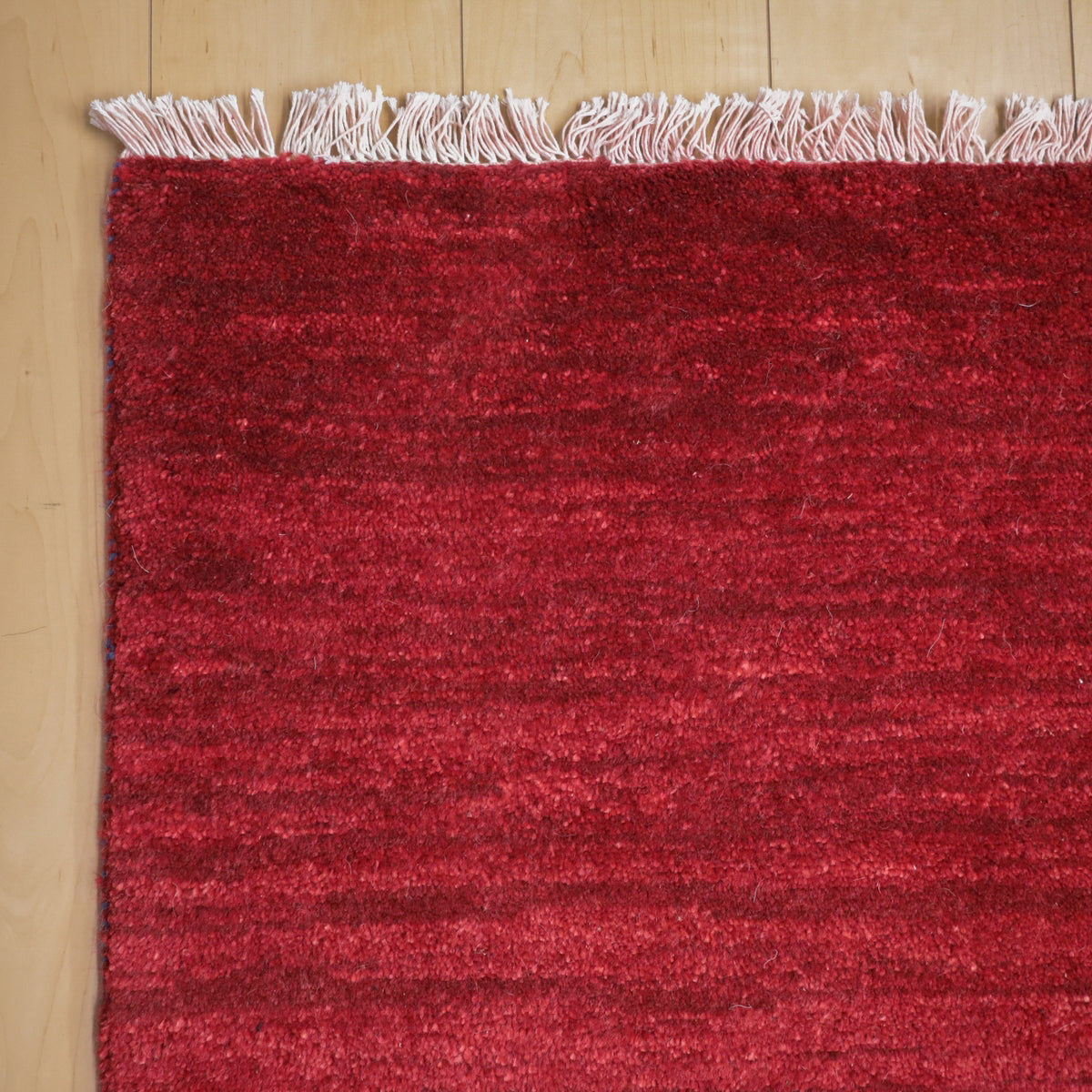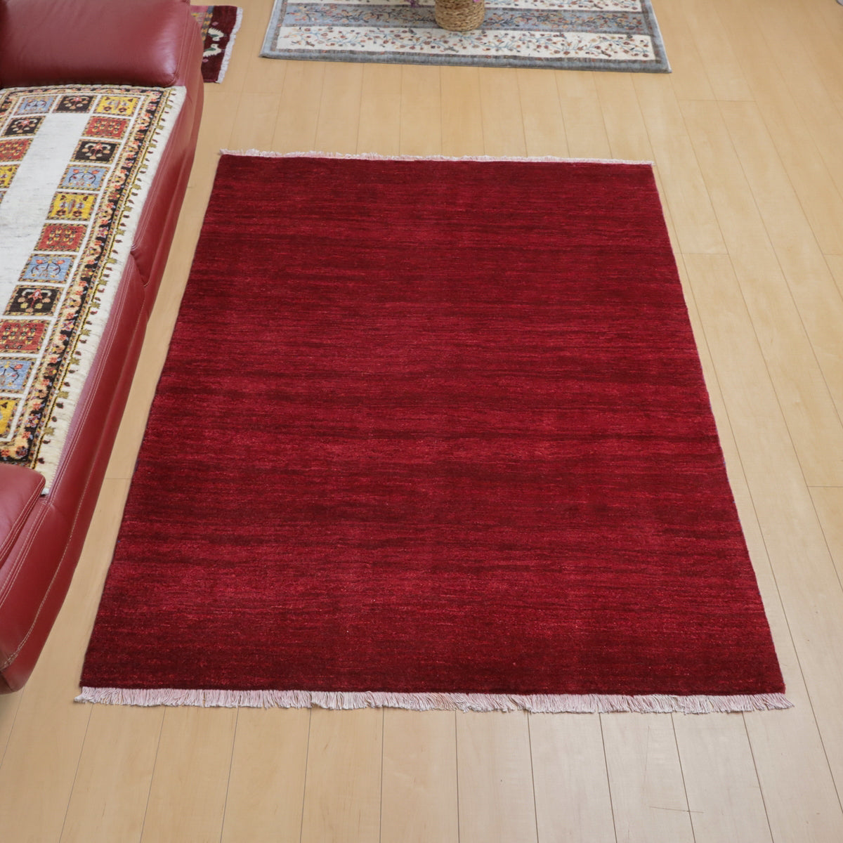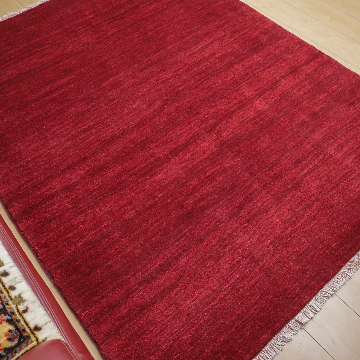 草木染めならではの濃い赤色が落ち着きのあるカラー。やんわりと変化する濃淡のグラデーションを楽しむようなシンプルな無地のギャッベです。細かなアブラシ(色のグラデーション)が全体に入って、イランのギャッベならではの美しい色の揺らぎを楽しむようなお品です。