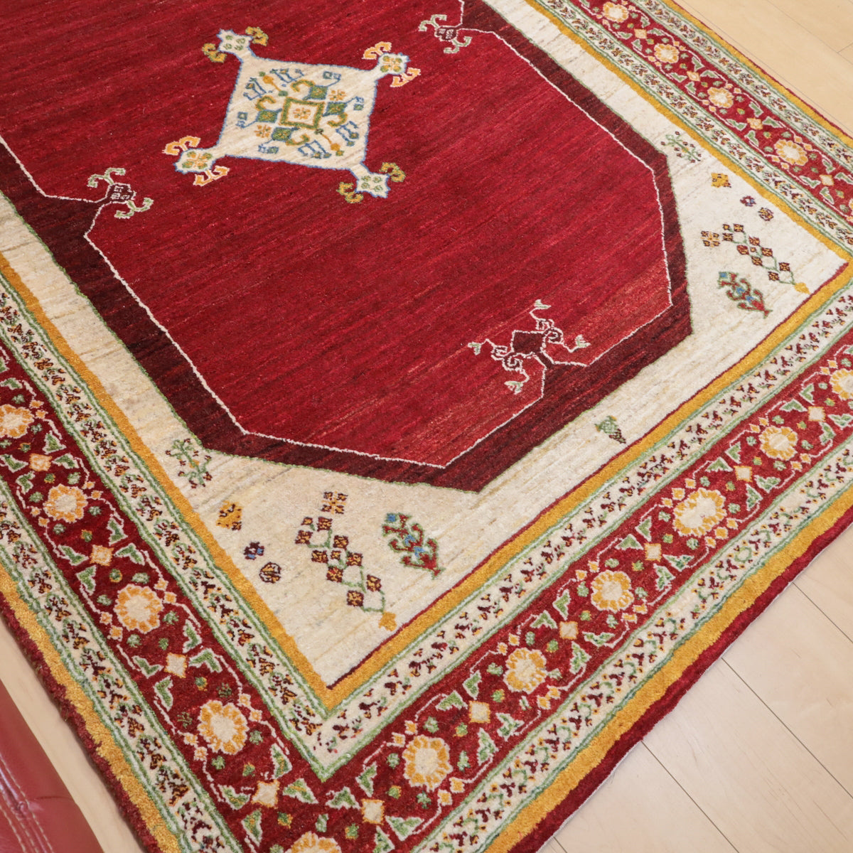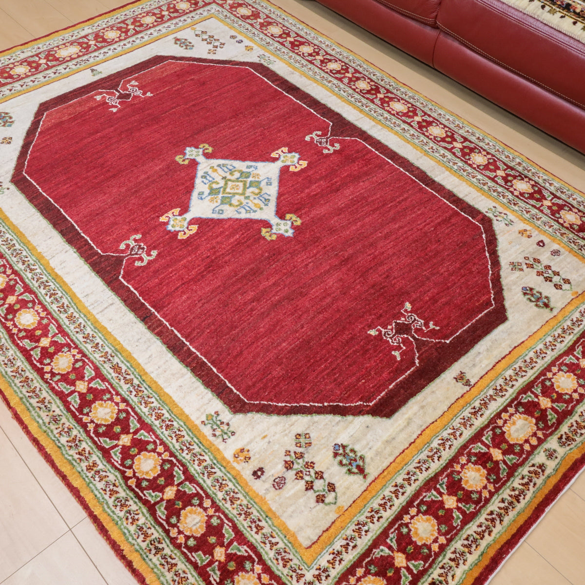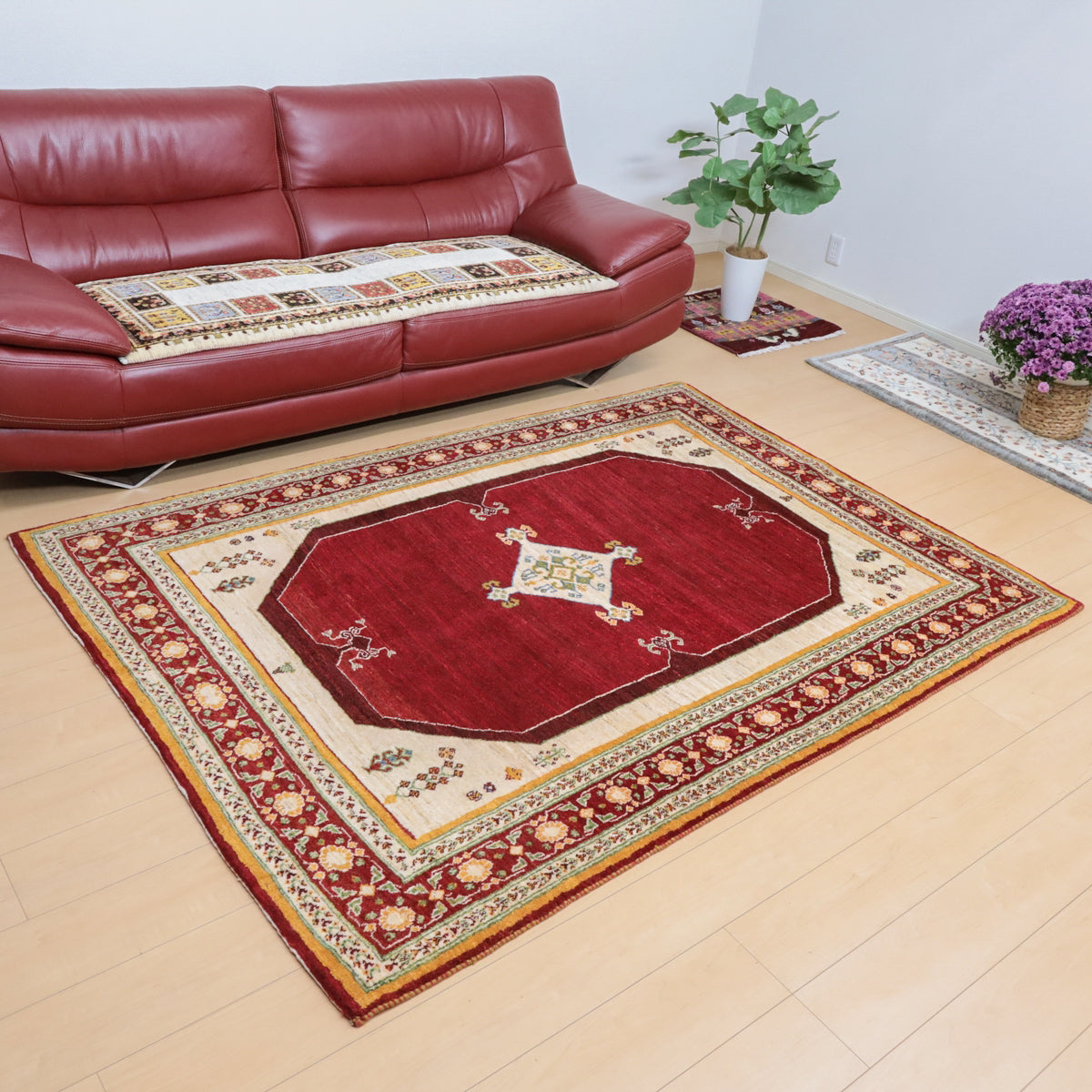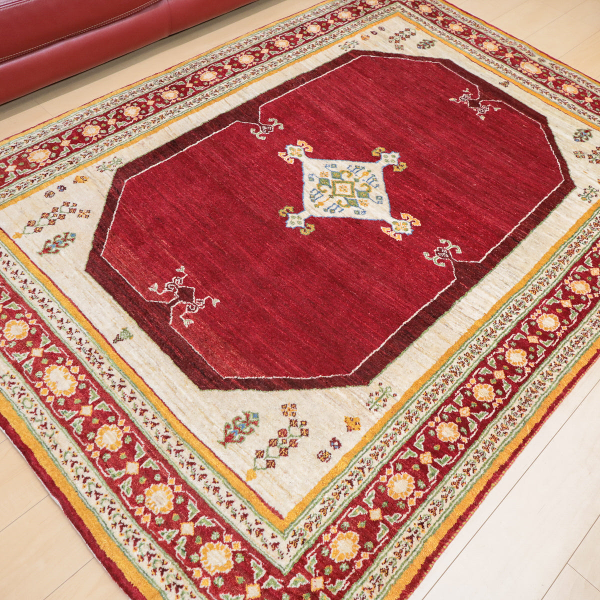落ち着きのある赤色と無染色の原毛ウールを使用した温かみのあるナチュラルな雰囲気。メダリオンコーナーの伝統的なデザインはどの方向から見ても美しく見え、センターテーブルを置いてもおさまりの良い使いやすいデザインです。やさしく上品なギャッベ。