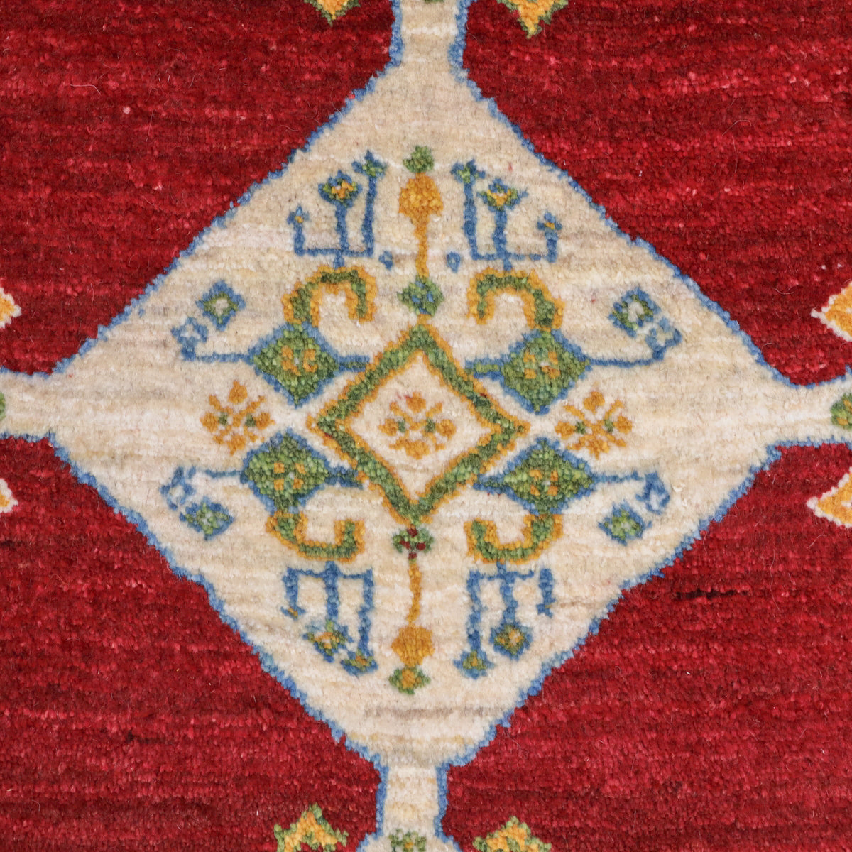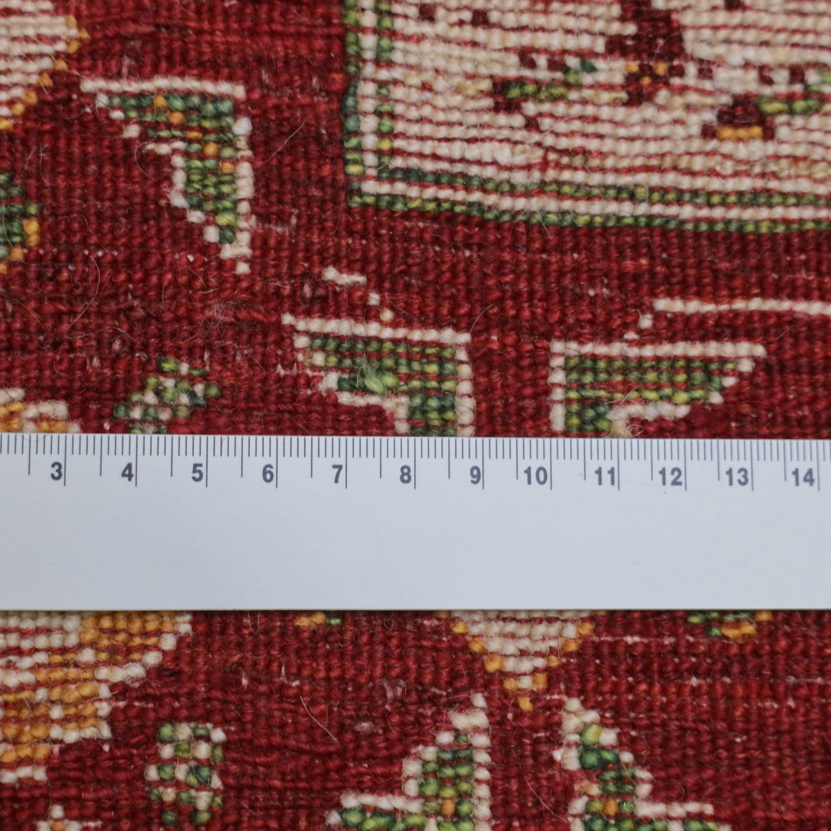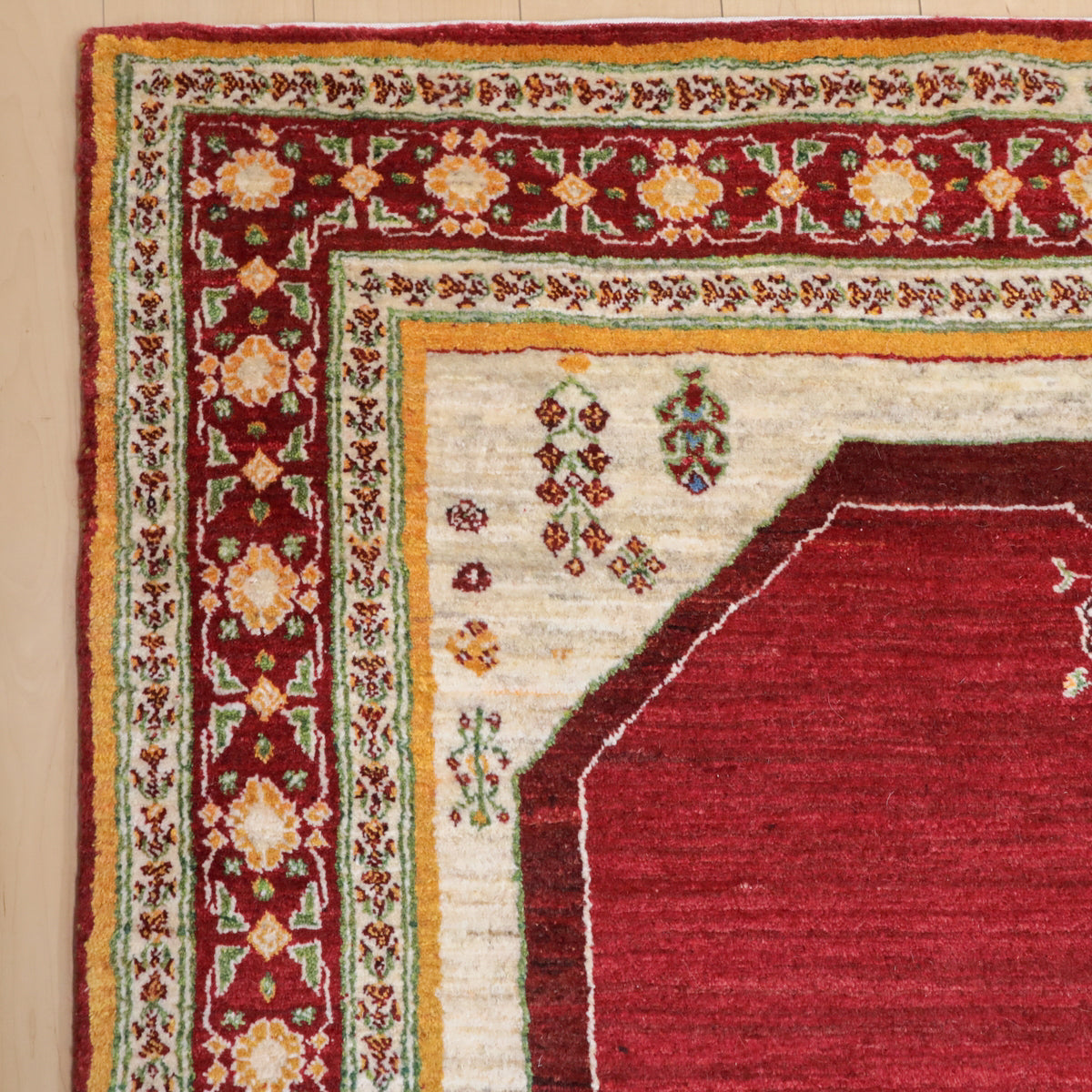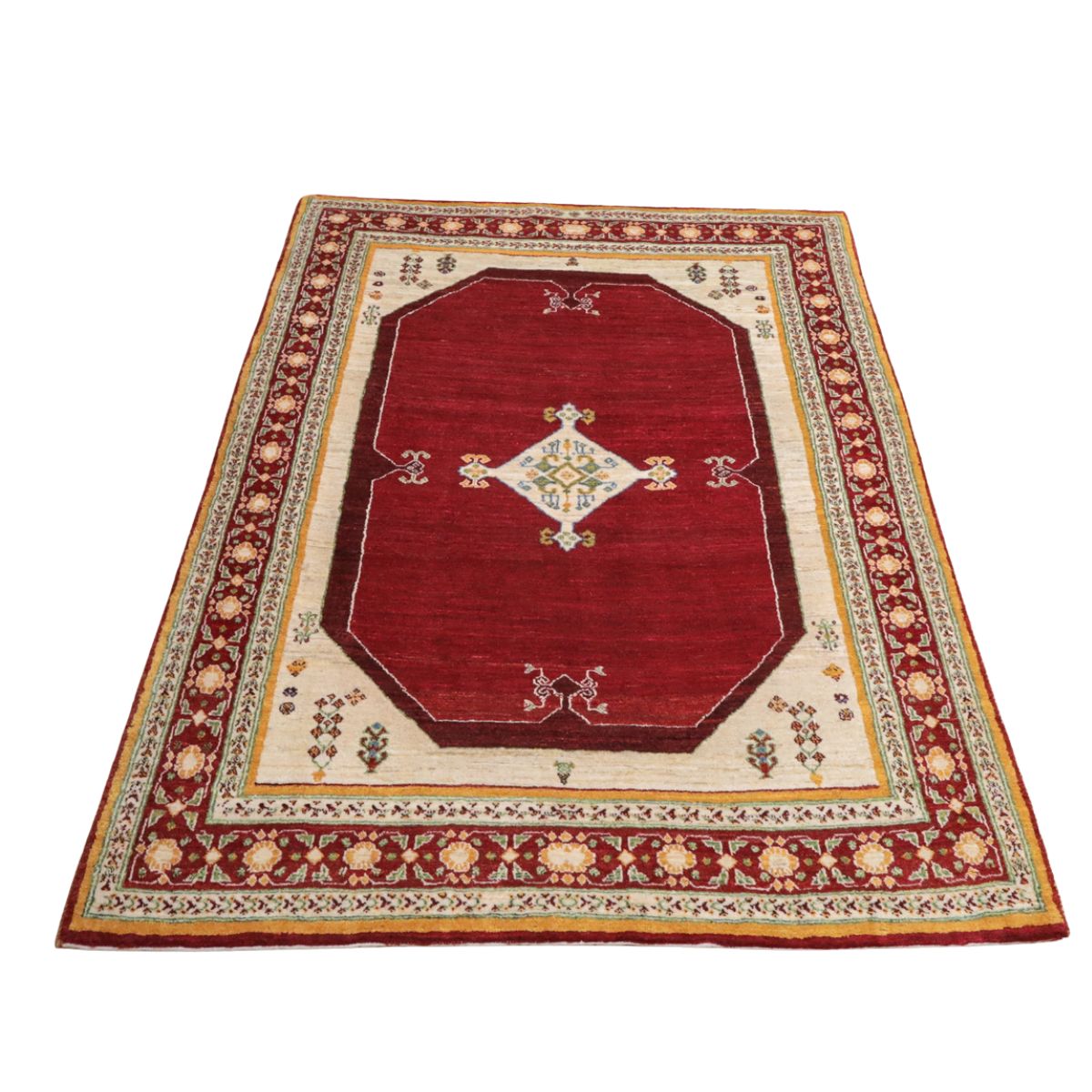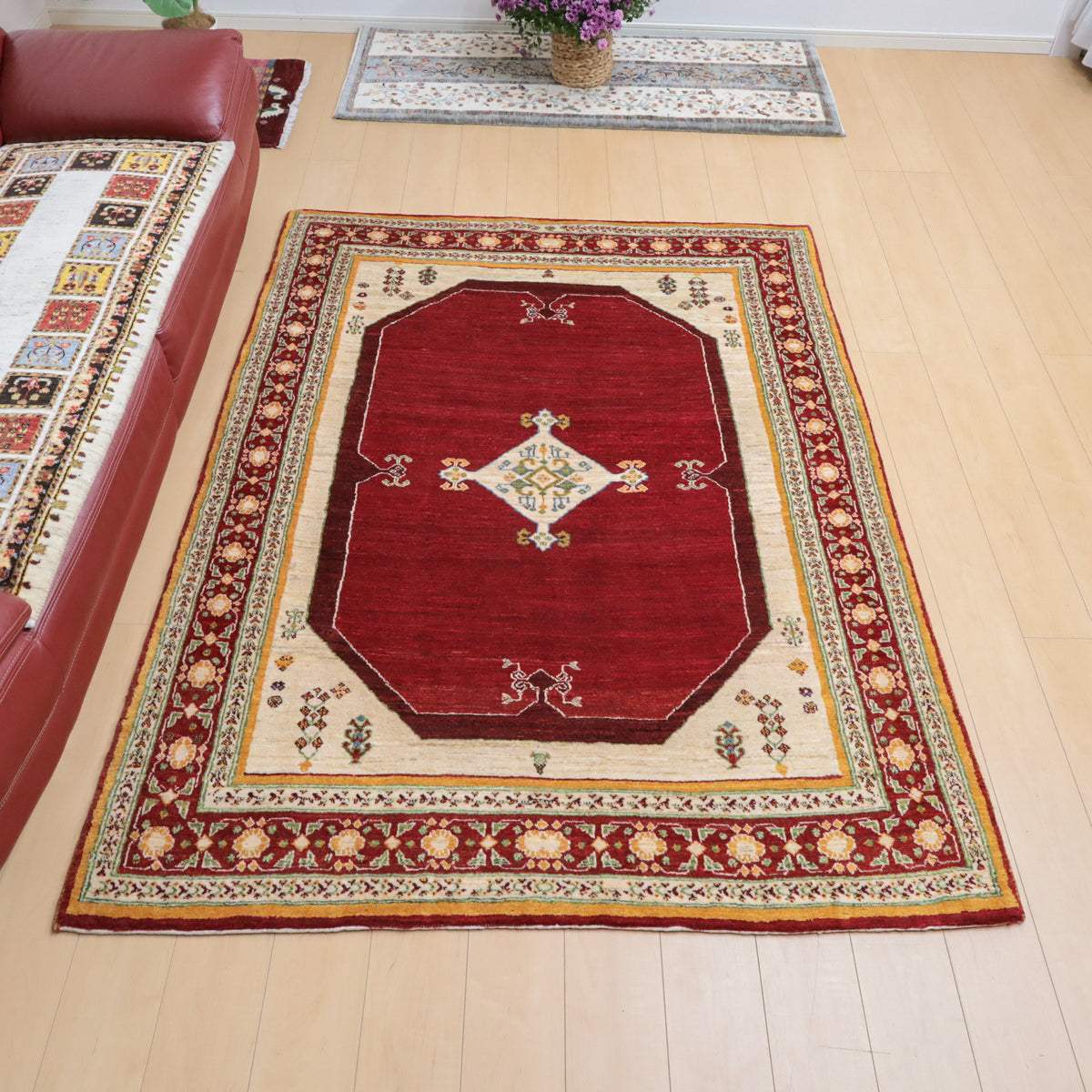 落ち着きのある赤色と無染色の原毛ウールを使用した温かみのあるナチュラルな雰囲気。メダリオンコーナーの伝統的なデザインはどの方向から見ても美しく見え、センターテーブルを置いてもおさまりの良い使いやすいデザインです。やさしく上品なギャッベ。