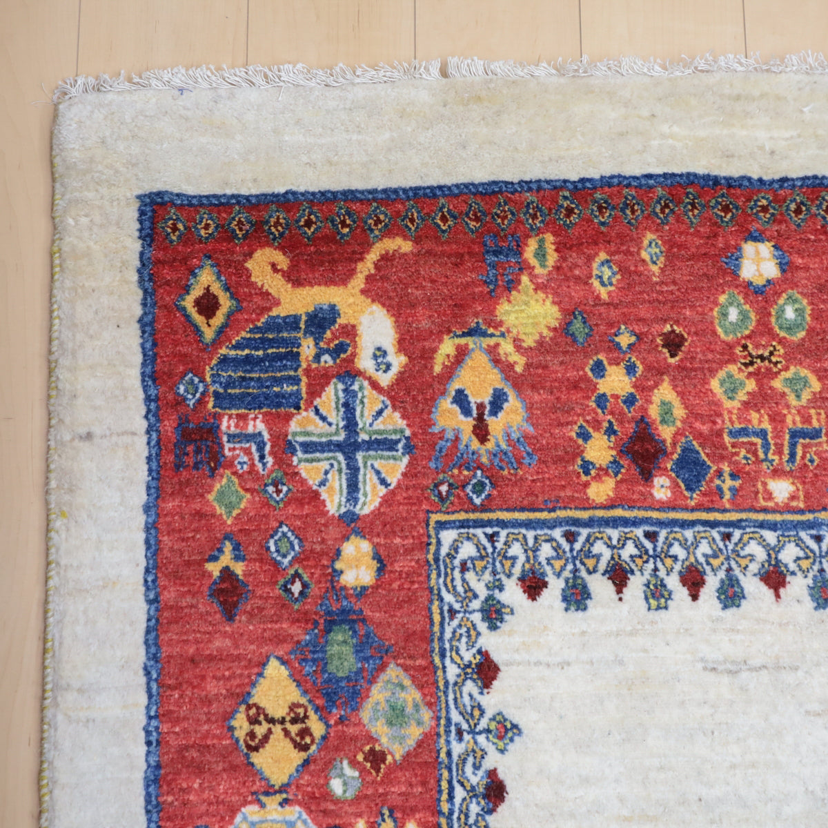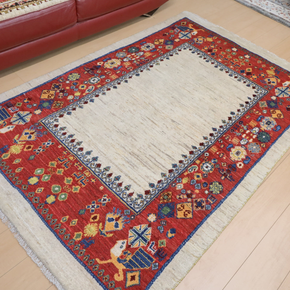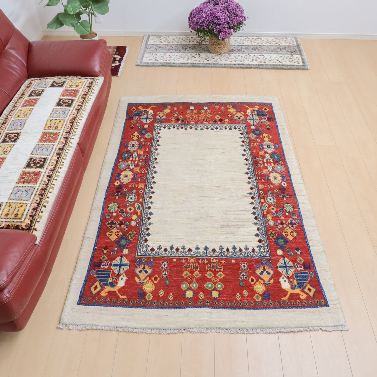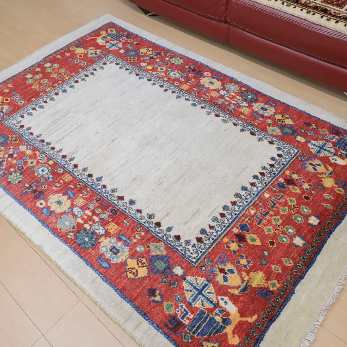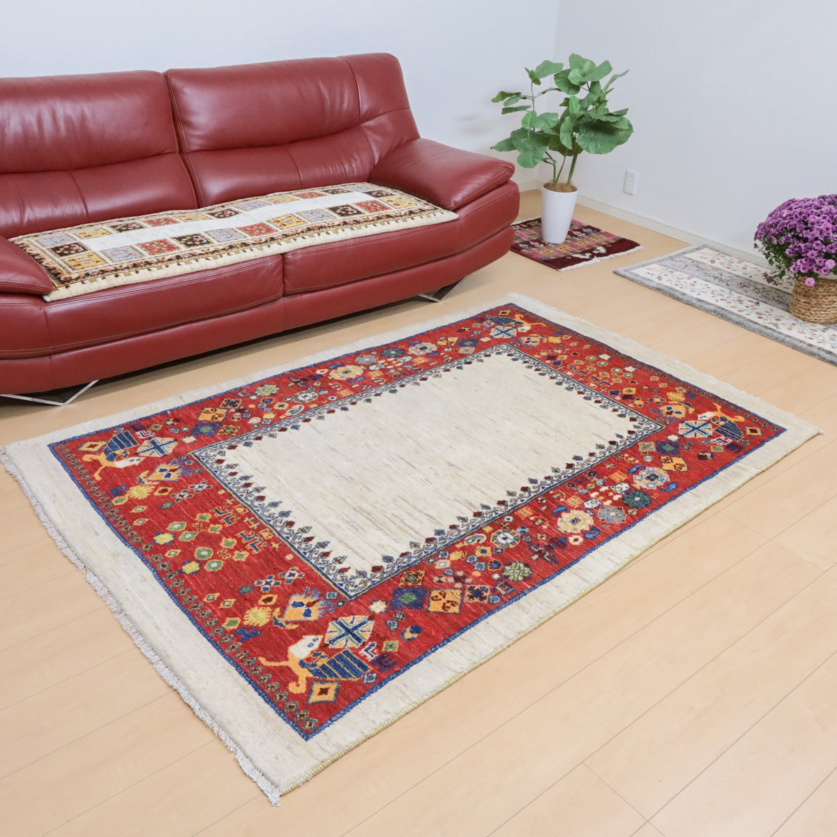 羊の毛色をそのまま活かした無染色の羊色に赤茶の枠デザイン。やや不規則に散りばめられたモチーフは動きのある明るい雰囲気でお部屋を和やかな癒しの空間にしてくれます。どの方向から見ても美しく見え、センターテーブルを置いてもおさまりの良い使いやすいデザインです。