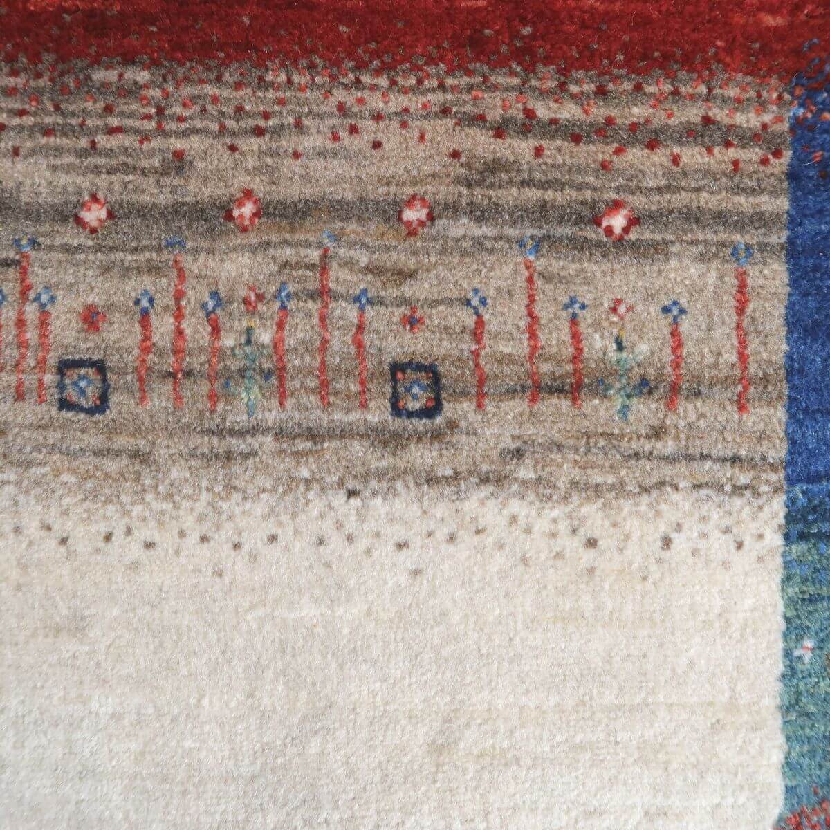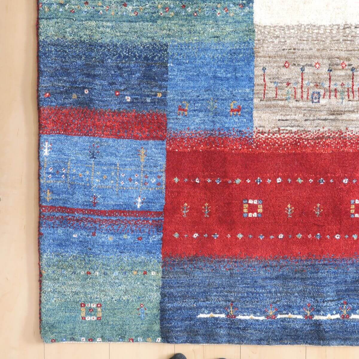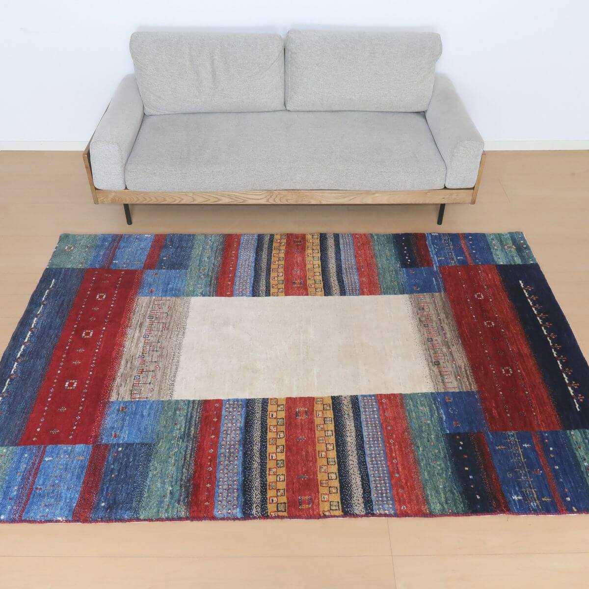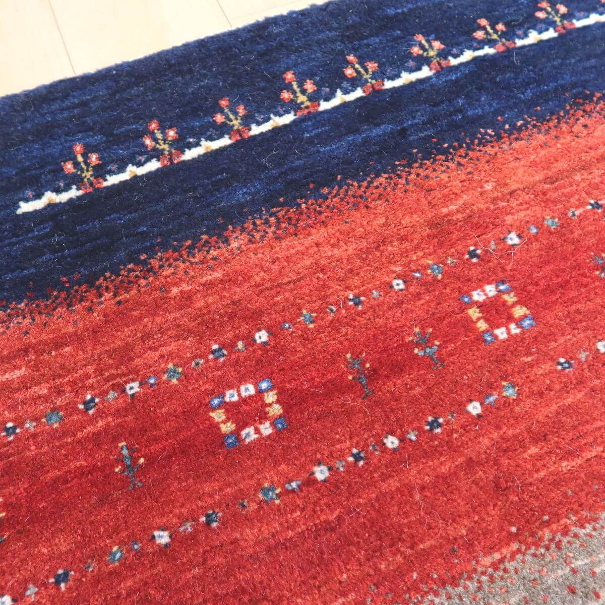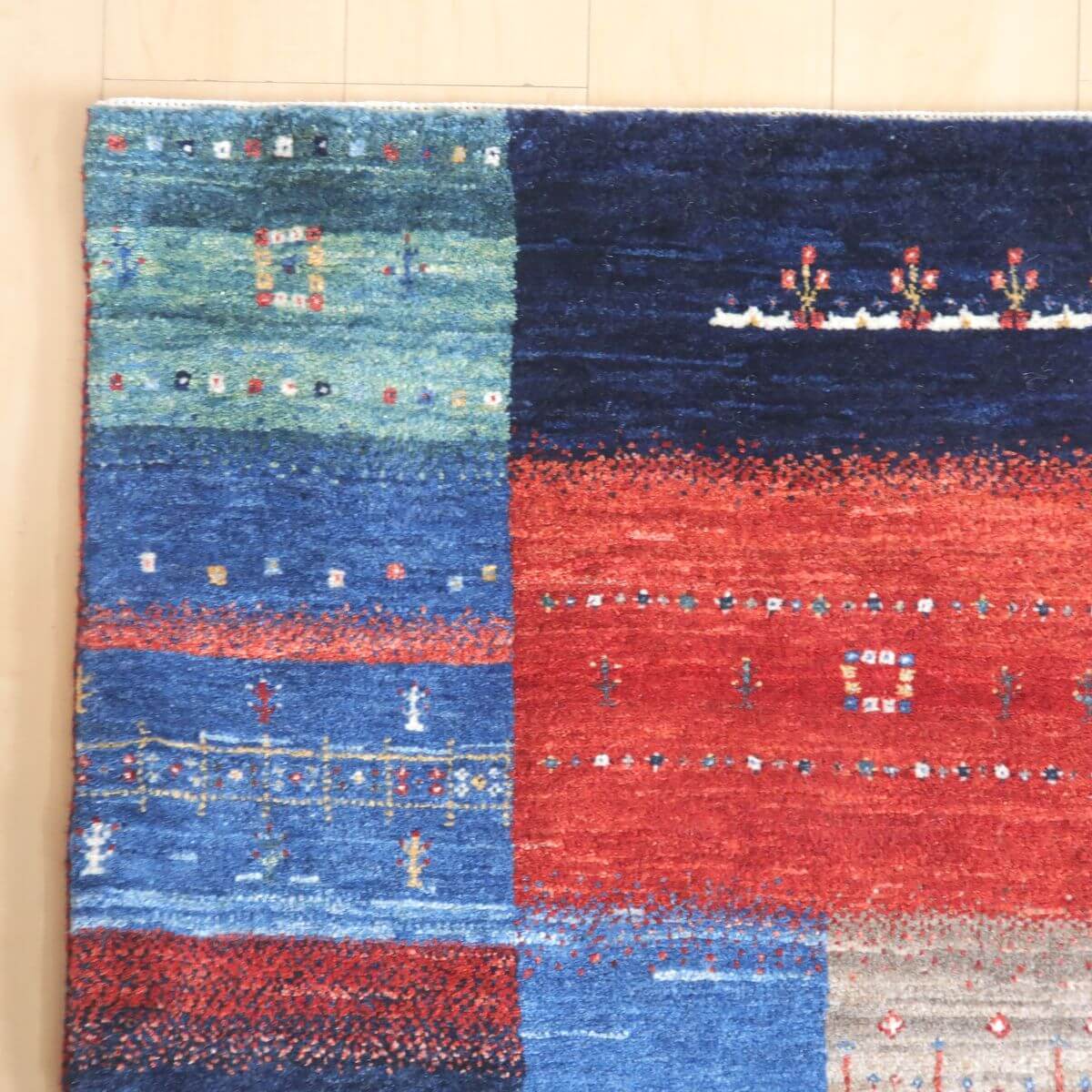ギャッベの基本の5色に、濃紺が入ってきゅっと締まったスタイリッシュな印象。ギャッベ特有の落ち着いた温かみのある風合いとモダンさが上手くマッチしたアートデザインです。