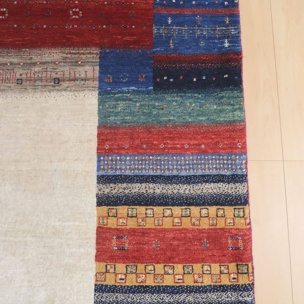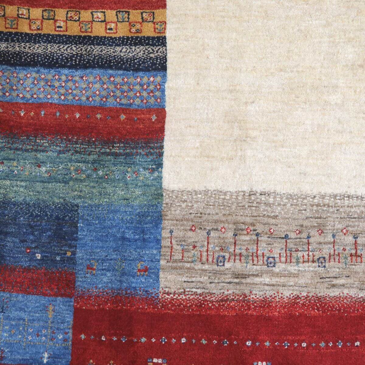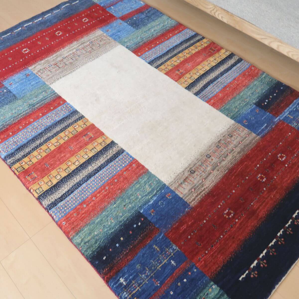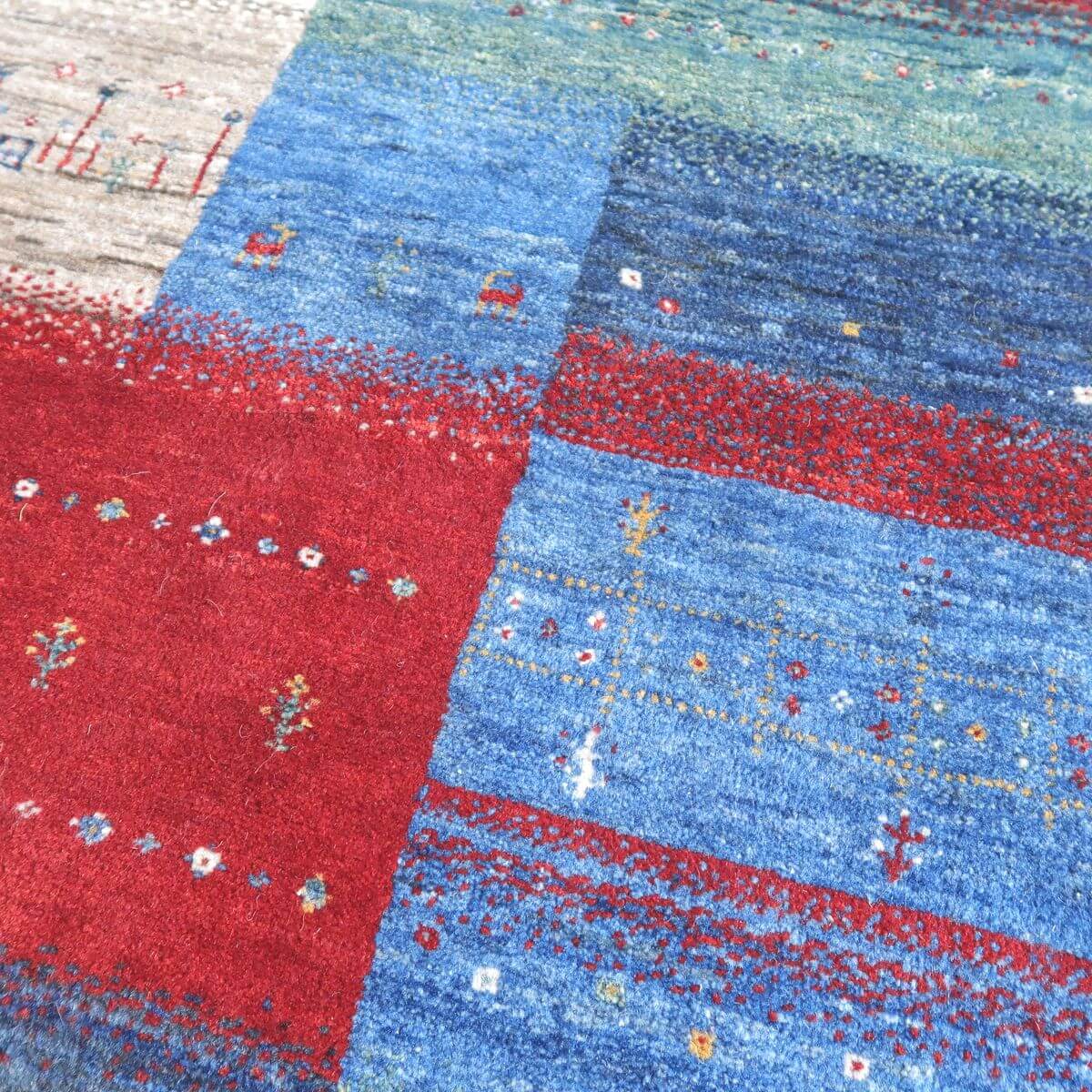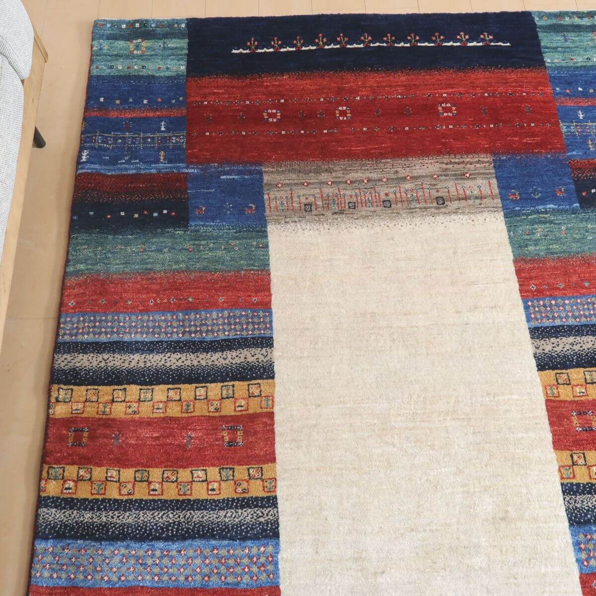 ギャッベの基本の5色に、濃紺が入ってきゅっと締まったスタイリッシュな印象。ギャッベ特有の落ち着いた温かみのある風合いとモダンさが上手くマッチしたアートデザインです。