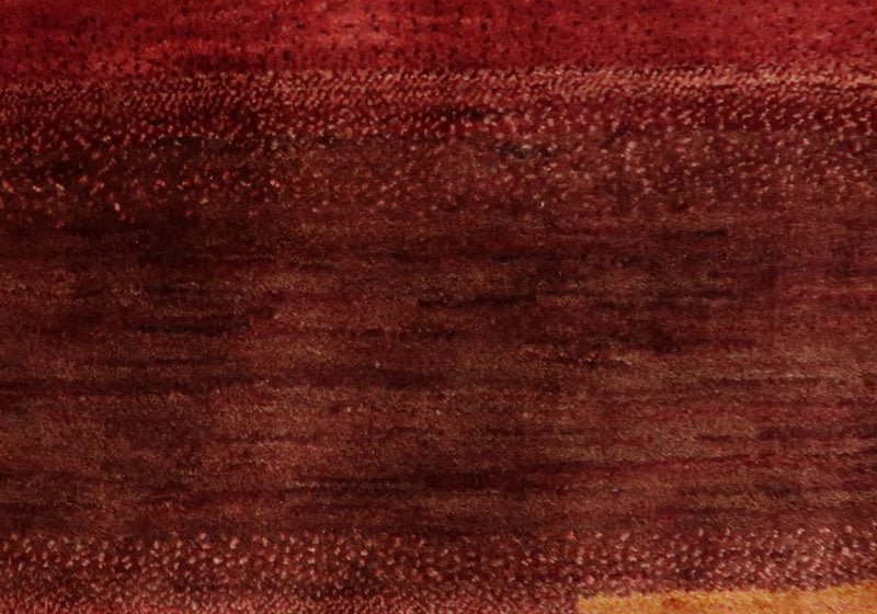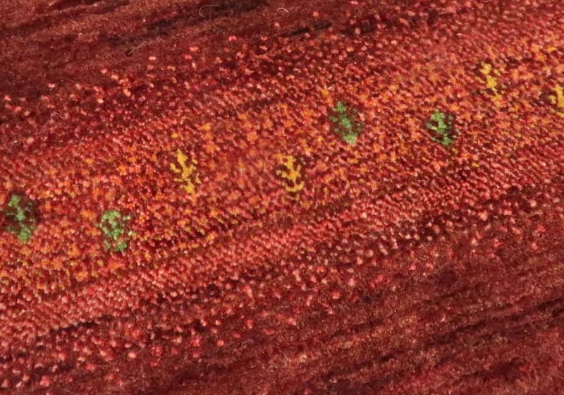濃い赤から赤、薄桃色、同系色のつながりある色をグラデーションを持たせて切り替え、浮かび上がるような枠柄にデザインした美しい色のつながりは、大自然の遊牧風景を連想させてくれます。小さく可愛らしい生命の木などのモチーフがリズミカルなアクセント。シンプルでスタイリッシュなデザインは、草木染の馴染むような落ち着いた色合いとギャッベ特有の手仕事の温かい風合いも合わせ持っています。