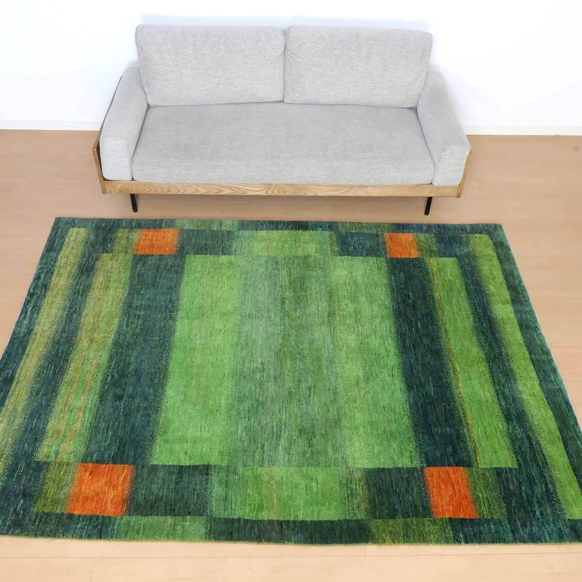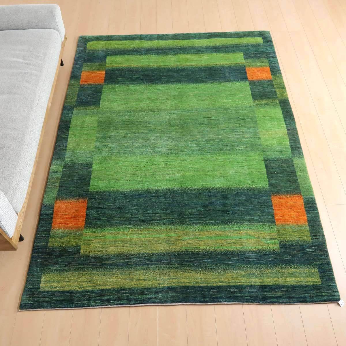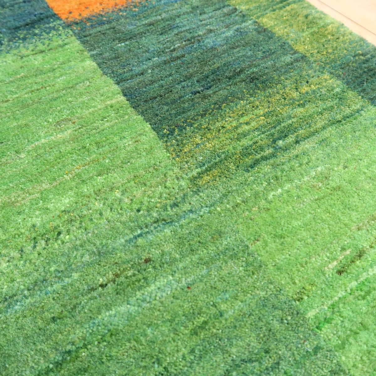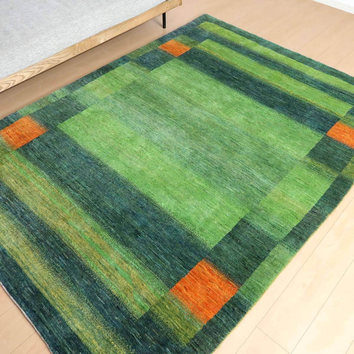 濃淡や色合いの異なる沢山のグリーンがボーダー柄に重なった草原のような草色のギャッベ。4つのオレンジの四角が印象的で、色のゆらぎが大変美しいシンプルモダンなデザインです。草木染の馴染むような落ち着いた色とギャッベ特有の手仕事の温かい風合いが感じられます。