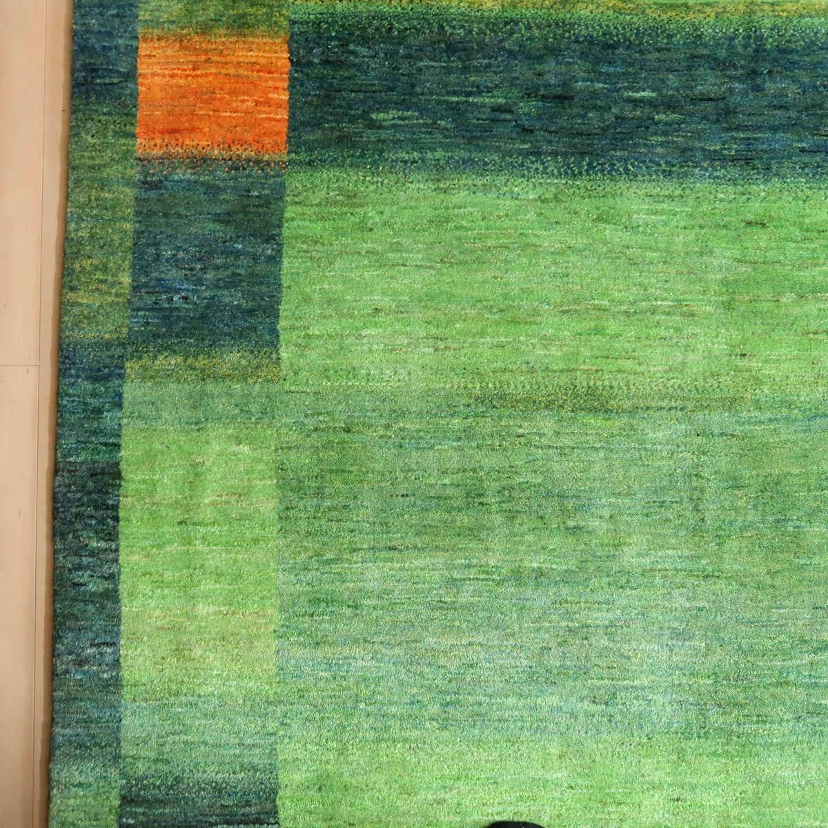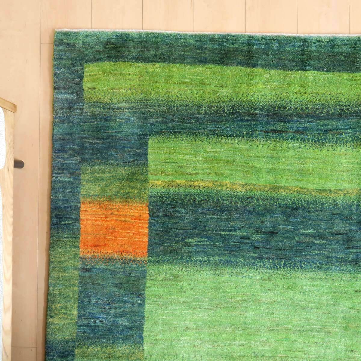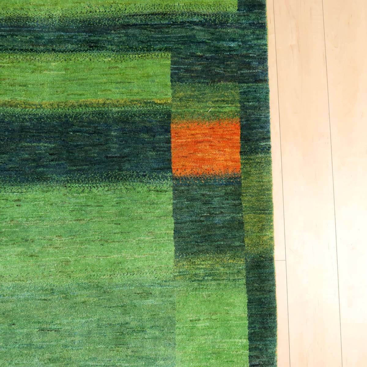 濃淡や色合いの異なる沢山のグリーンがボーダー柄に重なった草原のような草色のギャッベ。4つのオレンジの四角が印象的で、色のゆらぎが大変美しいシンプルモダンなデザインです。草木染の馴染むような落ち着いた色とギャッベ特有の手仕事の温かい風合いが感じられます。