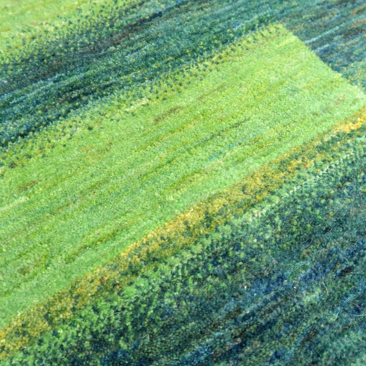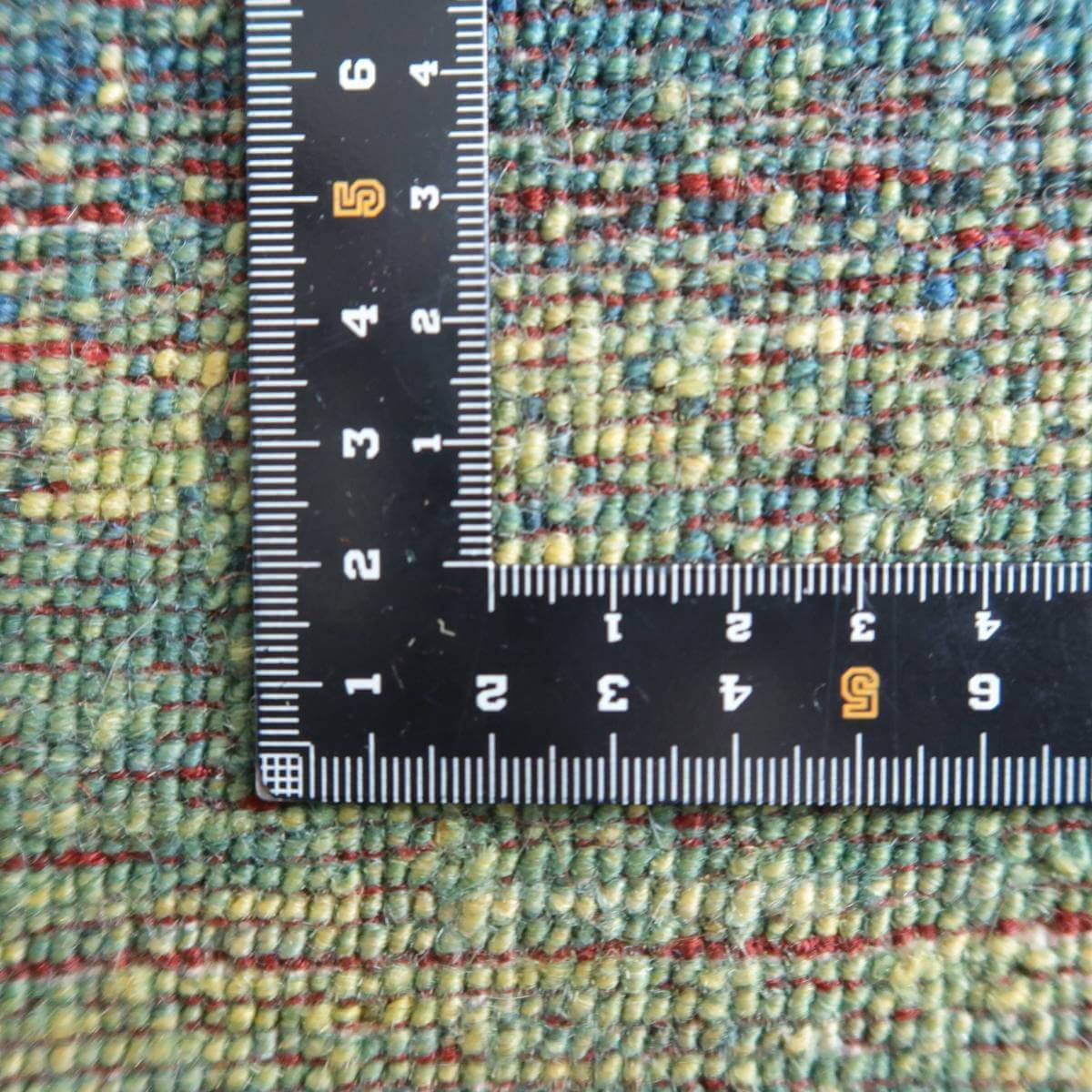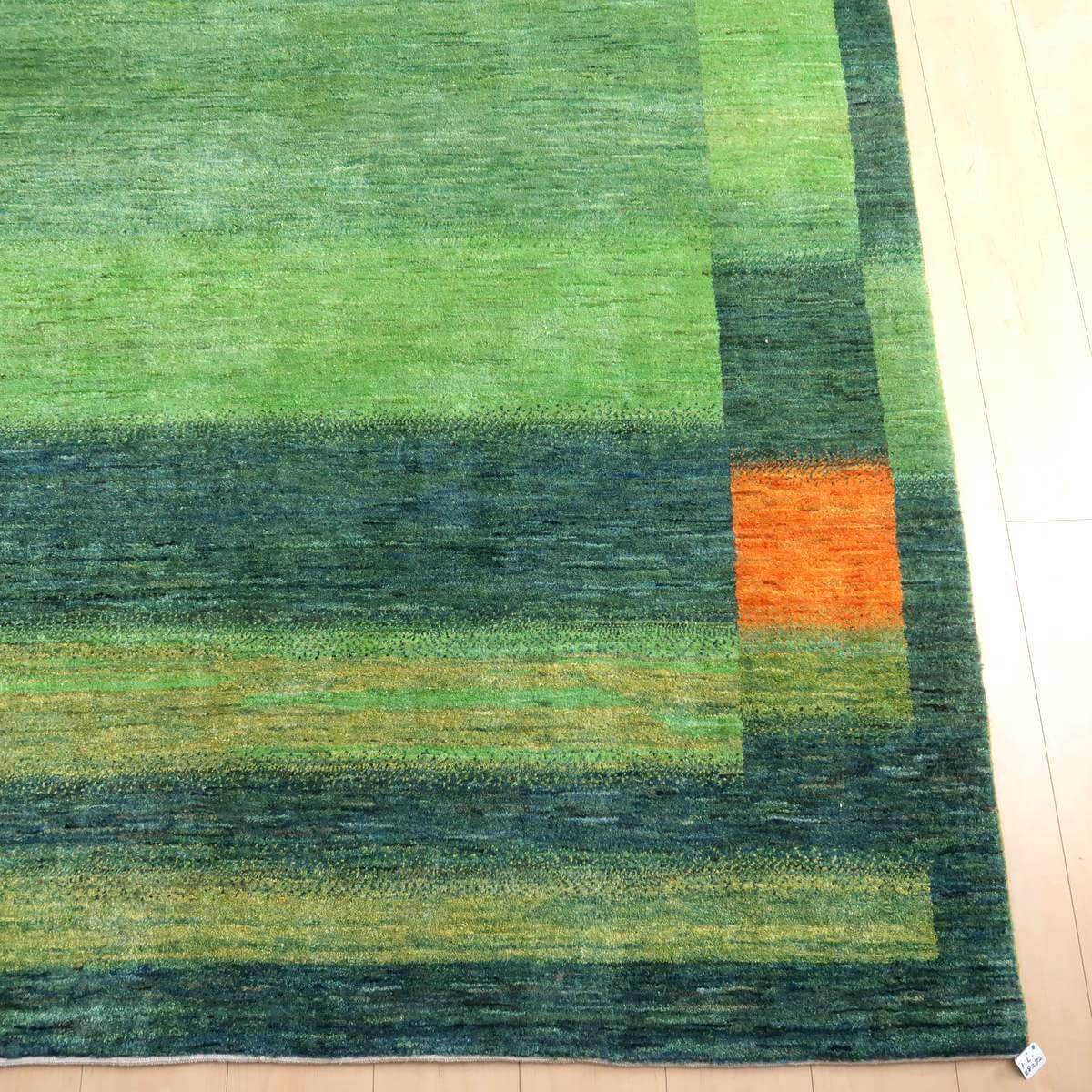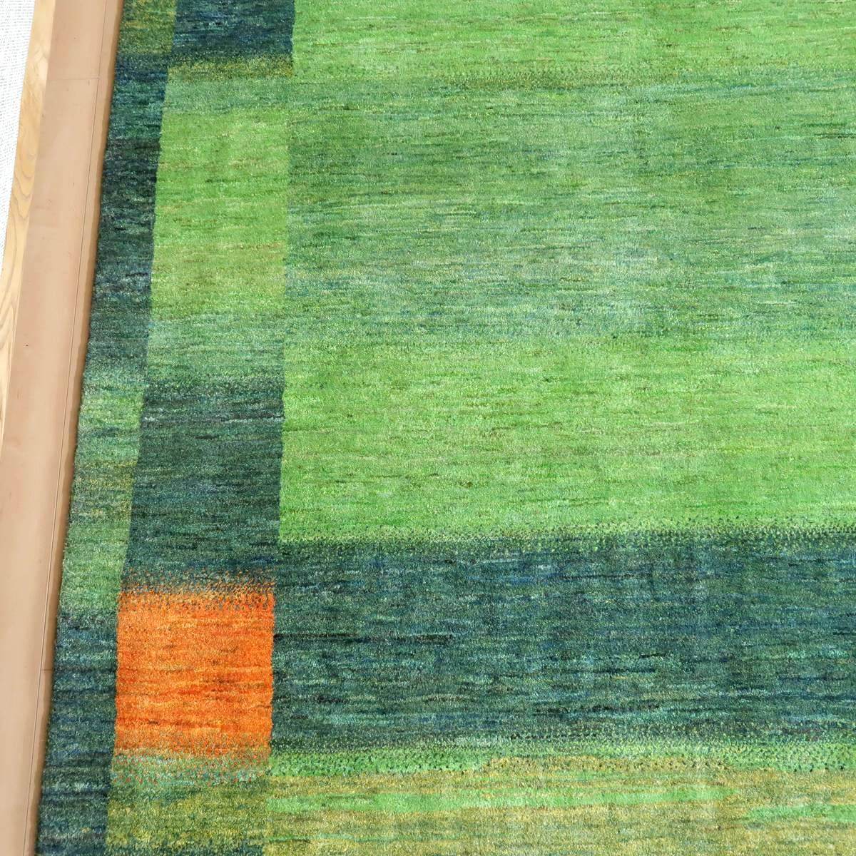 濃淡や色合いの異なる沢山のグリーンがボーダー柄に重なった草原のような草色のギャッベ。4つのオレンジの四角が印象的で、色のゆらぎが大変美しいシンプルモダンなデザインです。草木染の馴染むような落ち着いた色とギャッベ特有の手仕事の温かい風合いが感じられます。