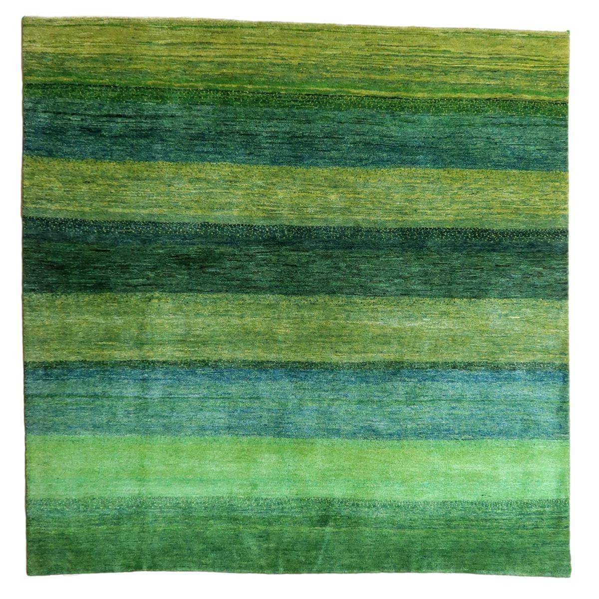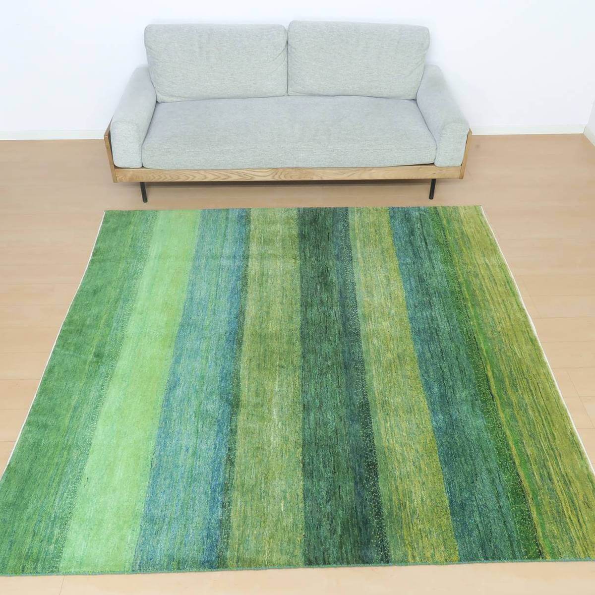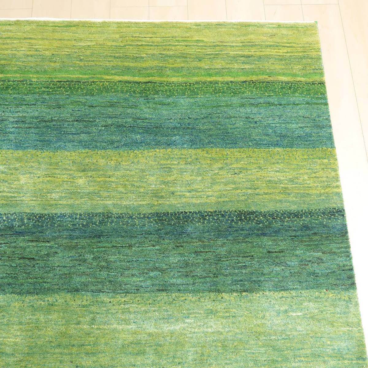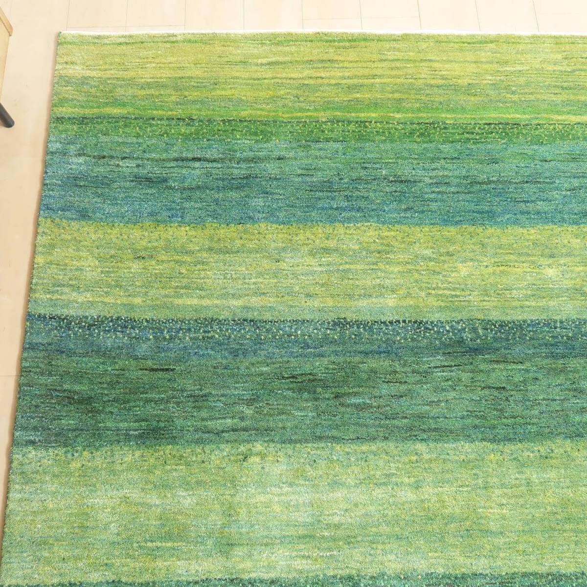 色合いの異なる様々なグリーンが重なった、広がりのある草原を連想させる草色のギャッベ。茶交じりのシックな雰囲気でグラデーションが大変美しい色のゆらぎを楽しむ品。