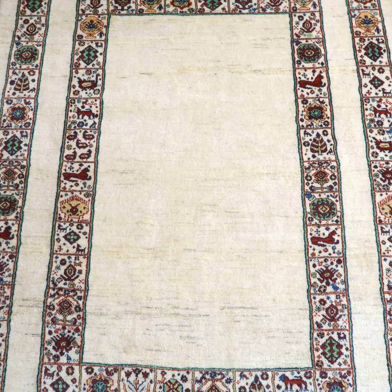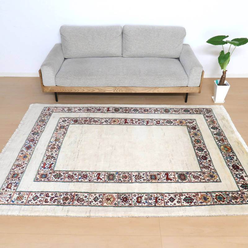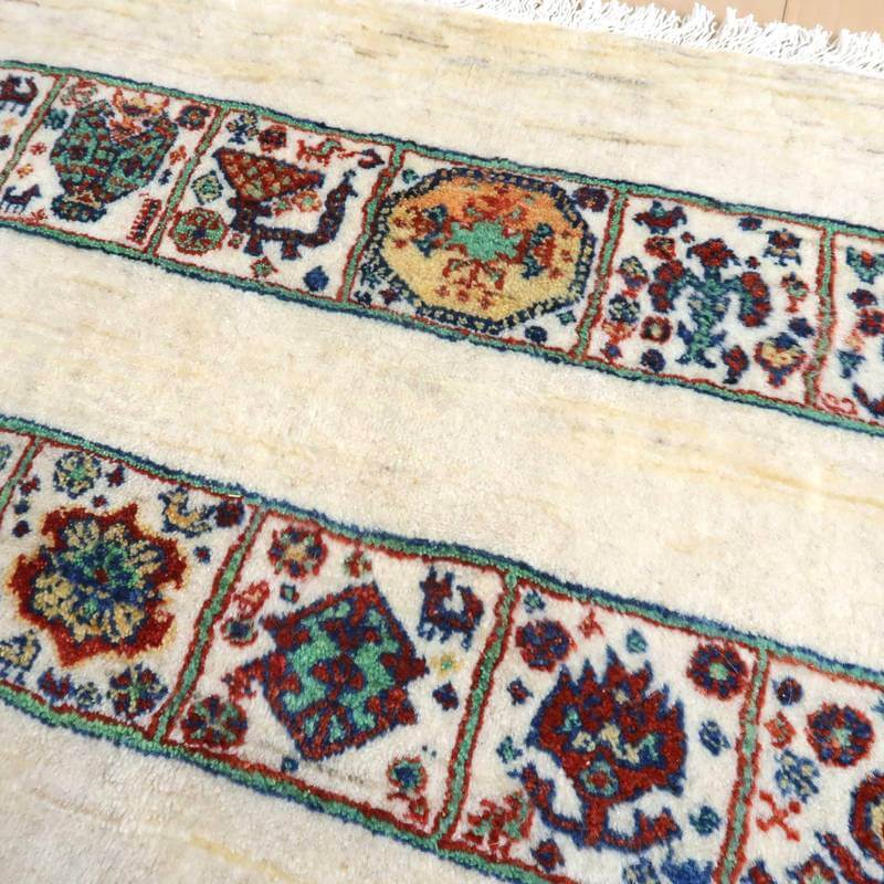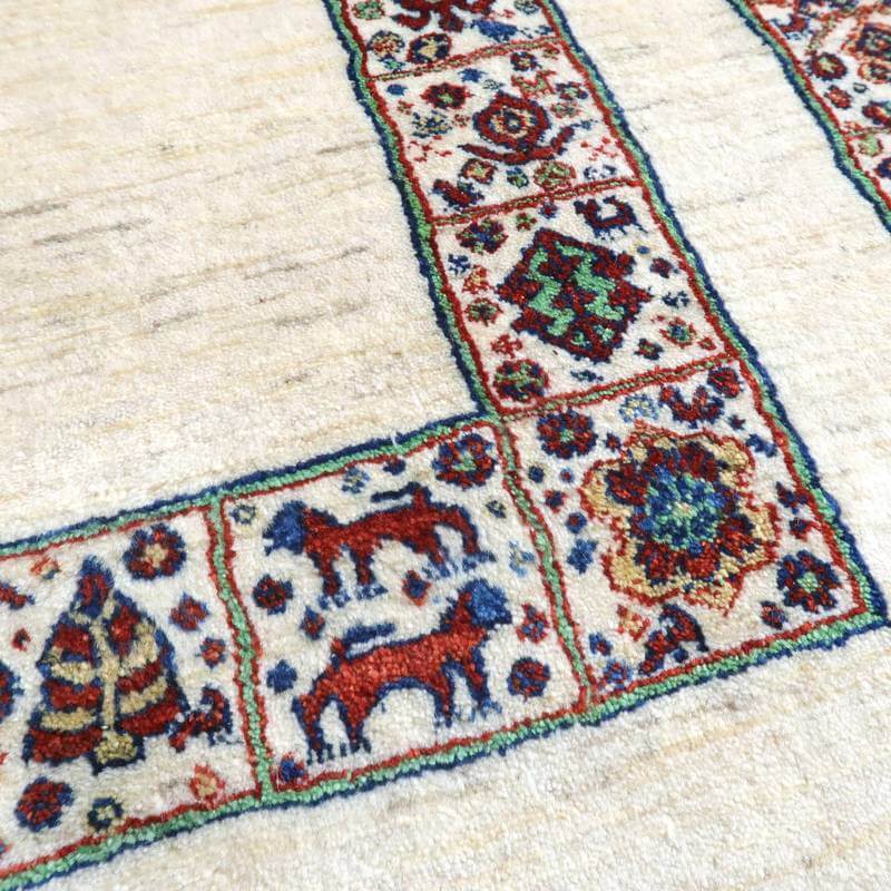 羊の毛色をそのまま活かした無染色の羊色のベースは、どんな場所にも似合うナチュラルな風合い。植物やユニークな動物柄の枠で二重に囲んだシンプルかつバランスの良いデザインです。