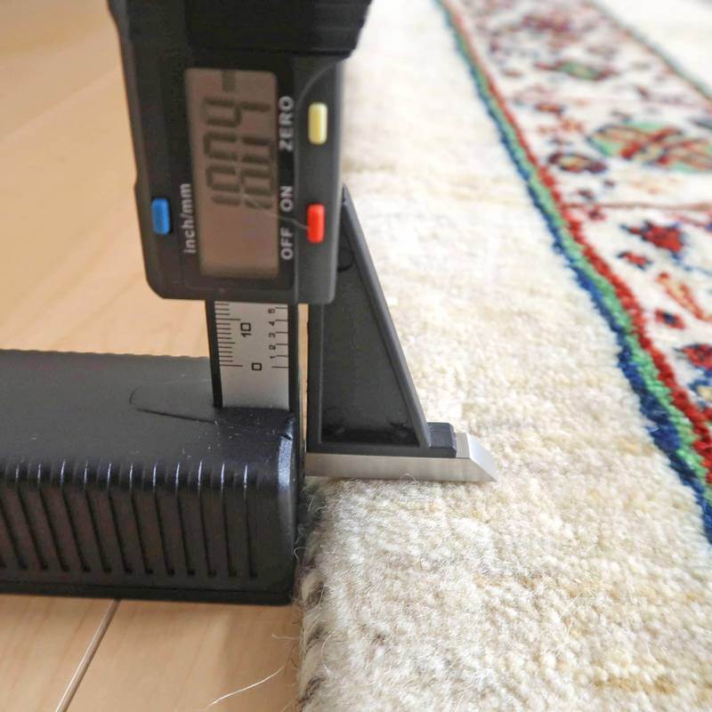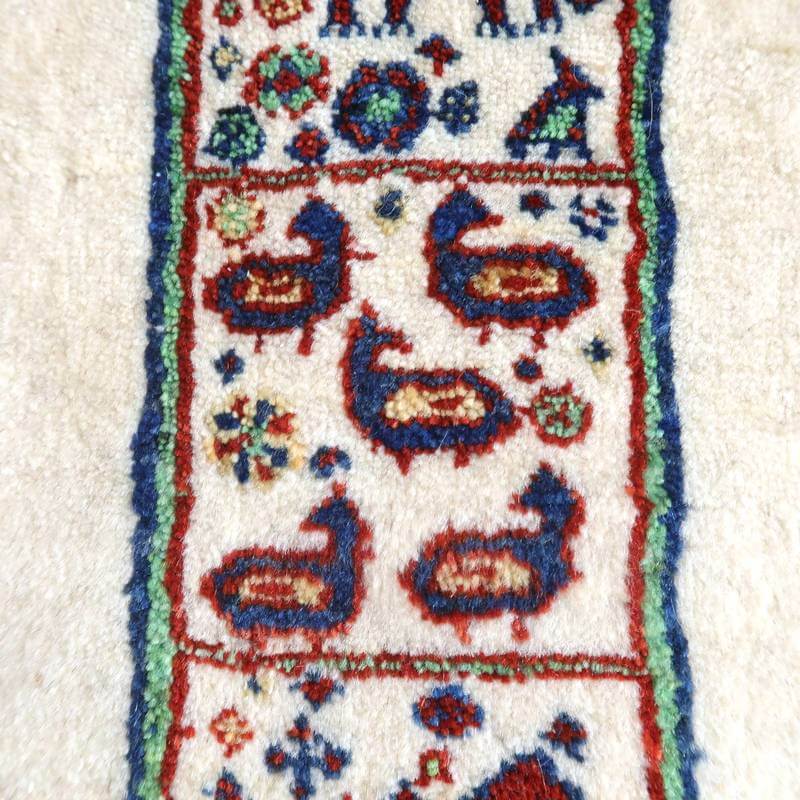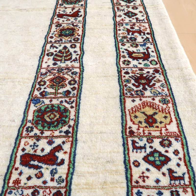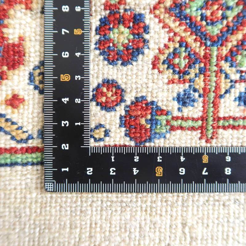 織りは、10cmあたり、およそ40から45目という普通のギャッベの数倍にもなる大変細かなルリバフ。抜け毛が少なく、手触りはふわりと柔らか。踏んだ時やんわりと沈み込む踏み心地です。腕の良い選りすぐられた織り子だけが手掛ける極上の手仕事です。