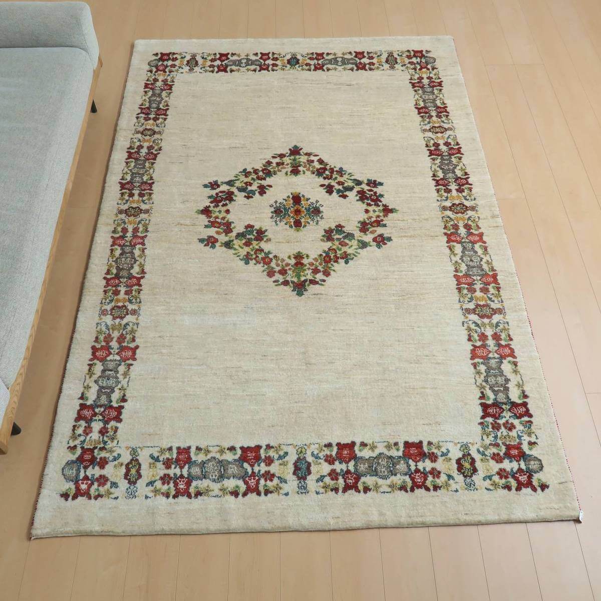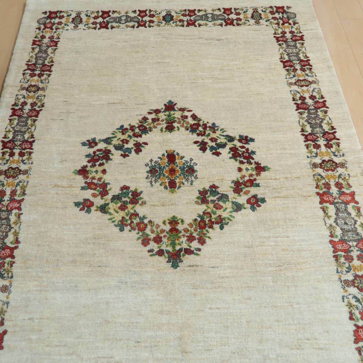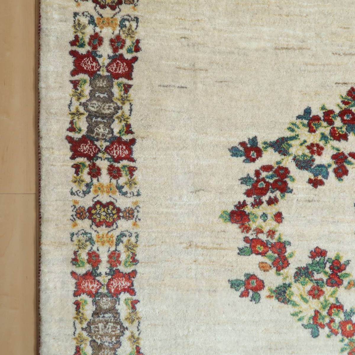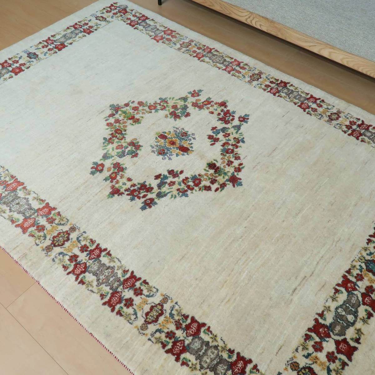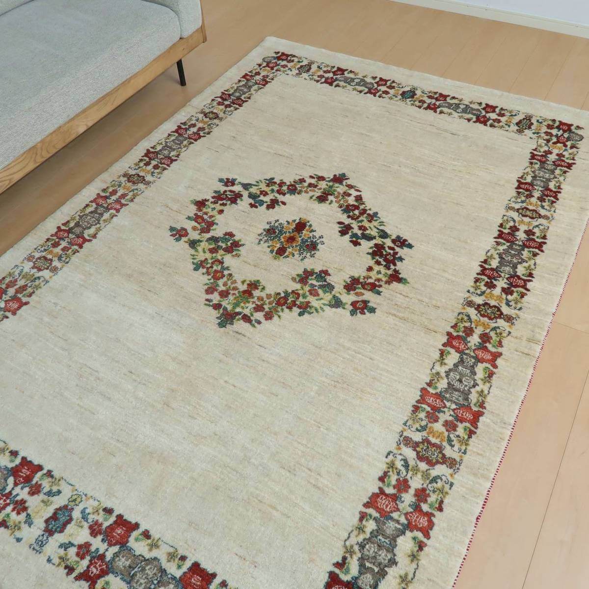 羊の毛色をそのまま活かした無染色の羊色のベースは、どんな場所にも似合うナチュラルな風合い。落ち着きのあるグリーンに赤・黄・オレンジの花が可愛らしく描き出された女性的なギャッベです。