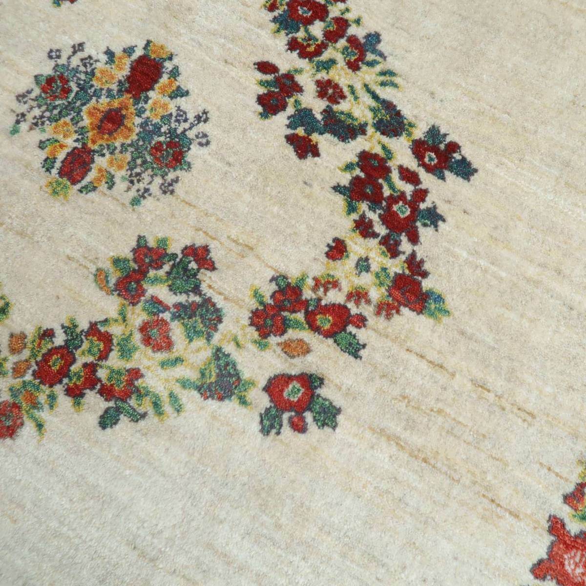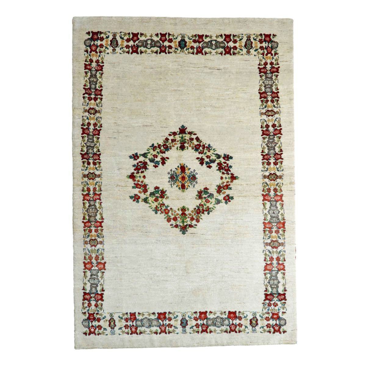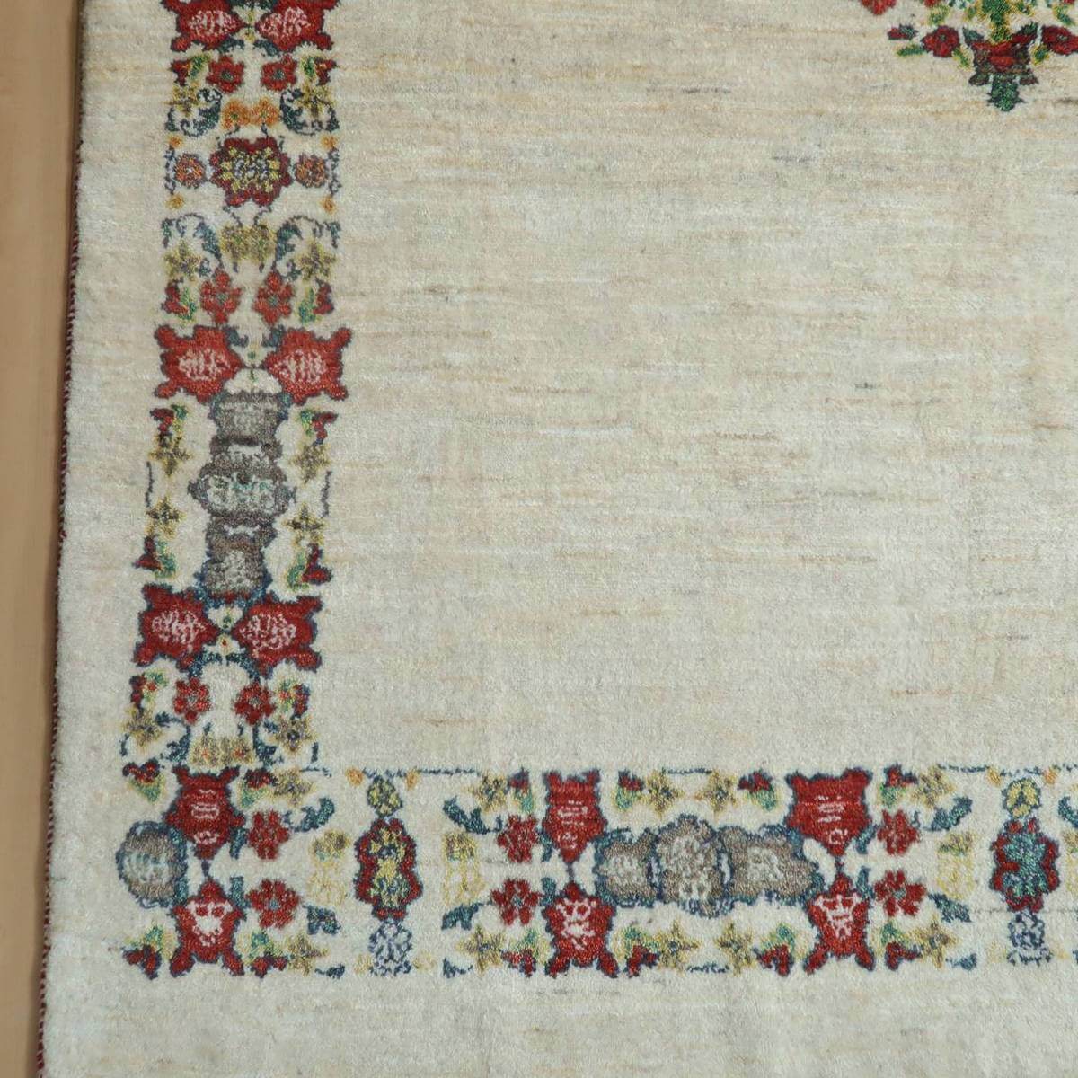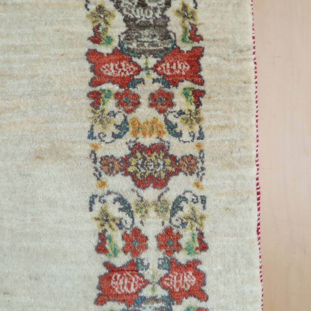 羊の毛色をそのまま活かした無染色の羊色のベースは、どんな場所にも似合うナチュラルな風合い。落ち着きのあるグリーンに赤・黄・オレンジの花が可愛らしく描き出された女性的なギャッベです。