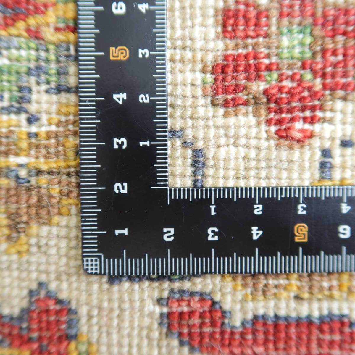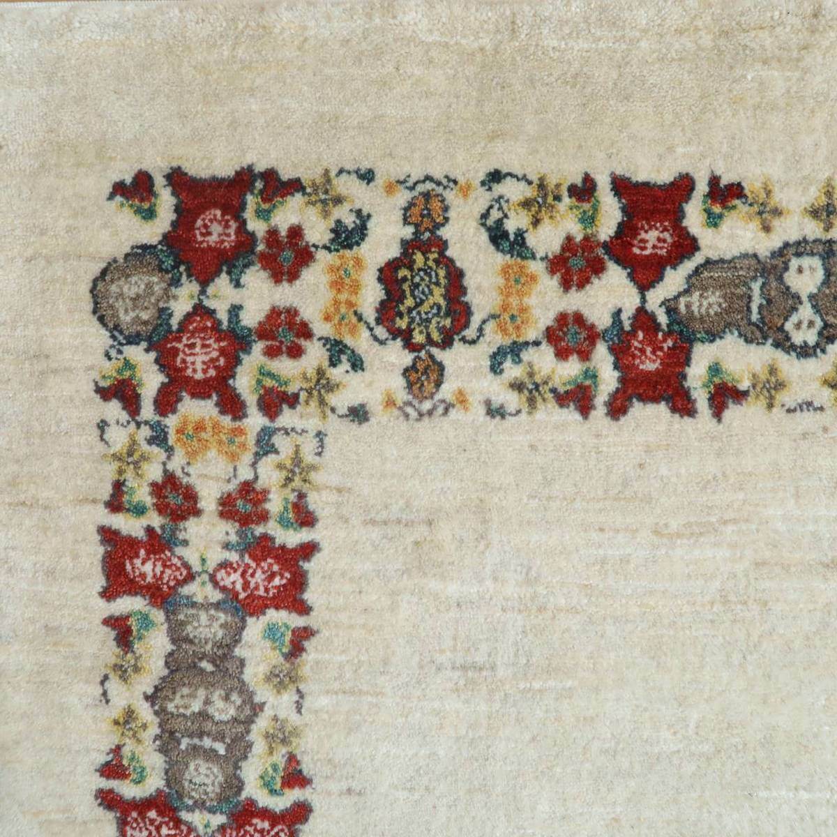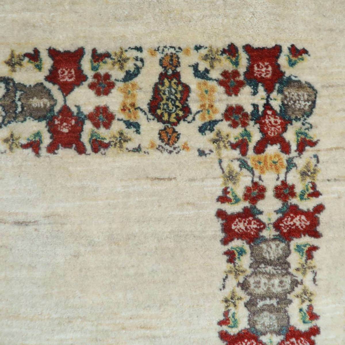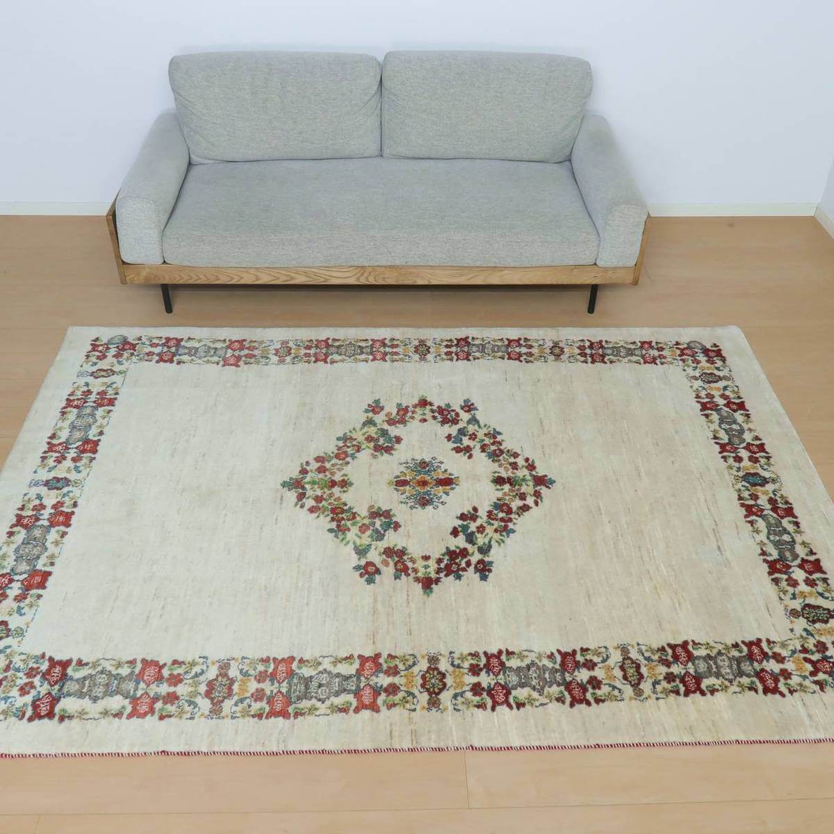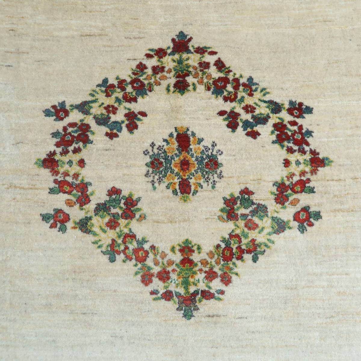 羊の毛色をそのまま活かした無染色の羊色のベースは、どんな場所にも似合うナチュラルな風合い。落ち着きのあるグリーンに赤・黄・オレンジの花が可愛らしく描き出された女性的なギャッベです。