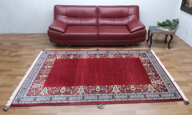 温かみのある明るい赤がベース、濃淡のグラデーションが細かく重なり合って美しい色の変化となっています。花壇のように周りを囲んだデザインは華やかな雰囲気。大きなサイズなので目立ちませんが、上端で156センチ、下端で159センチと横幅に手織りならではの差異があります。
