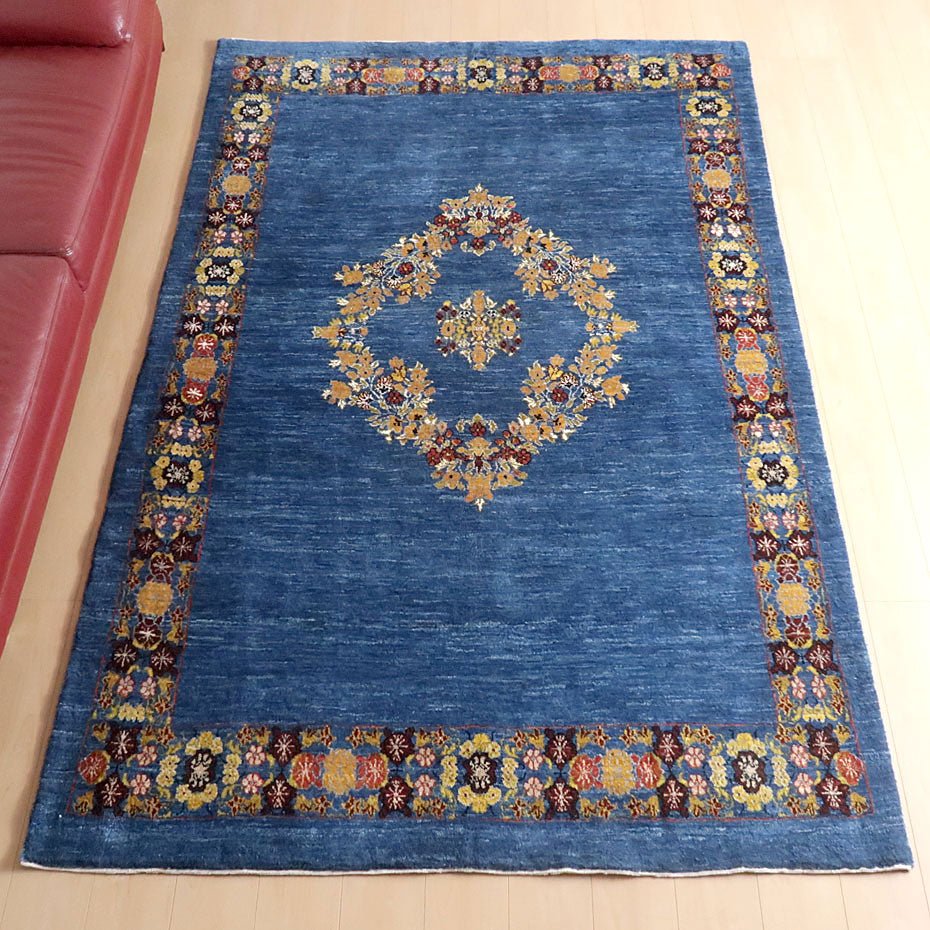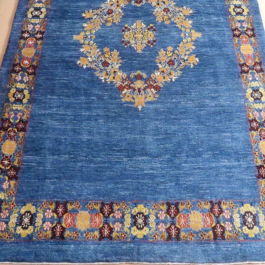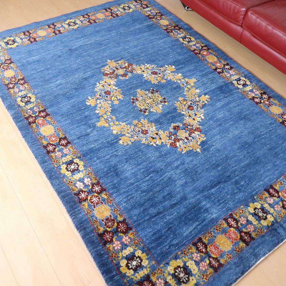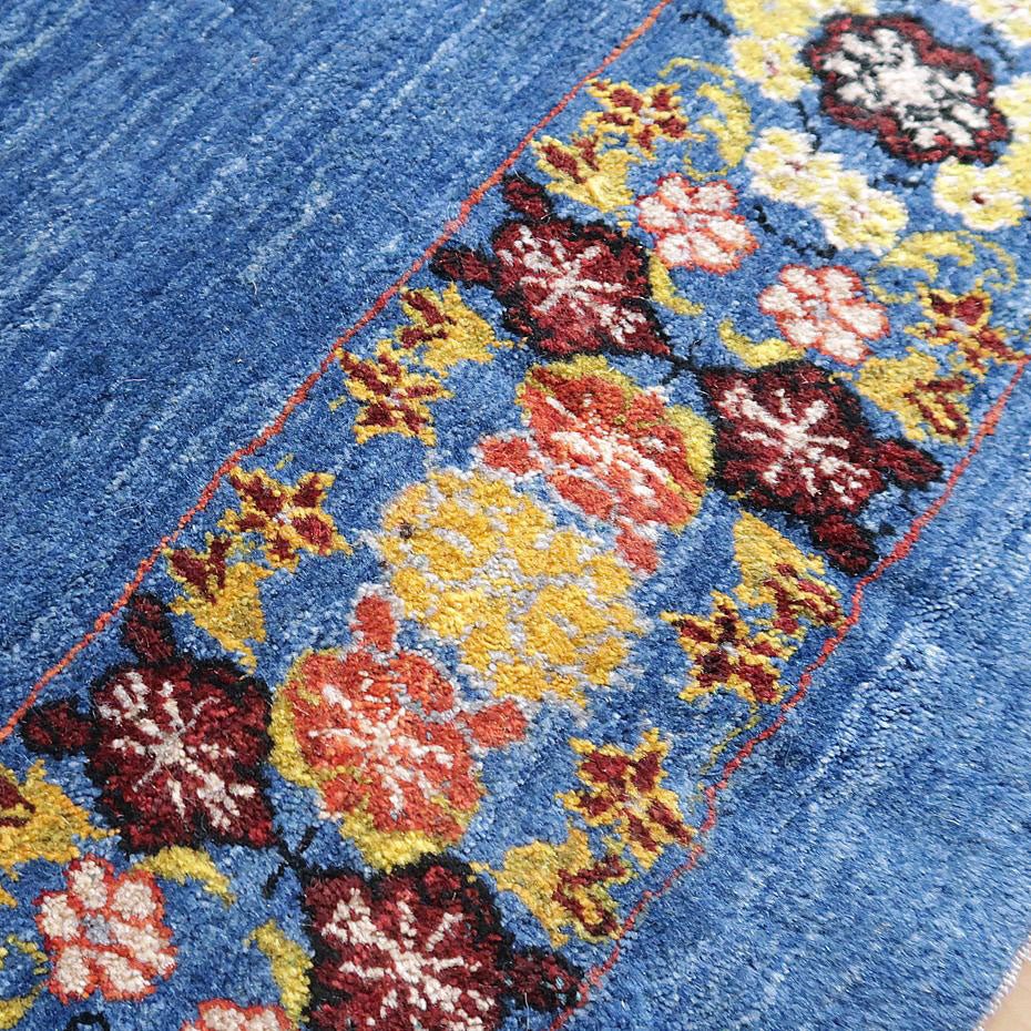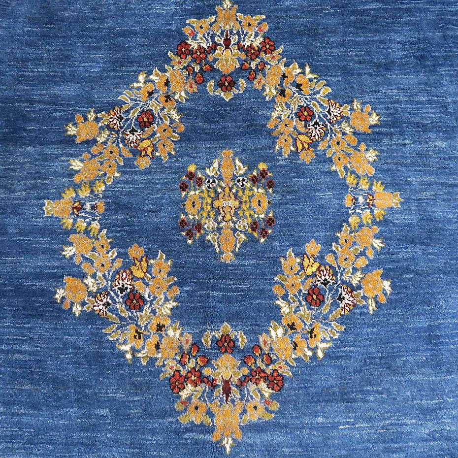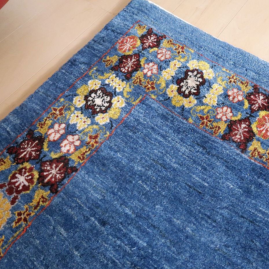 濃淡の微妙に違う何種類ものブルーが細かく重なった、アブラシ(色むらのグラデーション)の色の揺らぎが大変美しい、爽やかな冴えた青のギャッベ。細かくデザインされた花の文様が周囲とセンターにバランスよく配された上品・上質な一枚です。