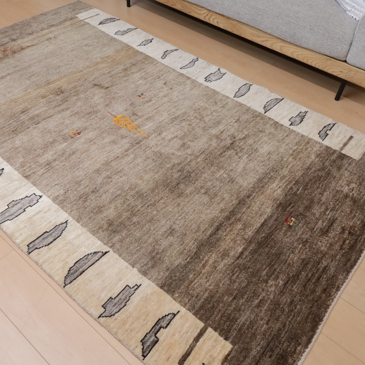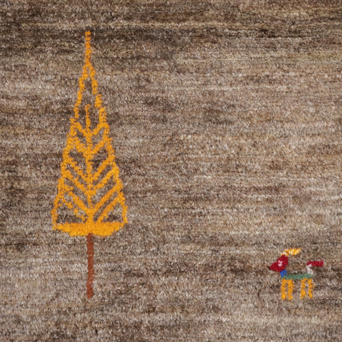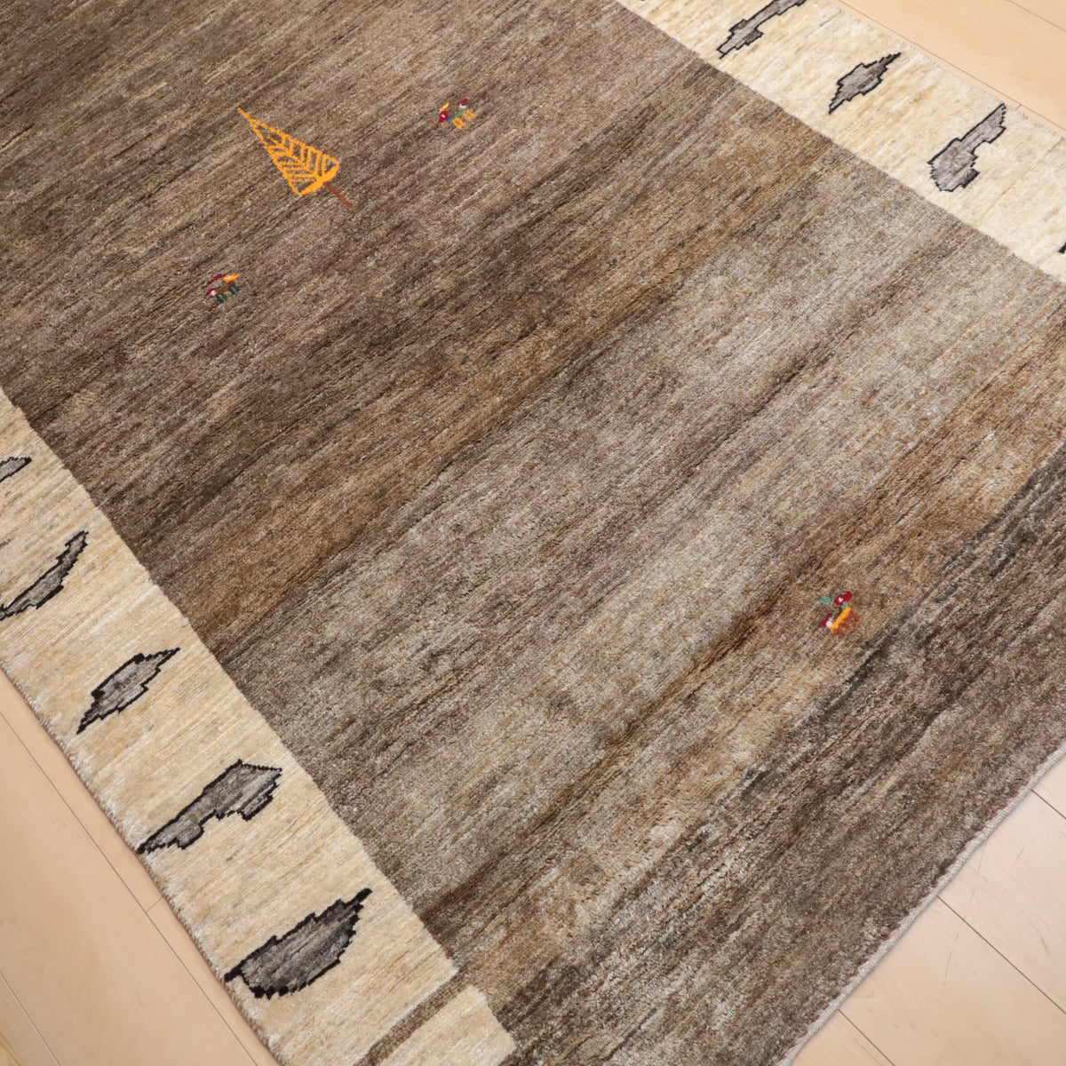 羊の毛色を活かした無染色の糸を使用して、ナチュラルな雰囲気がより大きく感じられます。ベージュの細かなグラデーションが美しい色のゆらぎとなったモダンなアートデザイン。中央に黄金の生命の木が入った可愛らしい図柄です。厚みは15、16ミリ程度、高密度でさらりとした踏み心地、艶めき感のあるウール素材です。