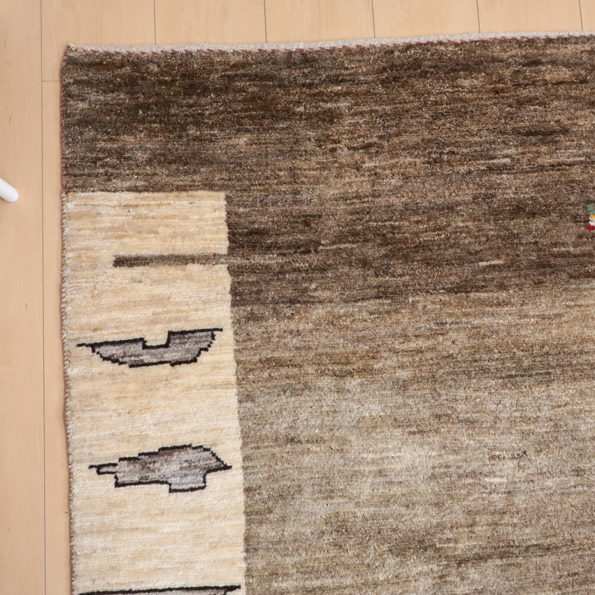 照明の違いで色合いが多少違って見えます。また、ギャッベは毛足に向きがあるので、見る方向で、明るかったり暗かったりも見えます。
